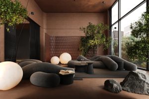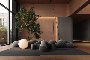 🎨 大地色系的温暖拥抱:棕色墙面与地面,搭配深灰家具,色调沉稳又不失温度。没有过多的色彩堆砌,却用质感征服眼球。球形灯的柔和光线,让空间更显温馨,即使是商务空间也能充满家的舒适。