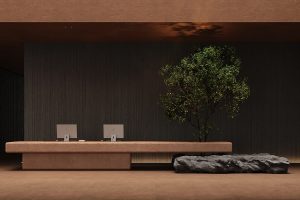 💼 前台:简约而不失格调:超长的混凝土质感前台,搭配简洁的办公设备,一旁的岩石与绿植,既彰显企业的稳重,又透露出对细节的考究。这样的前台,让客户一进门就感受到企业的独特品味。