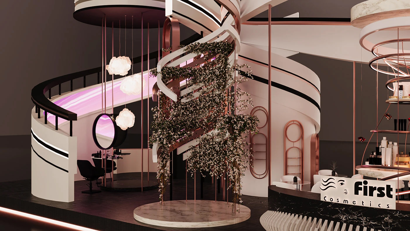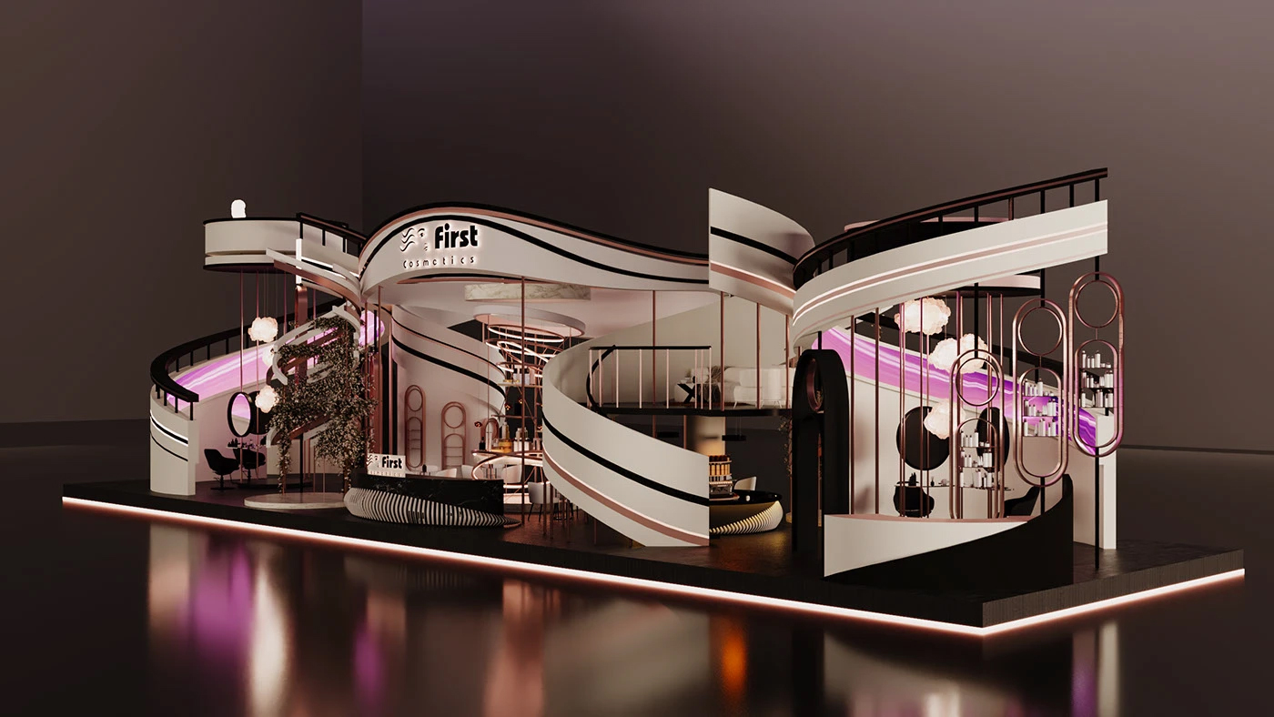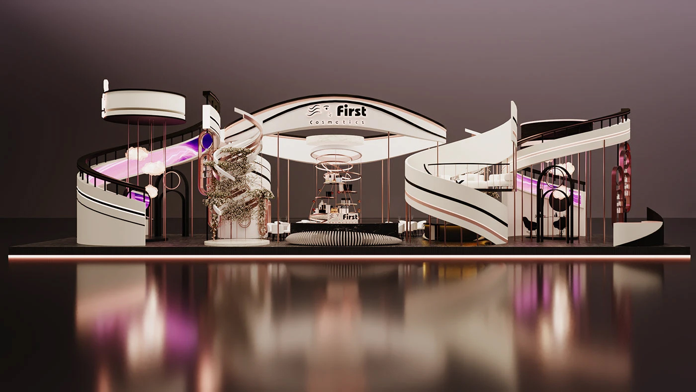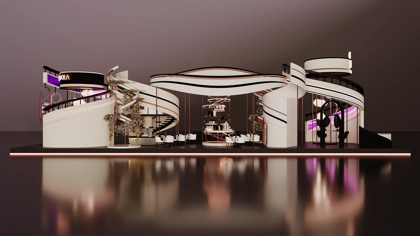 • 曲线美学: 满屏的流畅曲线,从螺旋楼梯到弧形展台,像美妆产品一样丝滑💄 打破刻板直线条,把 “流动感” 玩明白了,逛展像在走时尚 T 台~