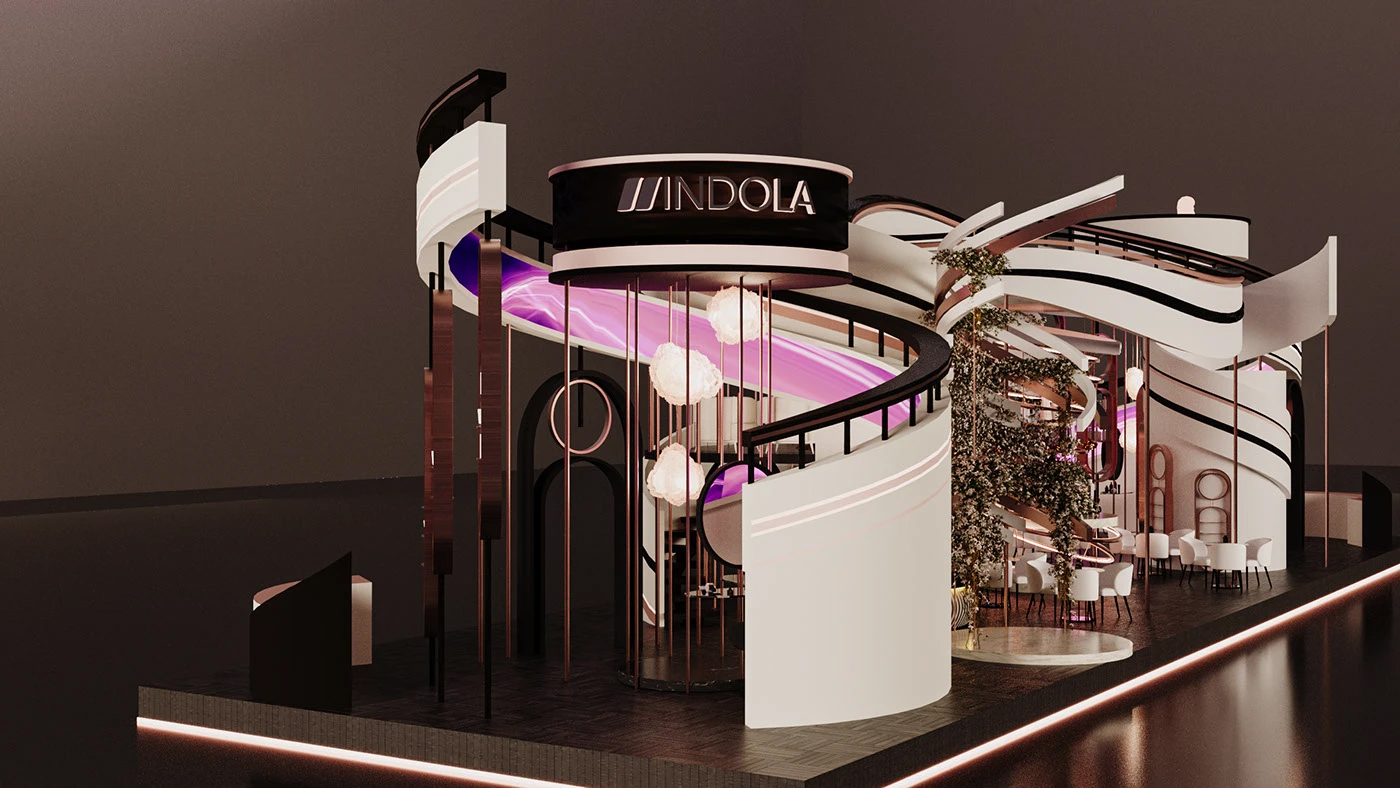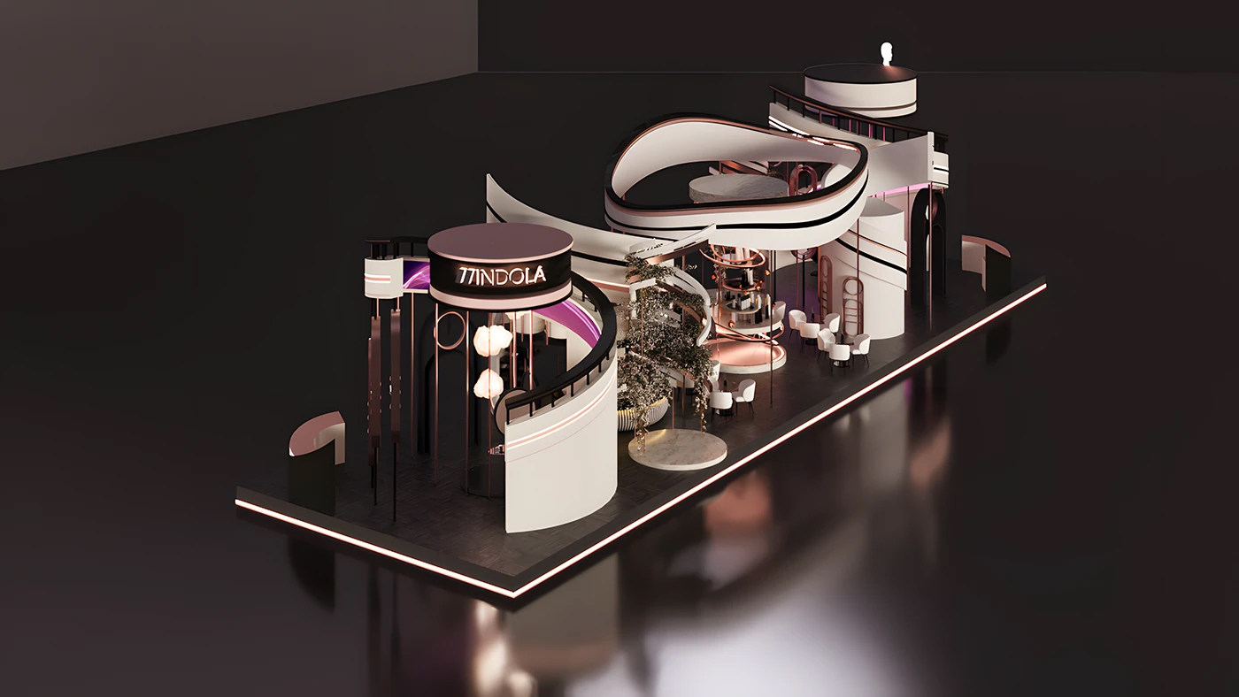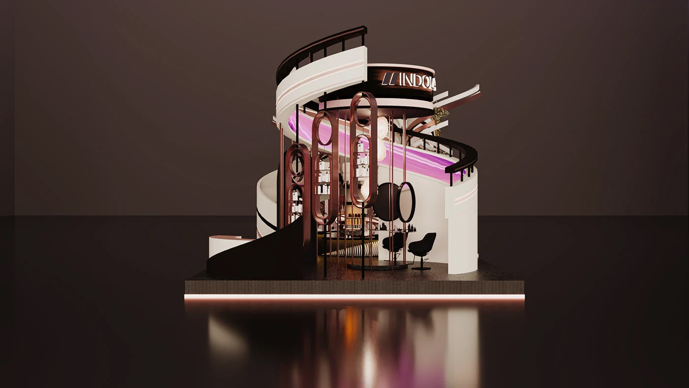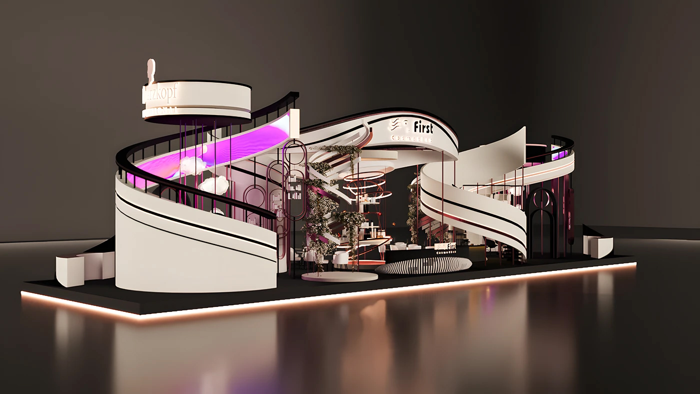 • 曲线美学: 满屏的流畅曲线,从螺旋楼梯到弧形展台,像美妆产品一样丝滑💄 打破刻板直线条,把 “流动感” 玩明白了,逛展像在走时尚 T 台~