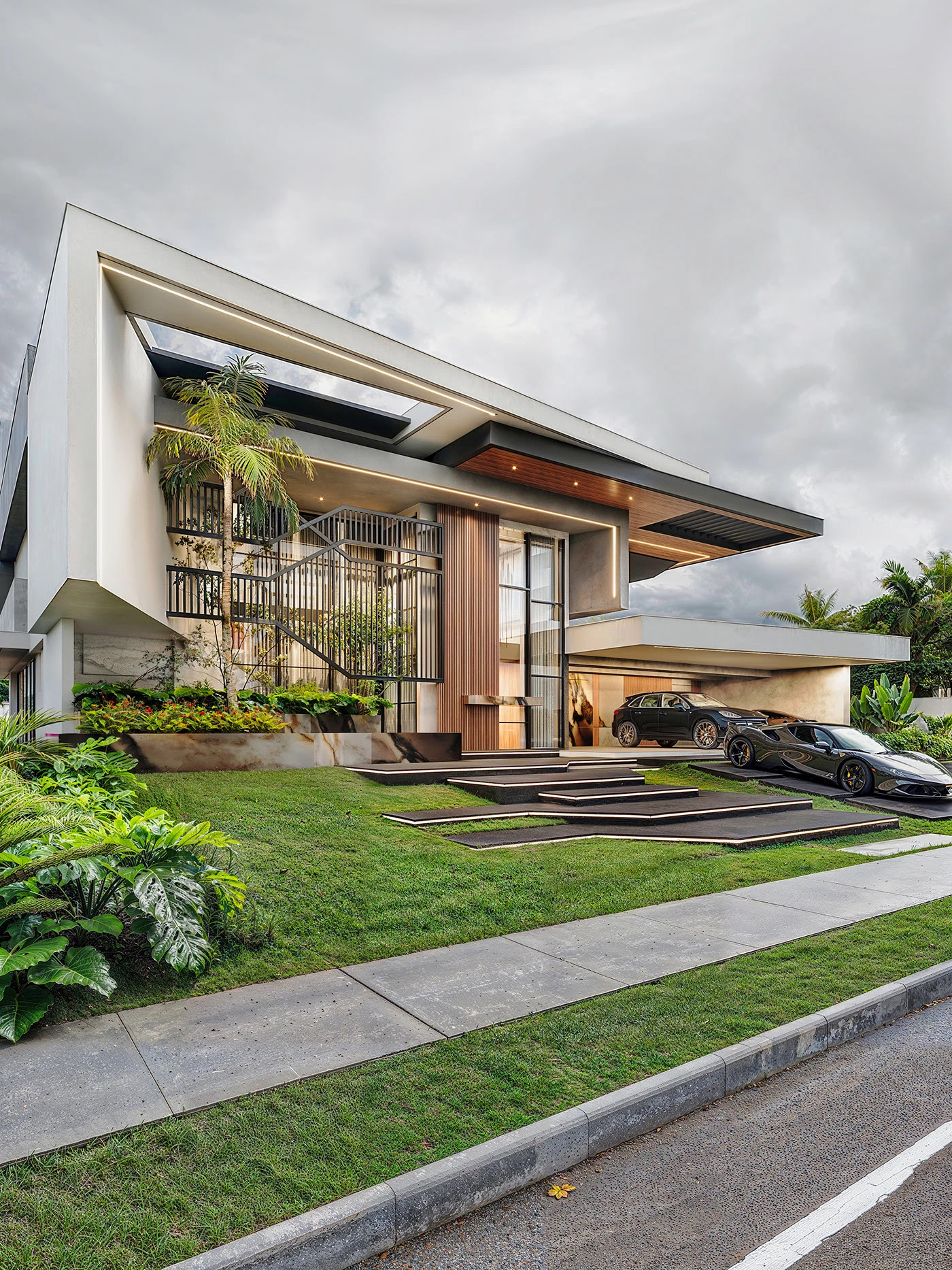 - 几何线条:斜顶、悬浮挑檐、利落的体块切割,把建筑变成「立体艺术装置」;