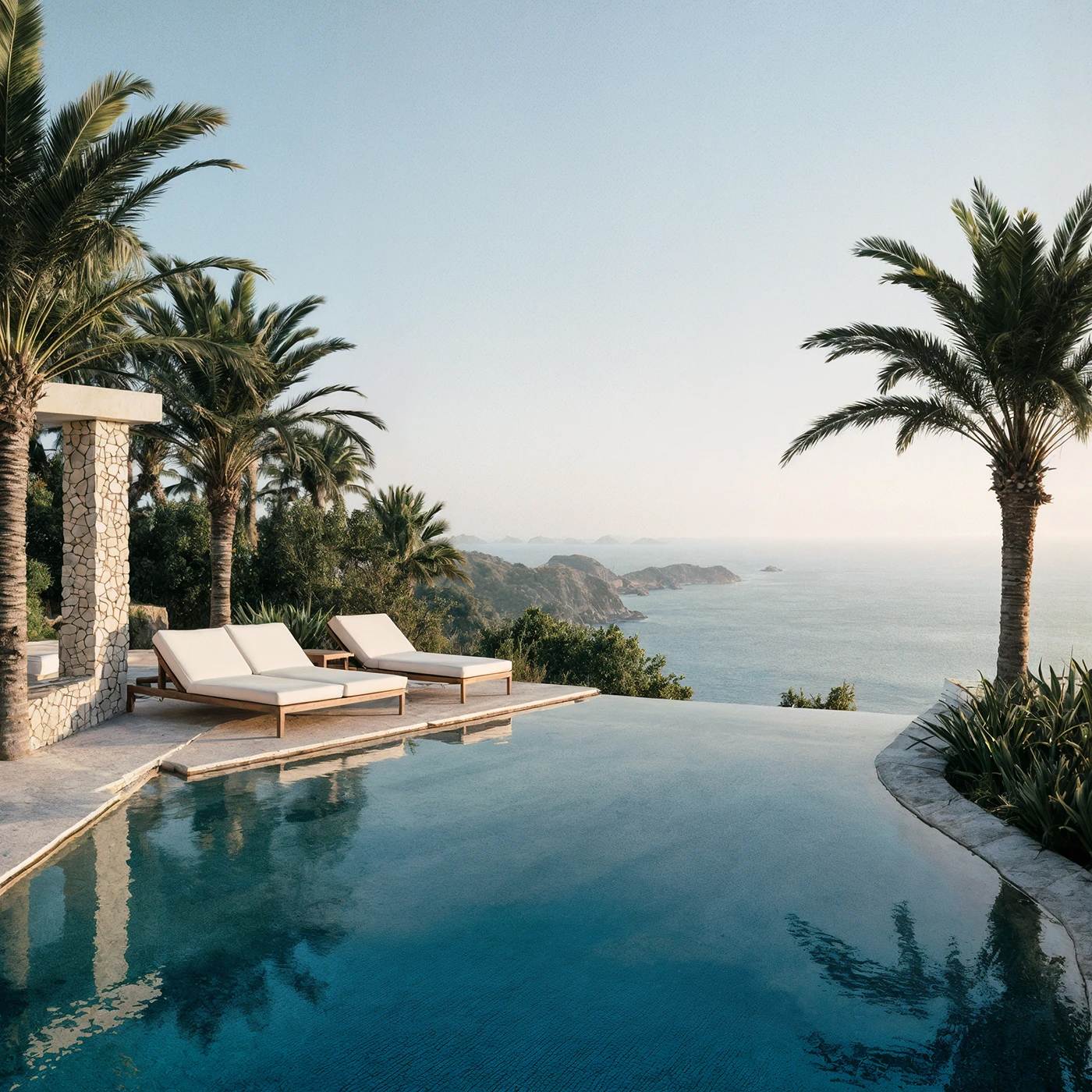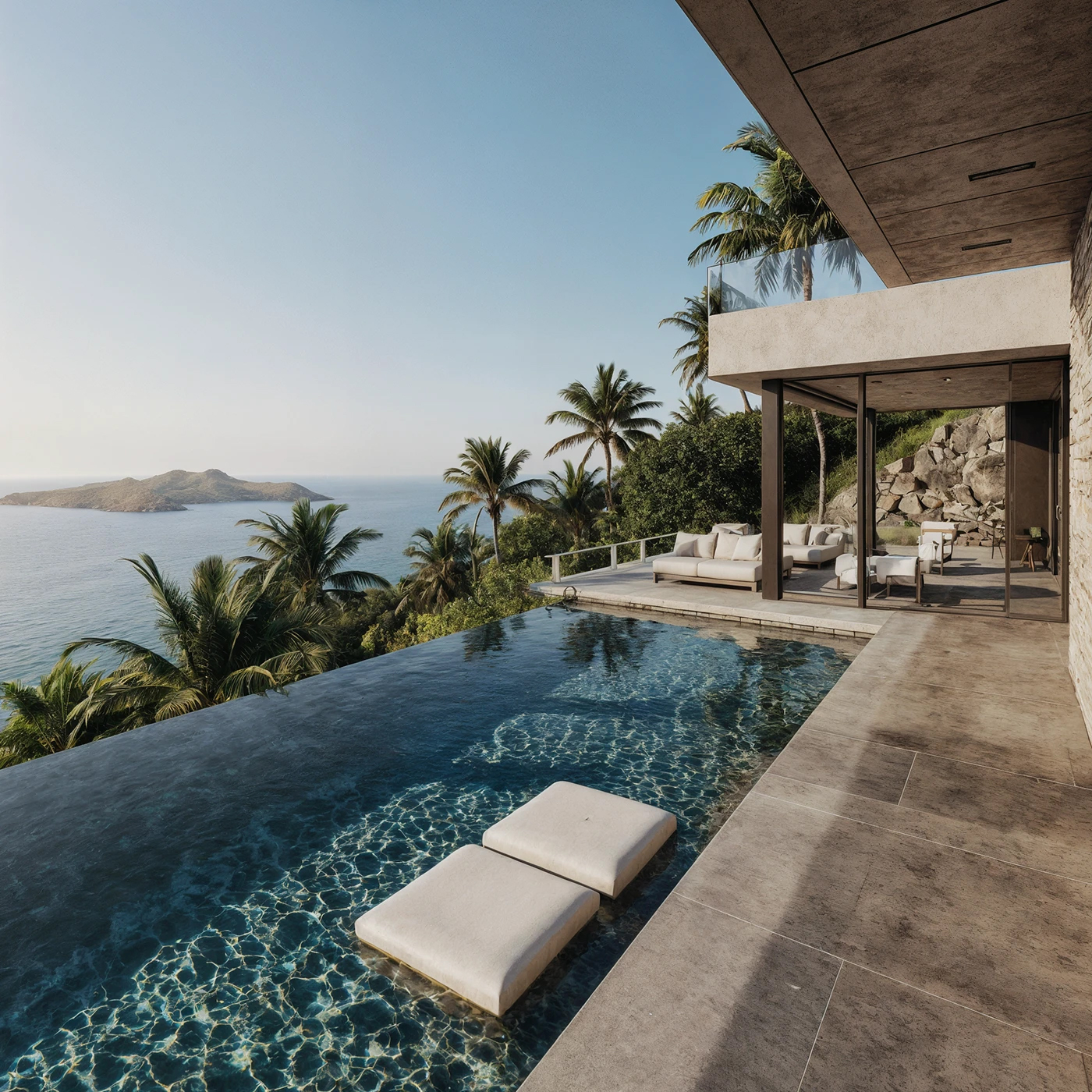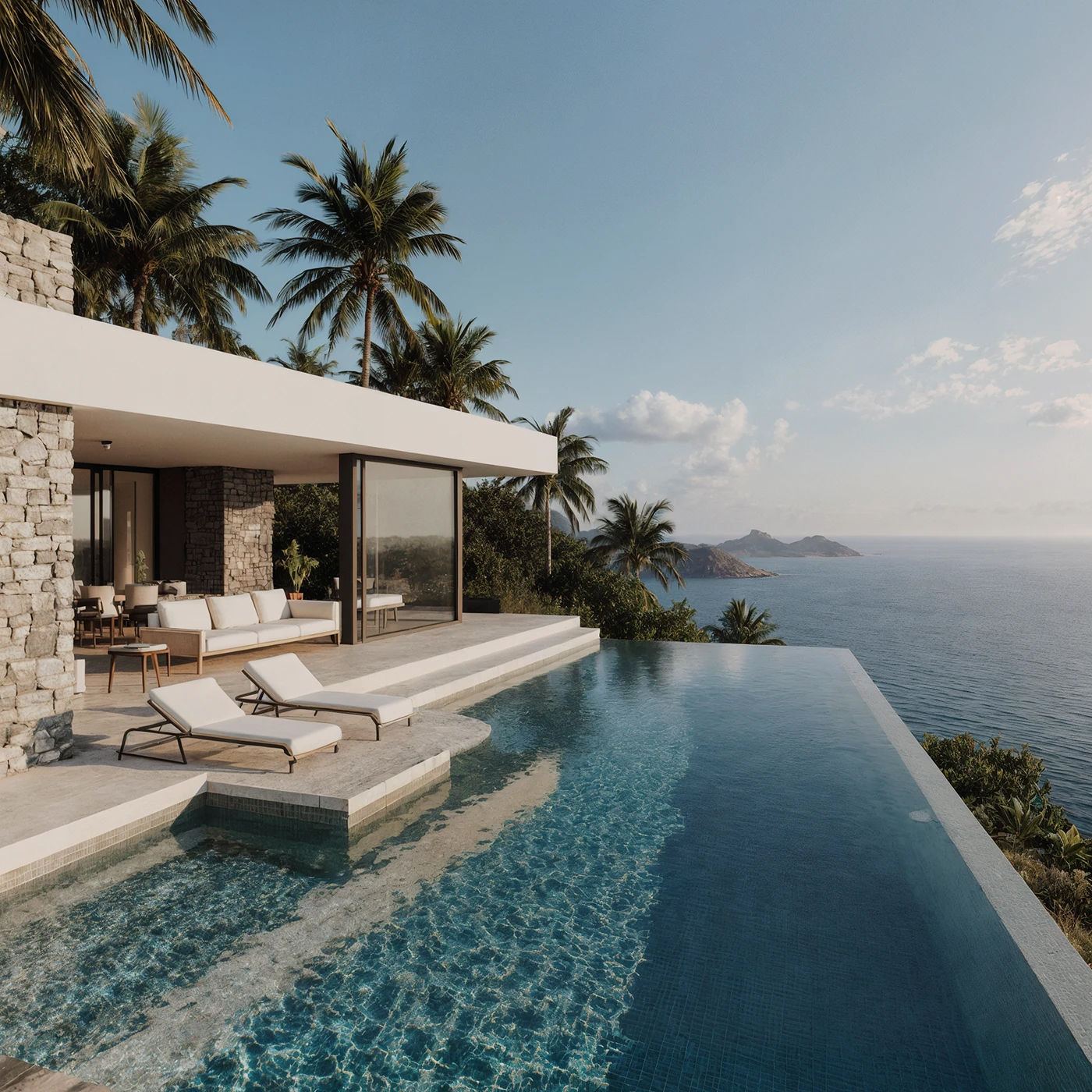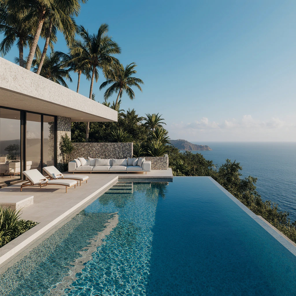 • 海景融入: 无边泳池、大落地窗、开放式露台… 把整片大海 “框” 进家里🌊 游完泳一抬头就是海平面,主打一个 “沉浸式看海”!