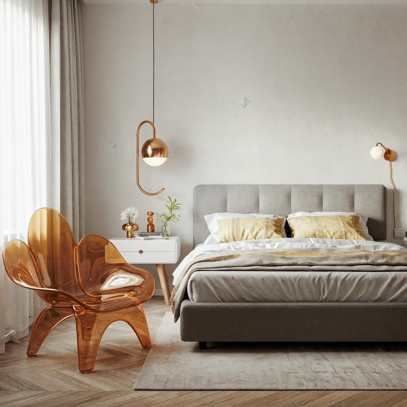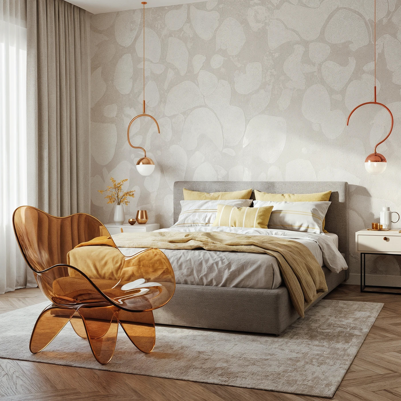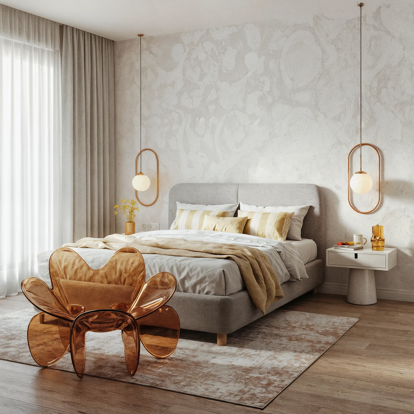 - 材质碰撞: 微水泥的冷硬 + 亚麻床品的柔软 + 花瓣椅的通透,三种材质混搭出层次感,光脚踩在地毯都像在做足底 spa~