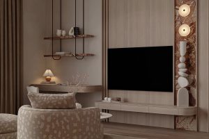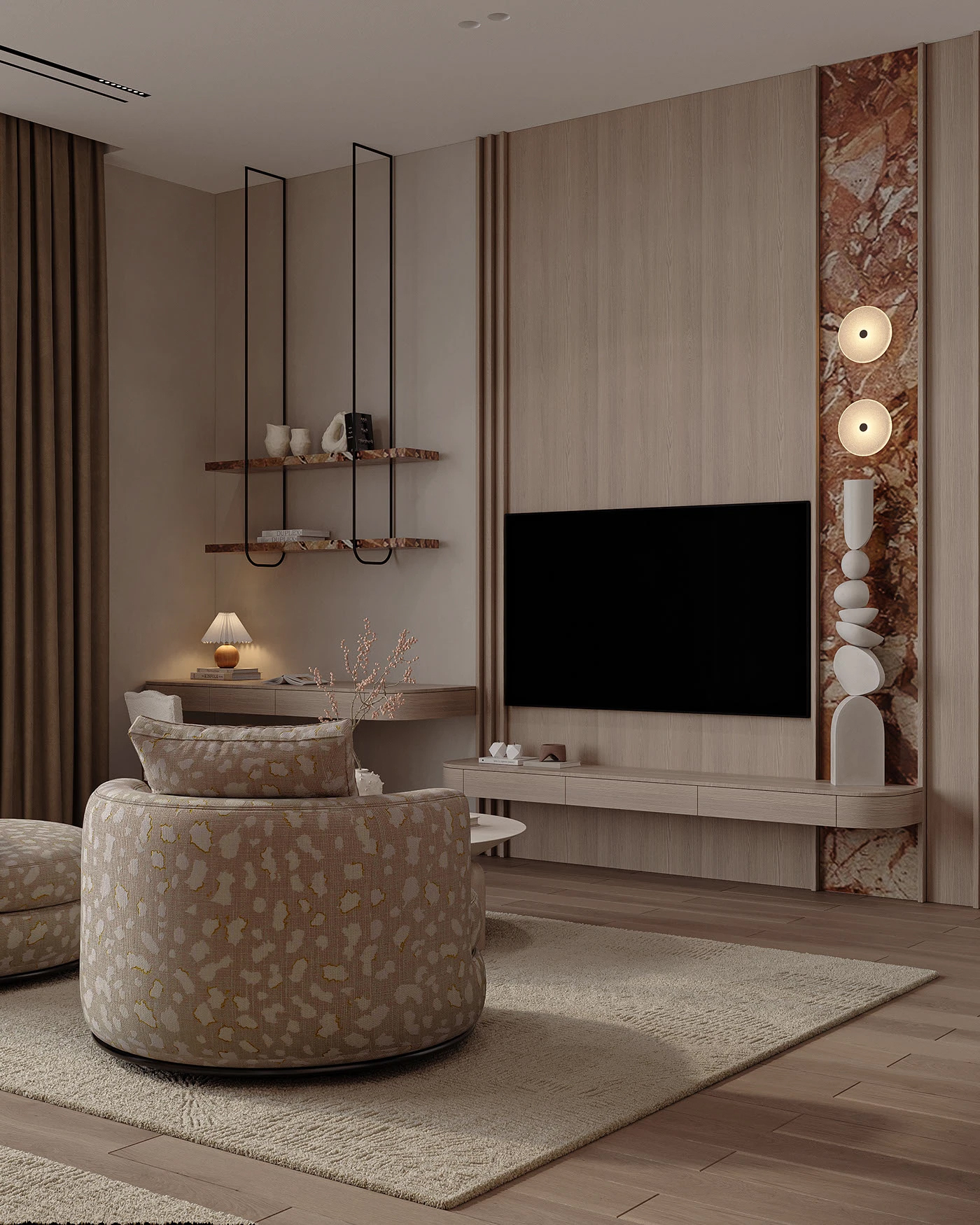 - 家具巧思: 弧形沙发、花瓣椅、悬浮边几… 圆润线条柔化空间,小户型也能装出 “空旷感”,简直是空间魔法!