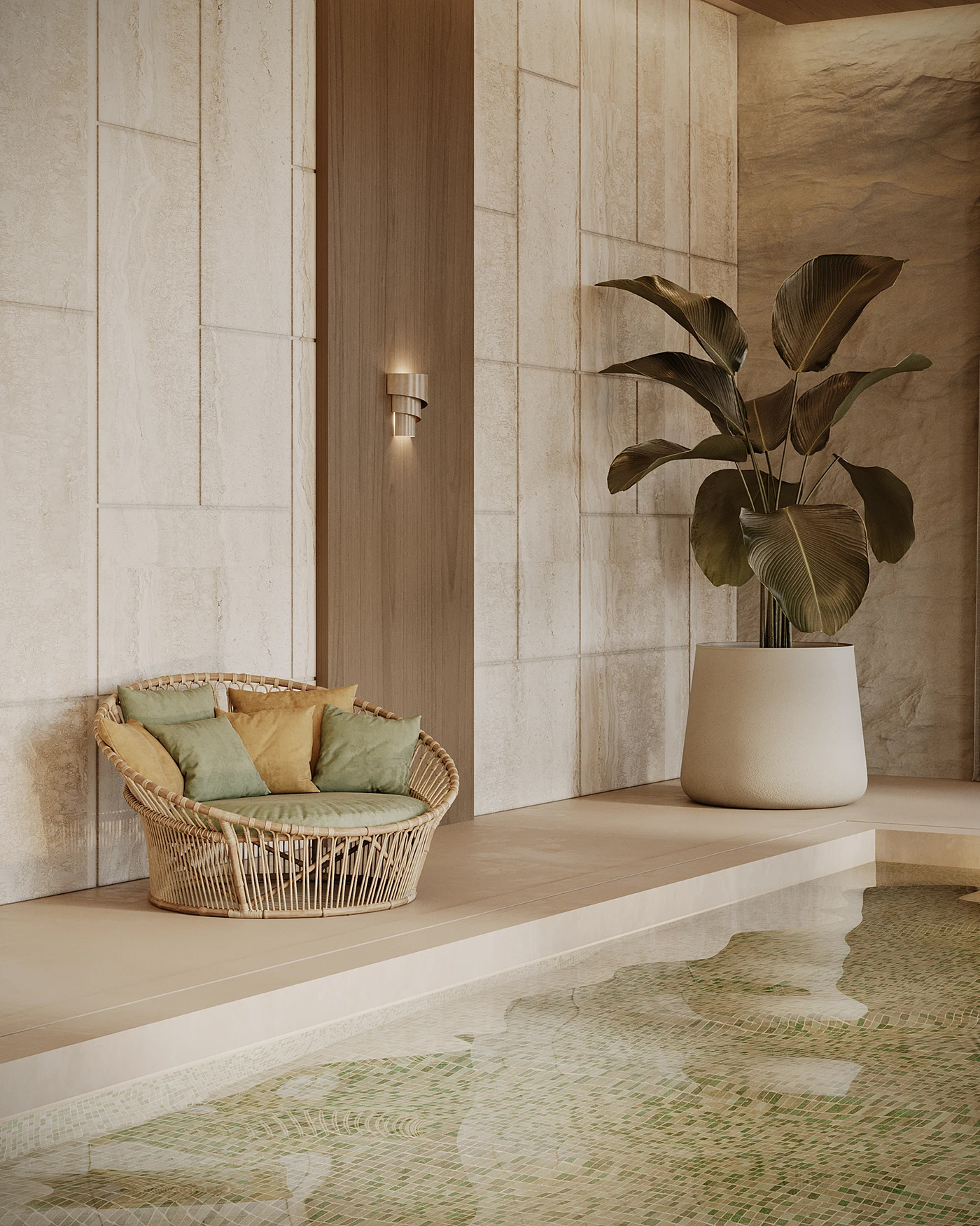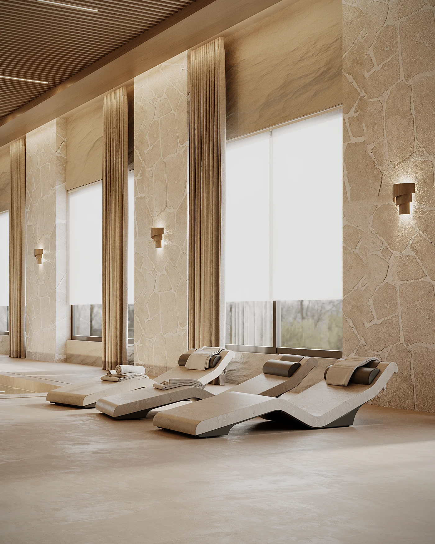 - 材质心机: 微水泥的粗糙 + 亚麻躺椅的柔软 + 石材墙面的自然,三种材质混搭出层次感,光脚踩在地面都像在做足底 spa~
