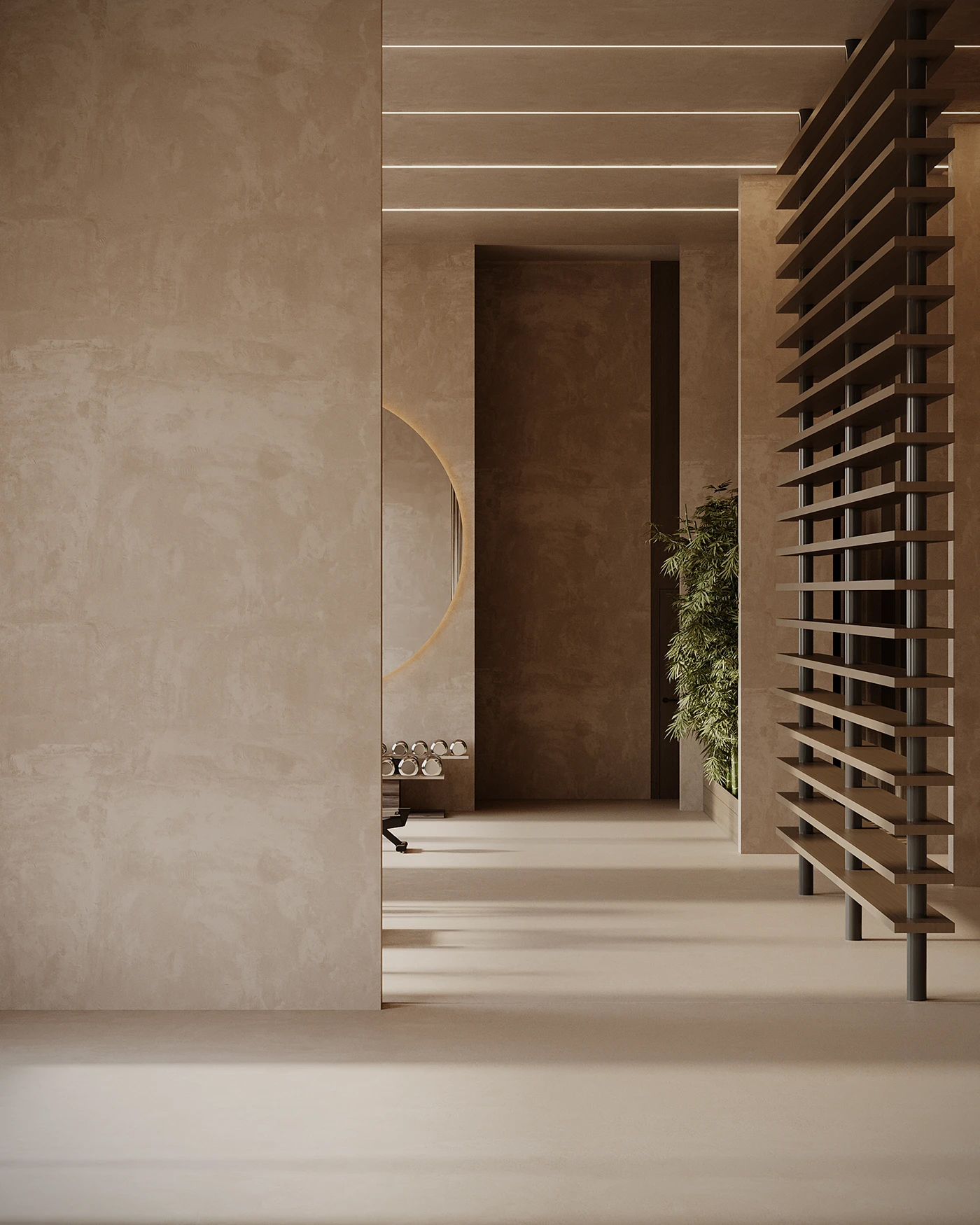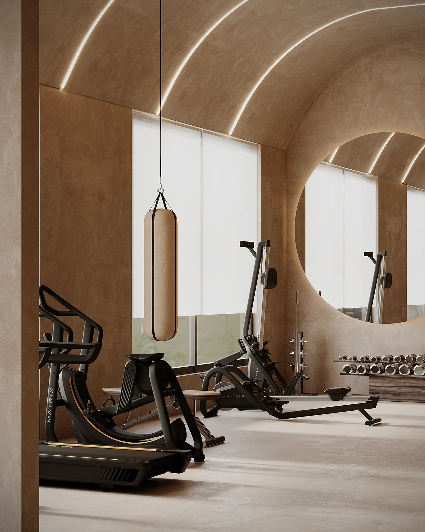 - 空间魔法: 弧形拱门、圆形镜子、悬浮灯带… 把 “建筑感” 藏进功能区,健身房不再是枯燥的撸铁区,变成了艺术展厅!