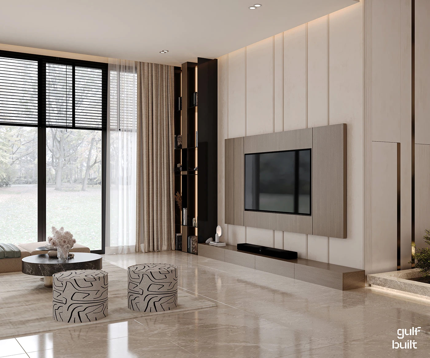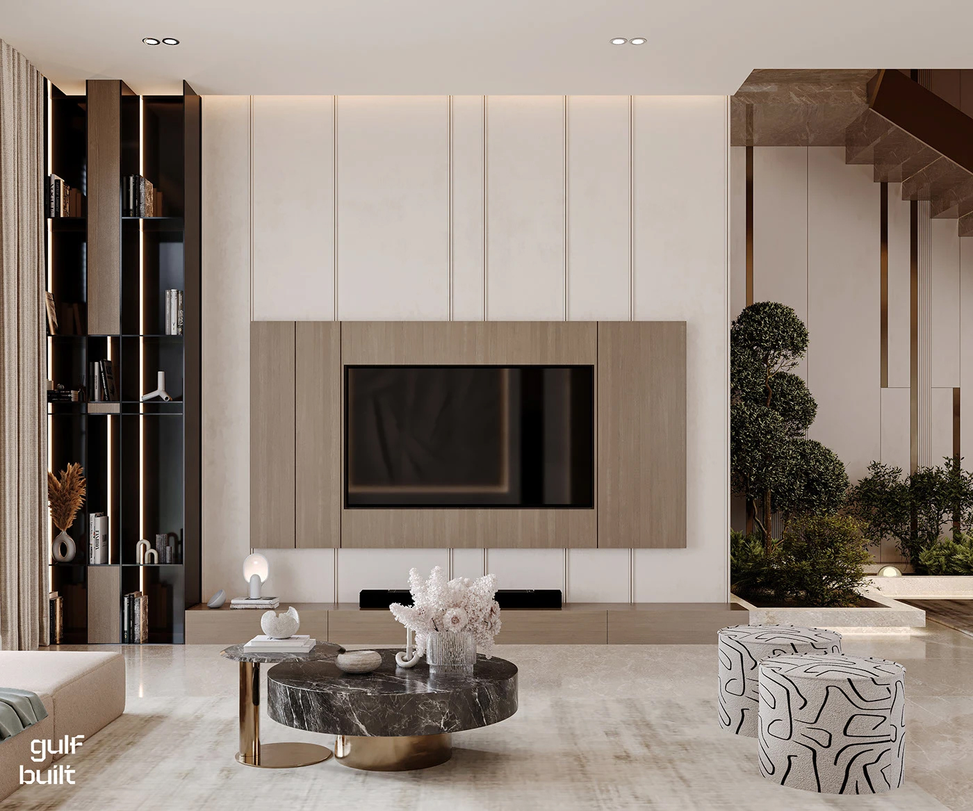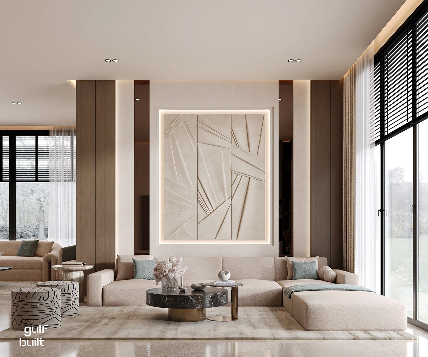 - 收纳魔法: 嵌入式书柜、暗藏式储物柜、玻璃展示柜… 把 “杂物” 藏进设计里,客厅永远像样板间一样整洁!