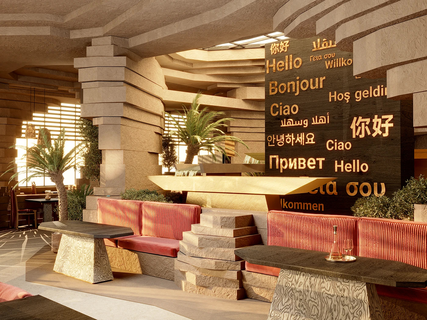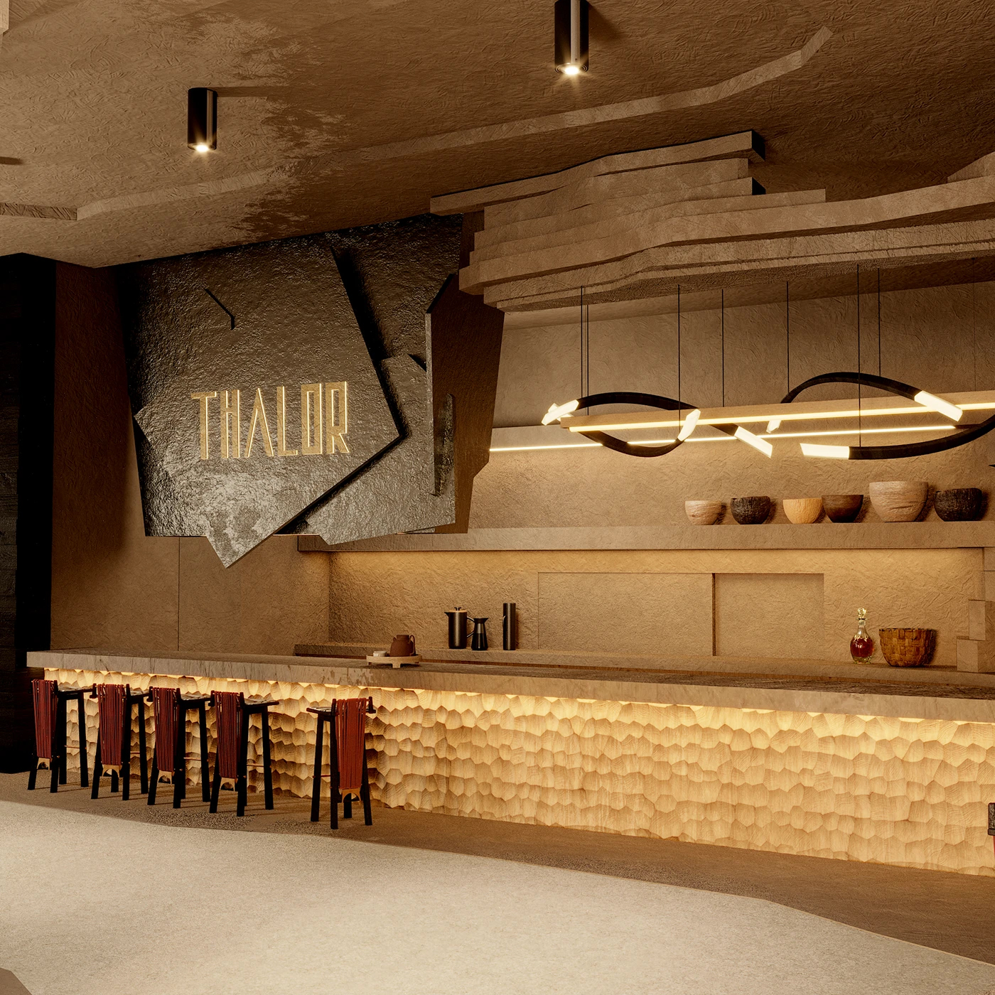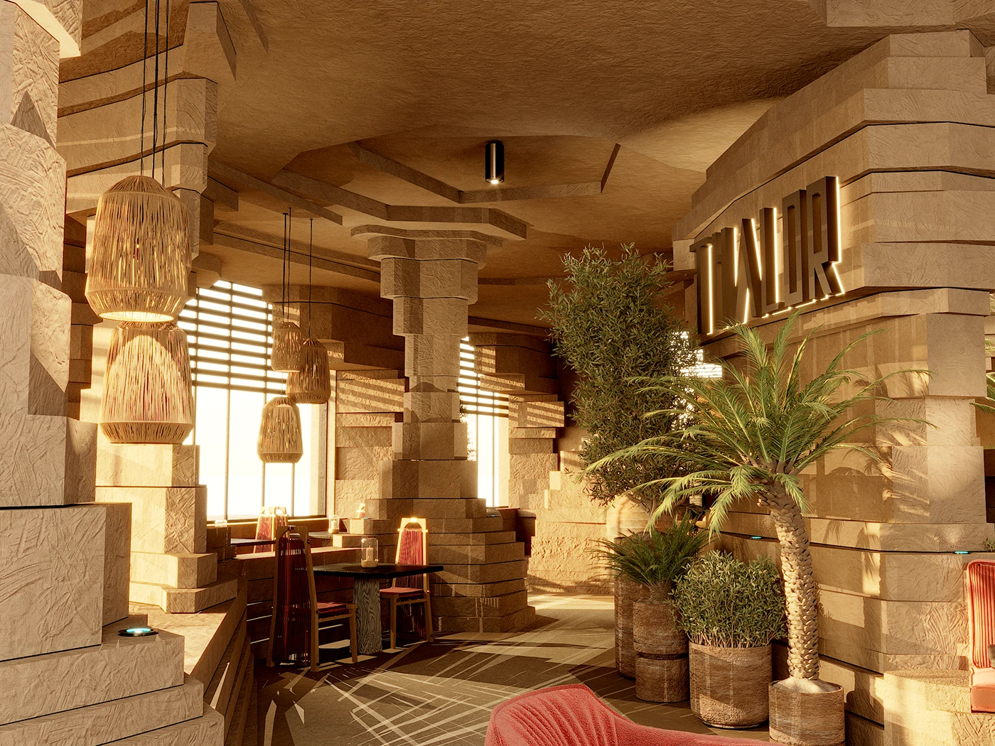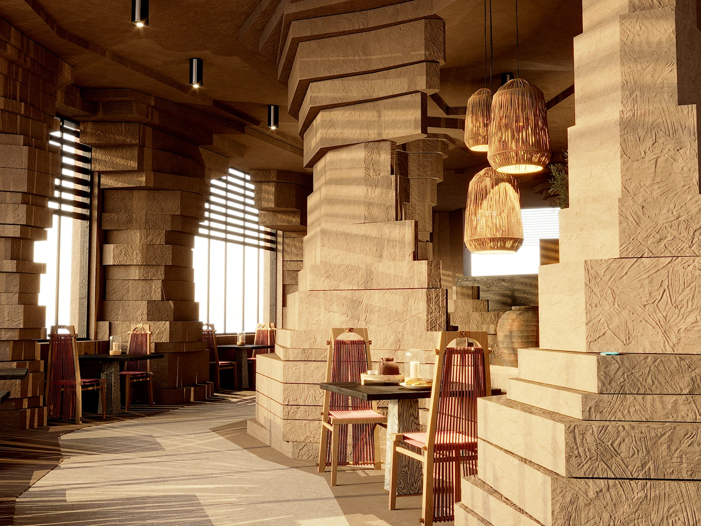 - 石墙心机: 堆叠式设计 + 粗糙肌理,远看是沙漠岩层,近看藏着 “怎么摸都有故事” 的触感~ 坐在这里吃饭,像在考古现场约会!