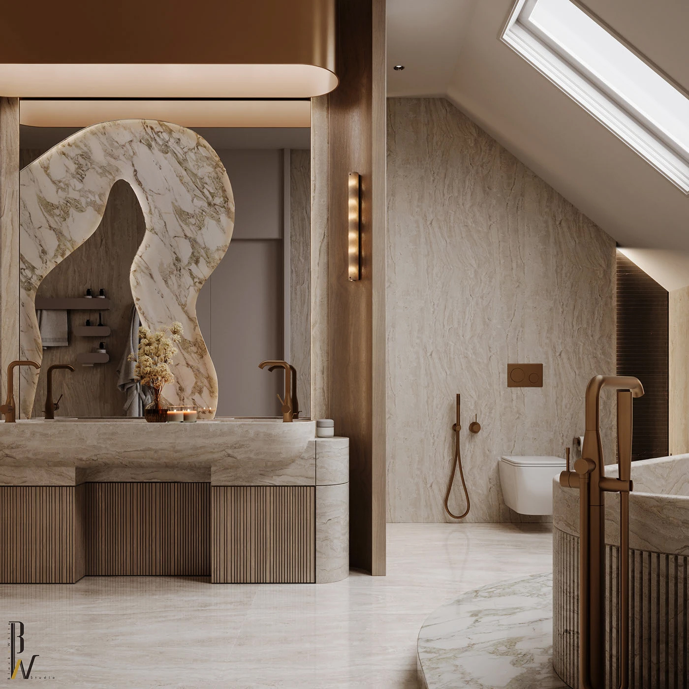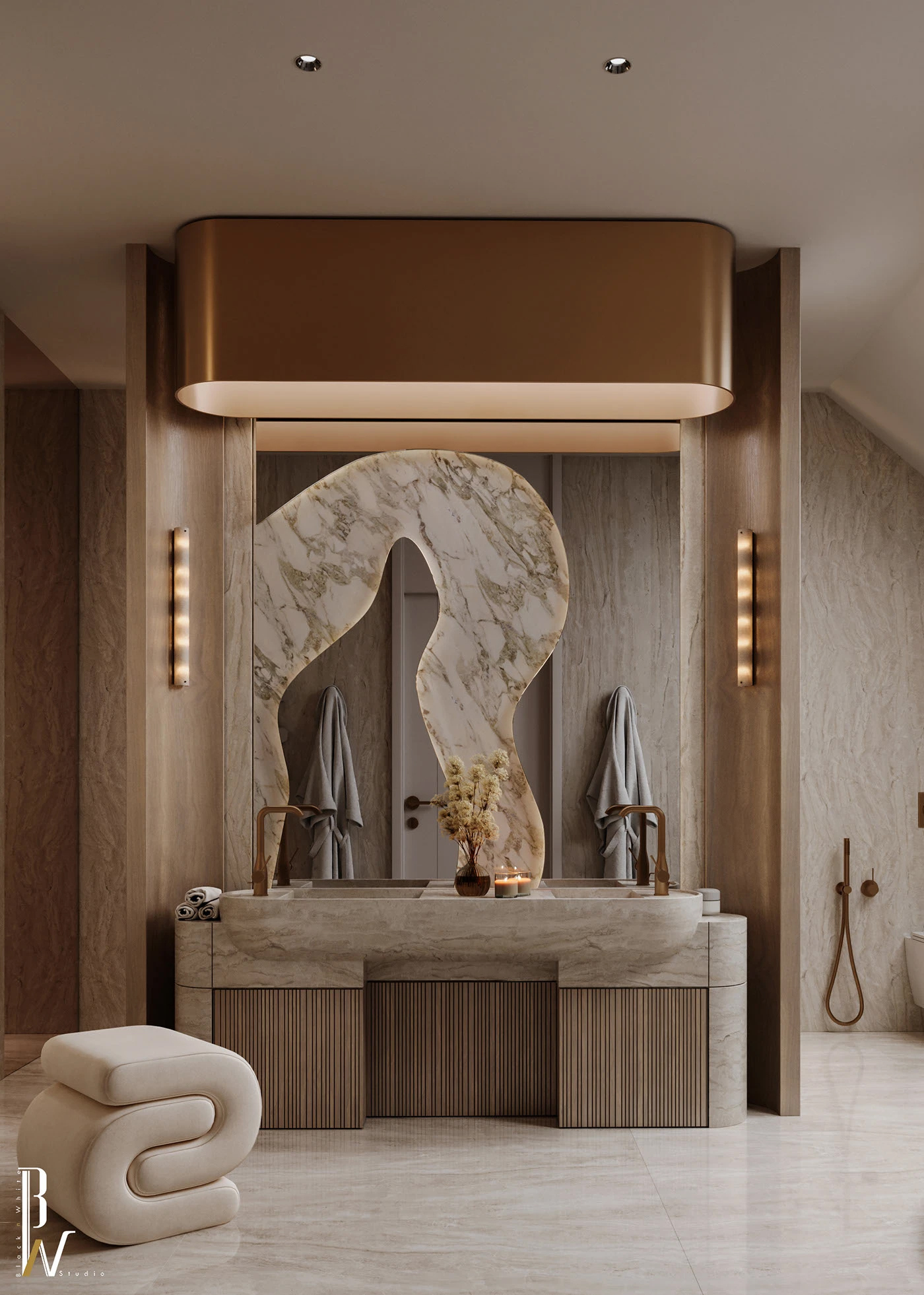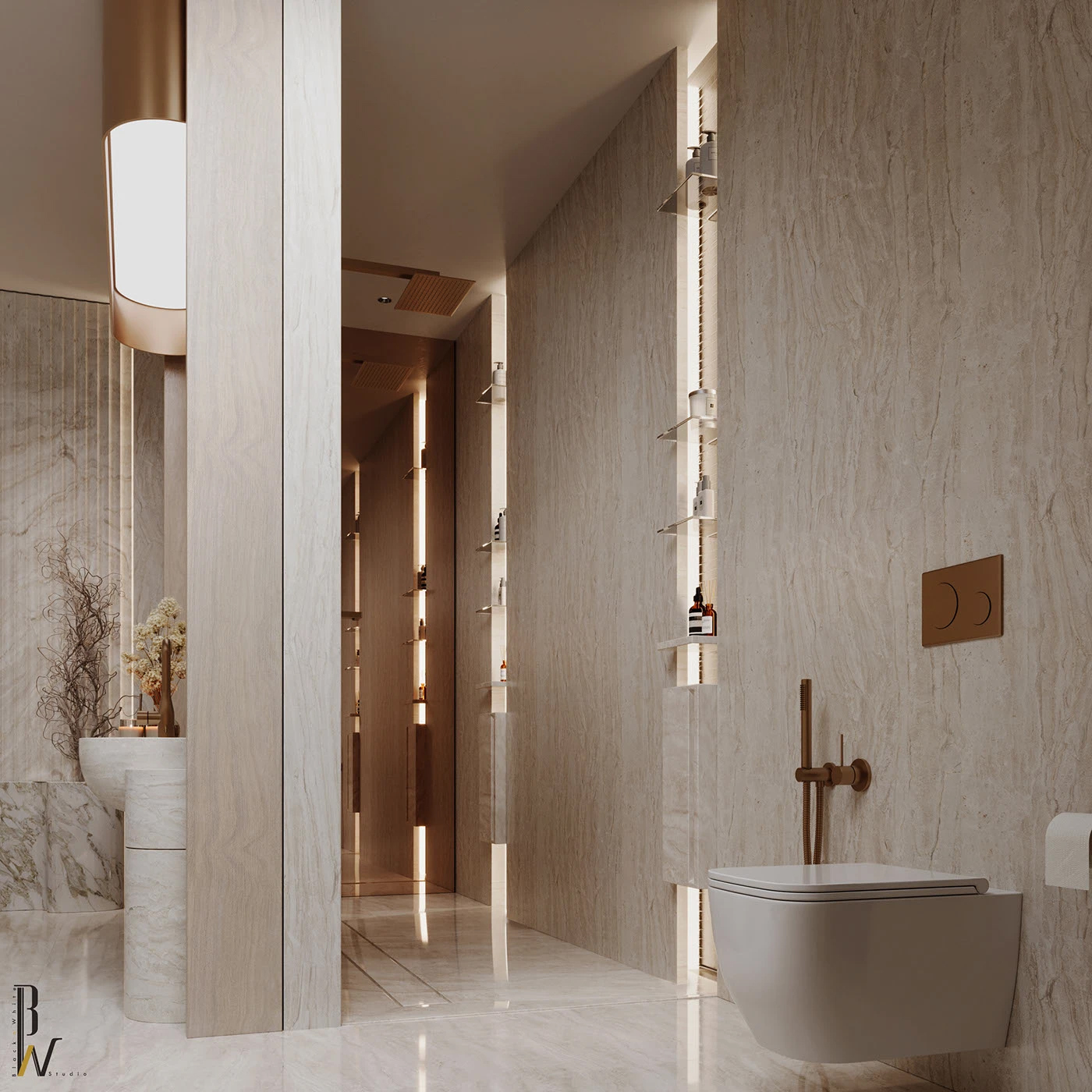 - 自然轻奢风:大面积大理石 + 铜色金属元素,把 “自然肌理” 和 “精致奢华” 焊死在空间里✨ 没有冰冷工业感,反倒像 “把自然岩洞搬进家”,仿佛在说 “卫浴也能是治愈角落”~