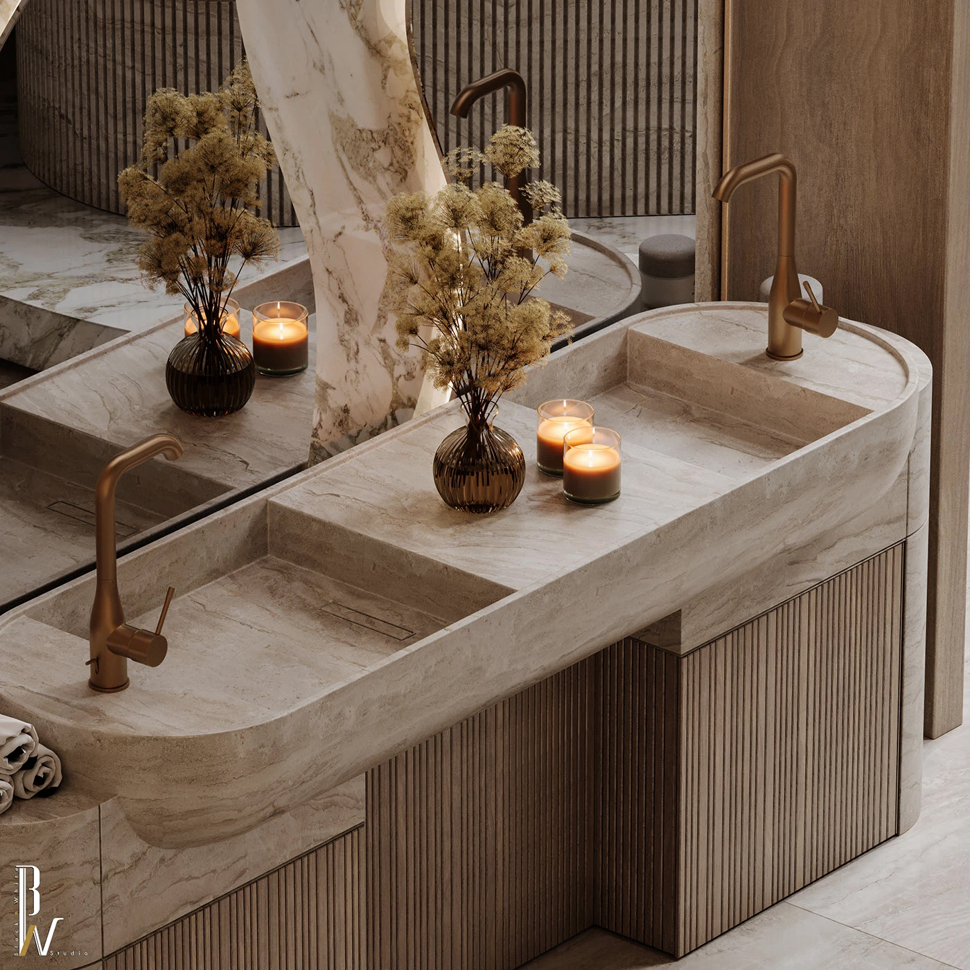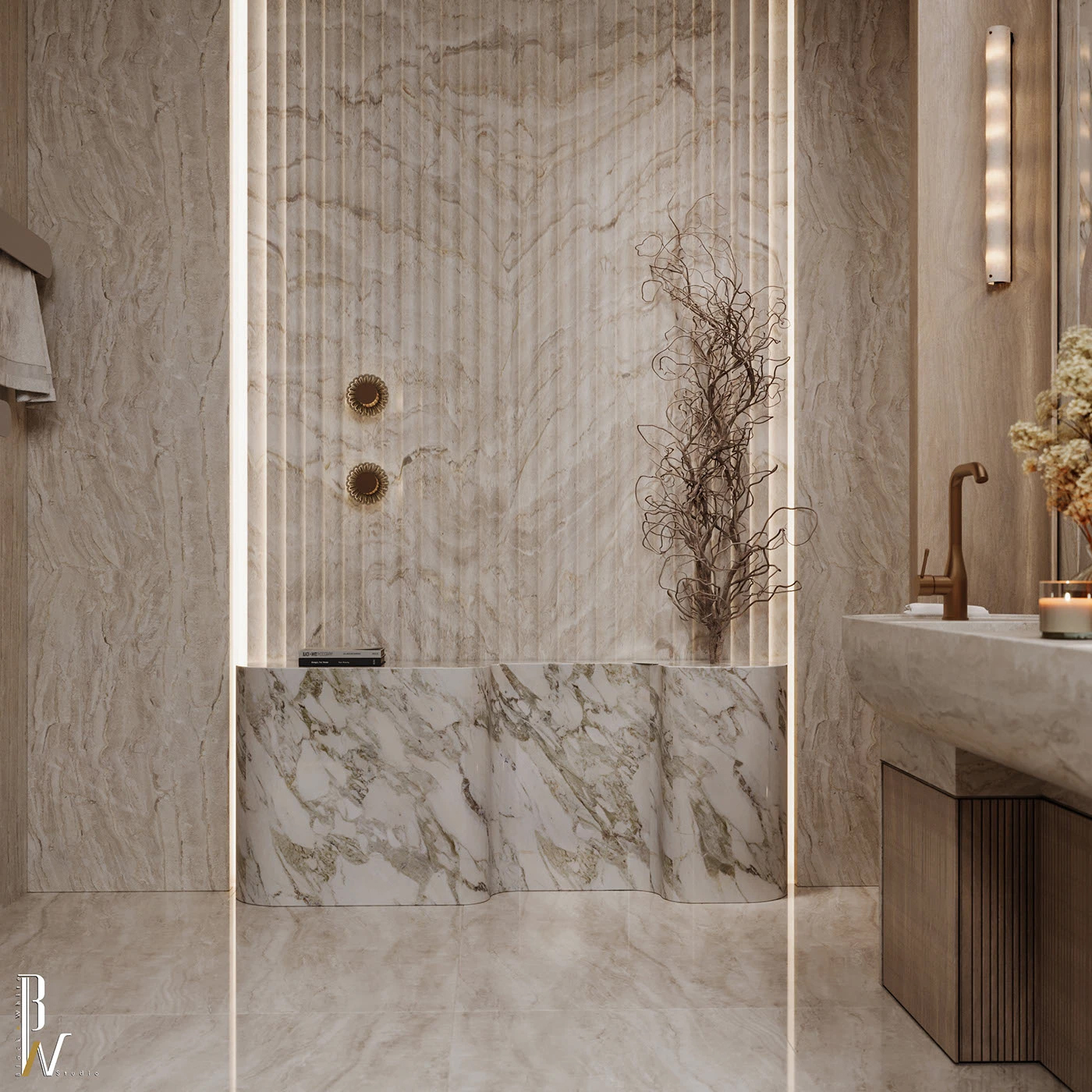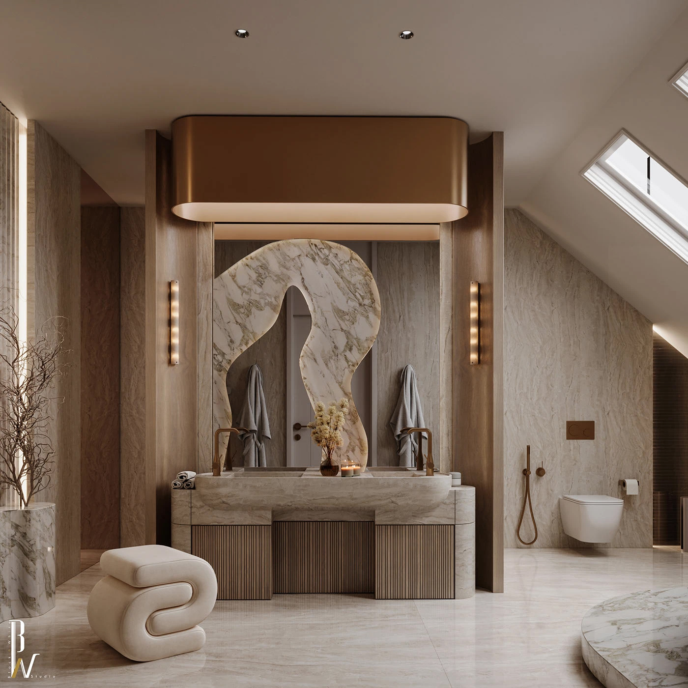 - 自然轻奢风:大面积大理石 + 铜色金属元素,把 “自然肌理” 和 “精致奢华” 焊死在空间里✨ 没有冰冷工业感,反倒像 “把自然岩洞搬进家”,仿佛在说 “卫浴也能是治愈角落”~