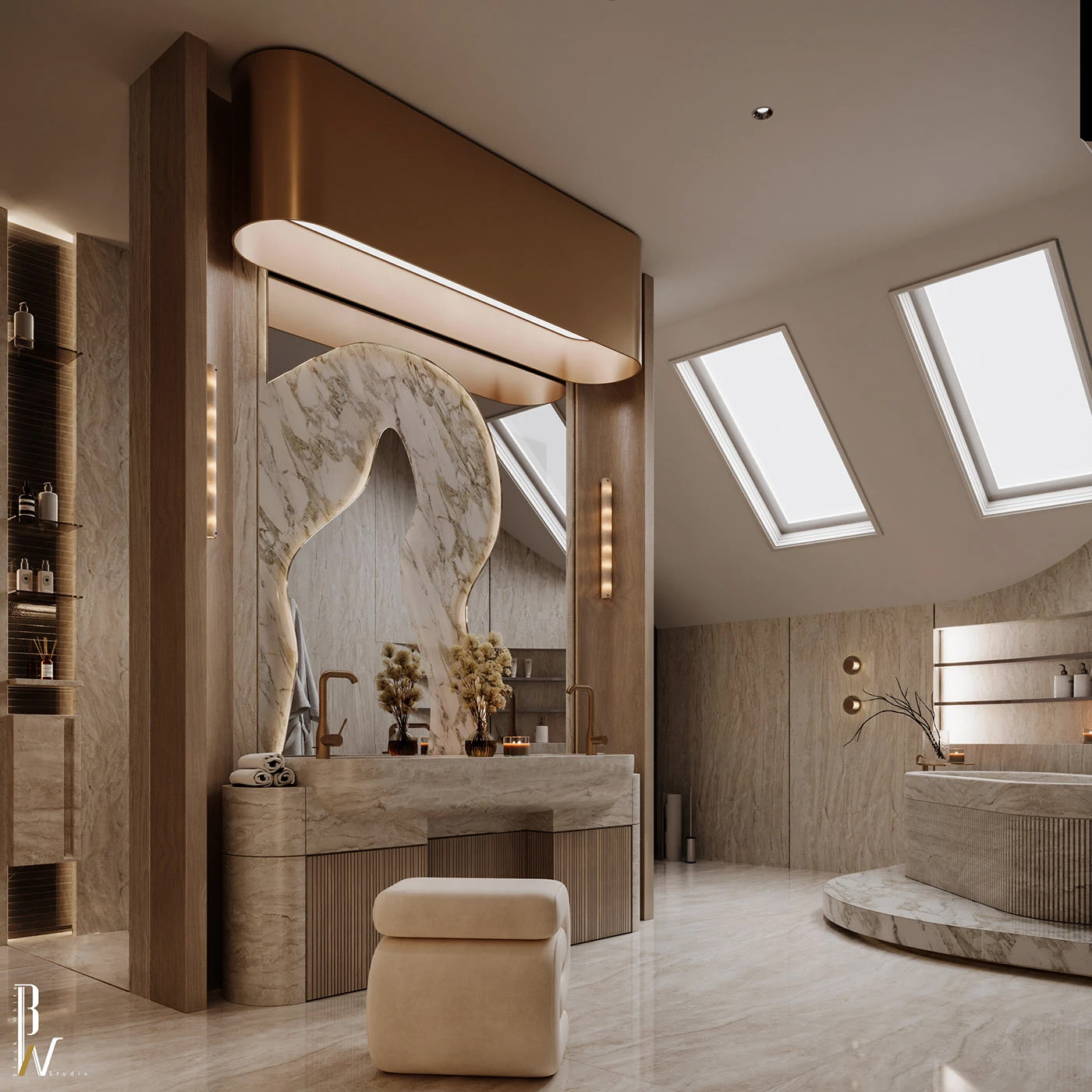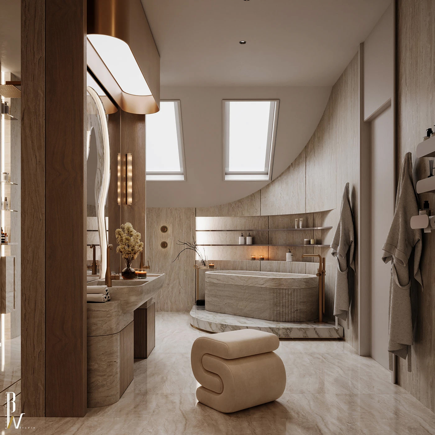 - 仪式感空间:弧形浴缸区、艺术异形镜、嵌入式收纳… 把 “洗漱变成享受” 拉满🛀 泡澡时能透过天窗看星空,主打 “沉浸式疗愈”!