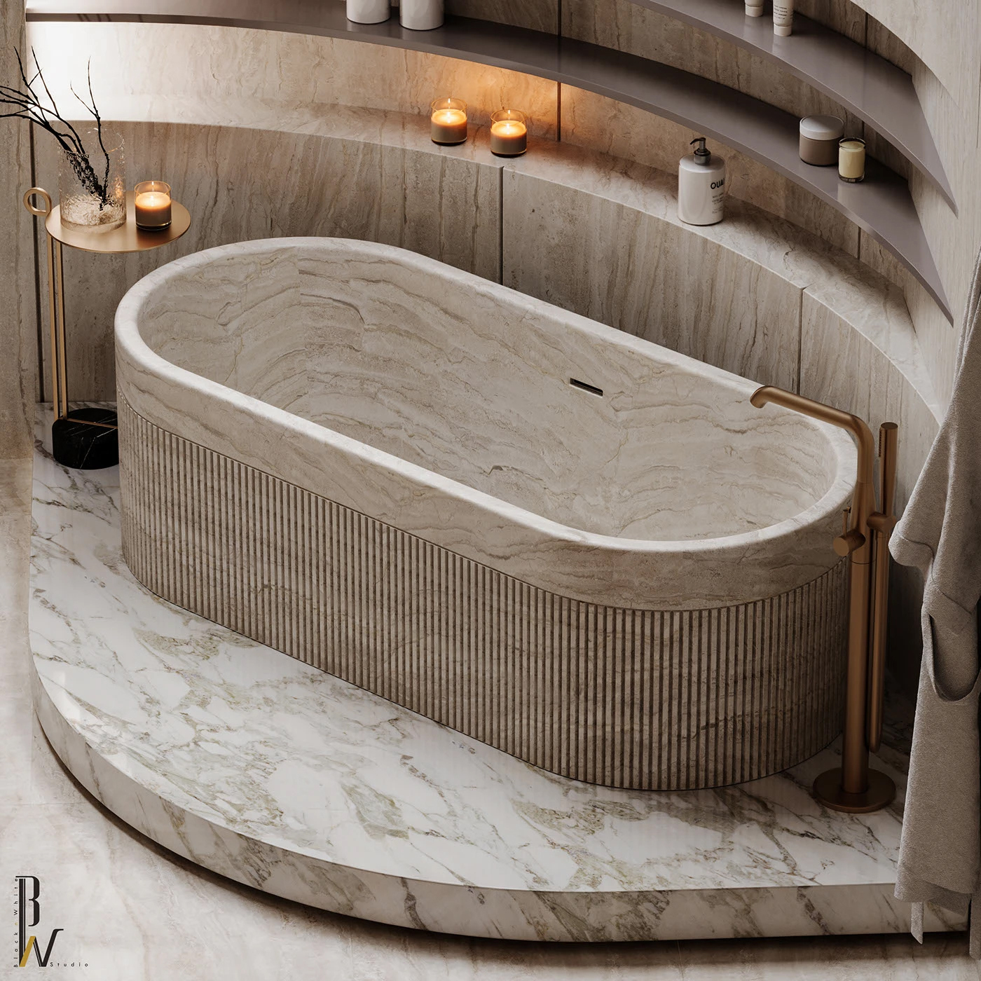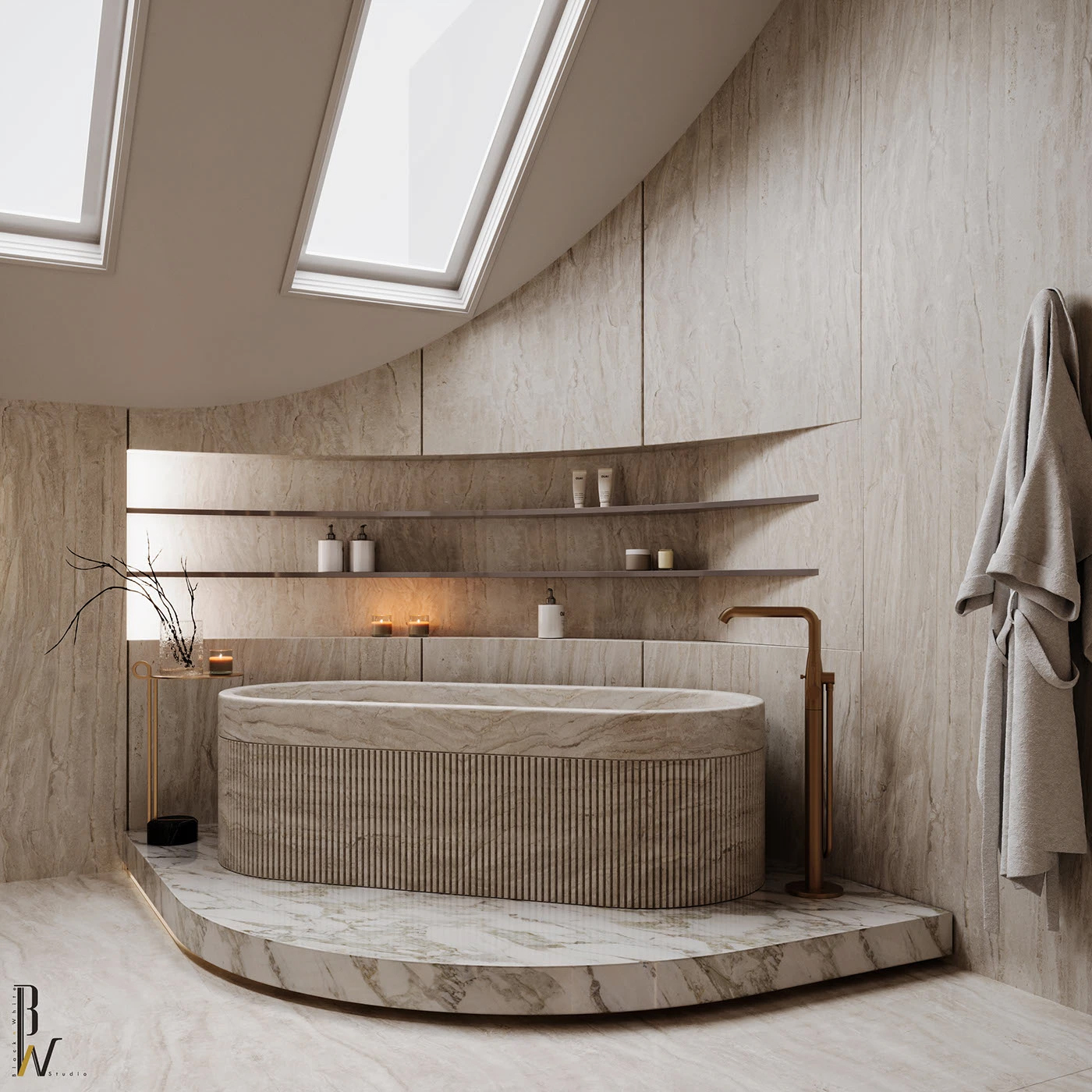 - 石材心机:一体成型大理石浴缸、异形艺术镜、统一纹理的墙面,远看是 “自然艺术品”,近看藏着 “石材切割拼接” 的巧思~ 十年后看也不过时,妥妥 “传家级审美”!