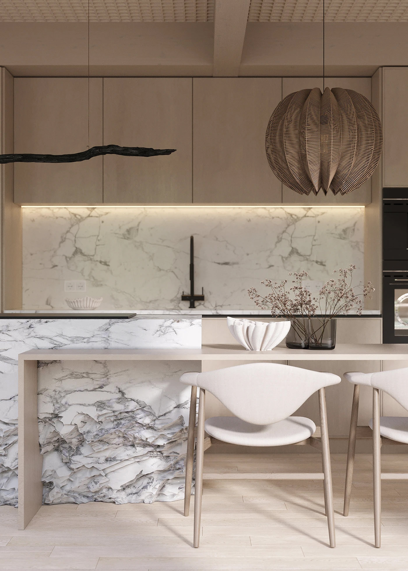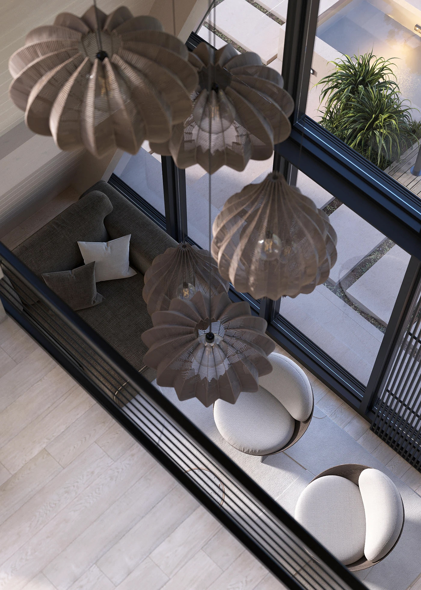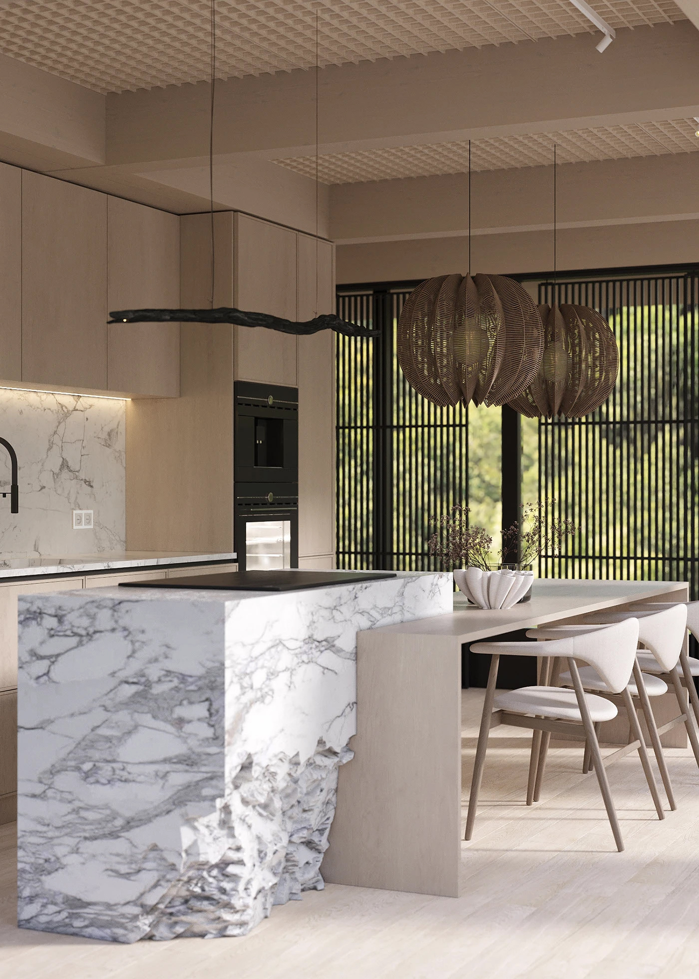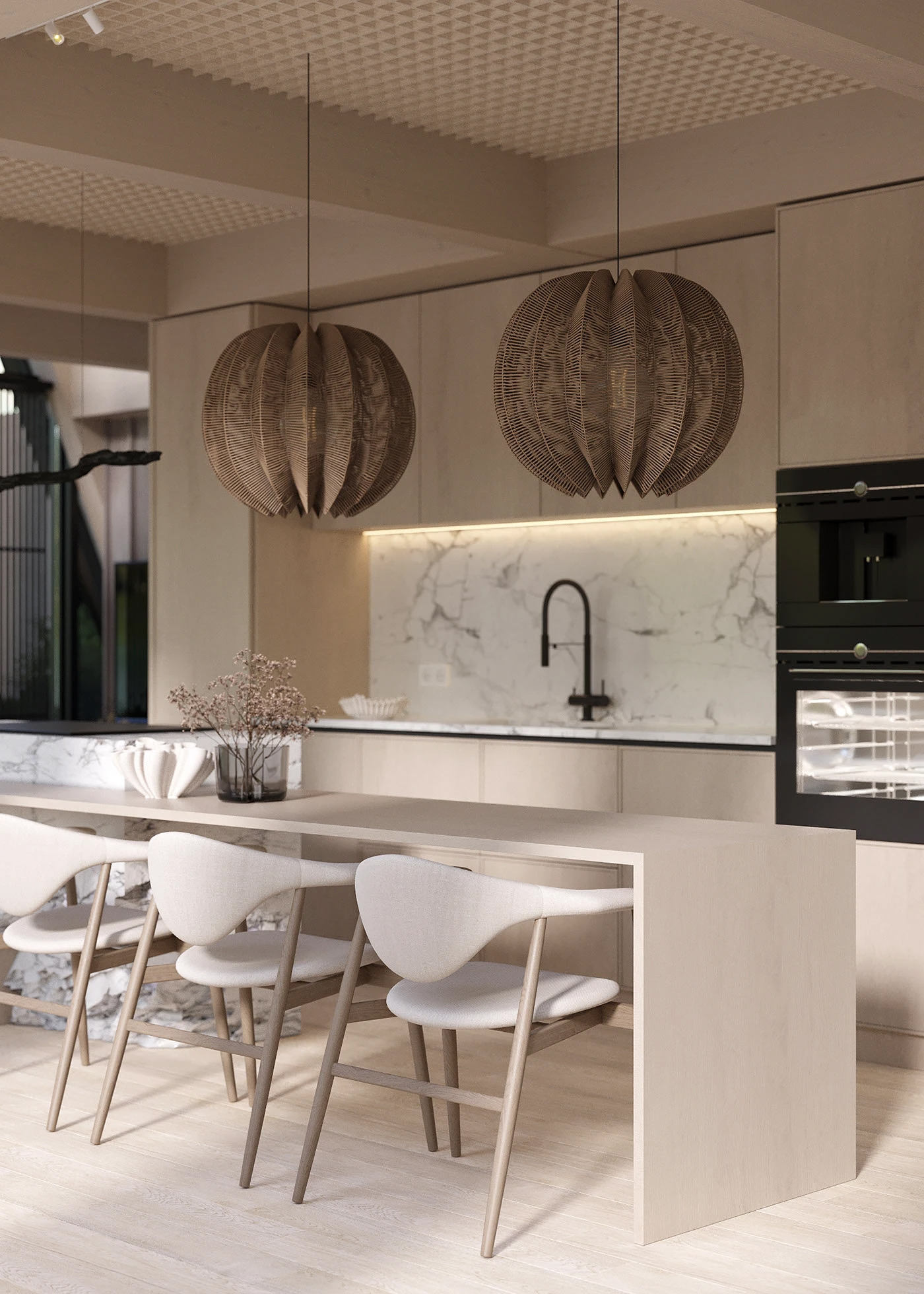 • 室内:原木 + 大理石 + 艺术灯具,每个角落都像精心设计的展厅,却又透着 “住得舒服” 的松弛感。