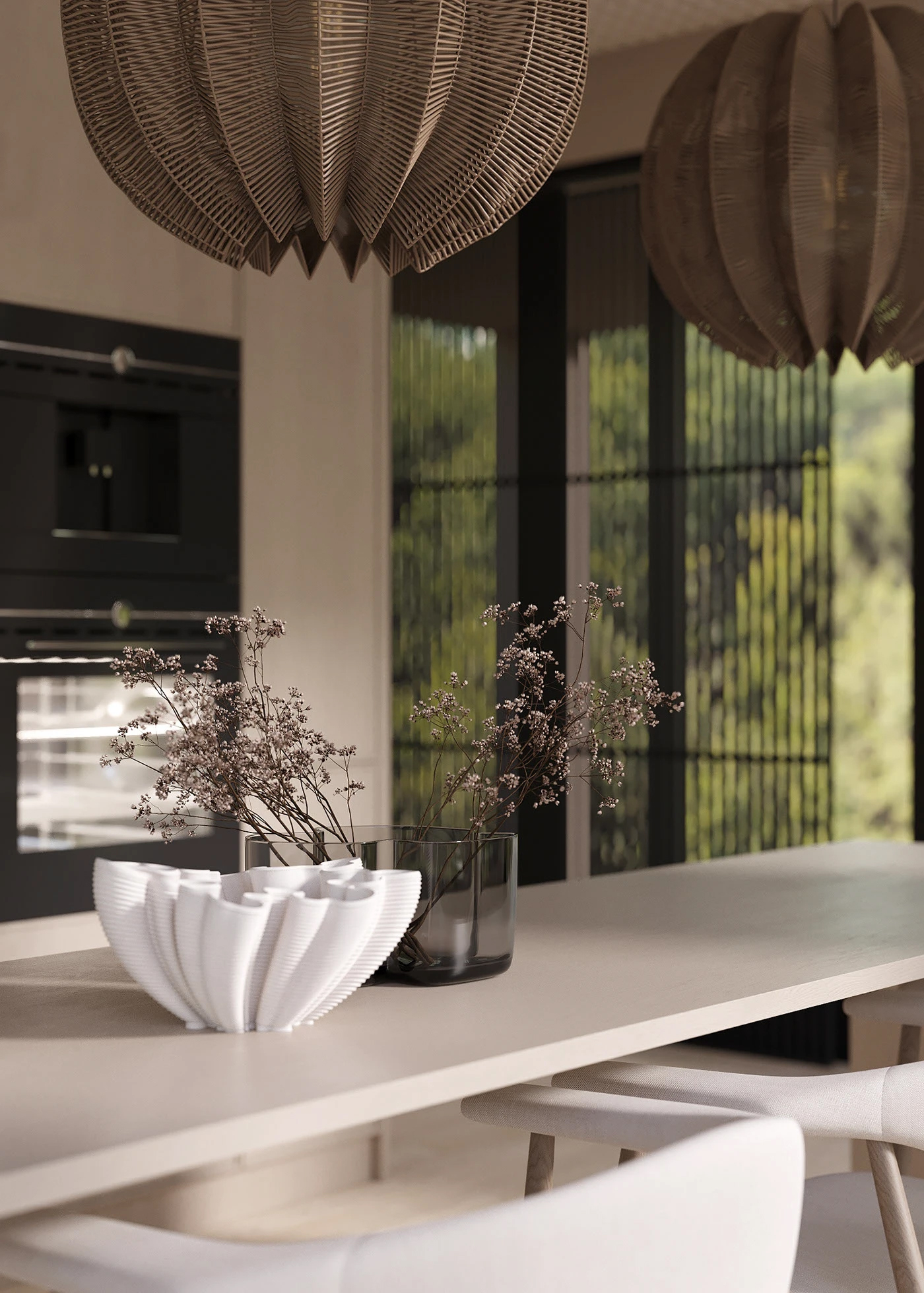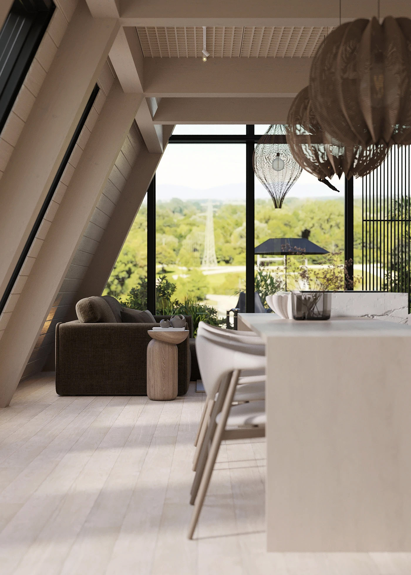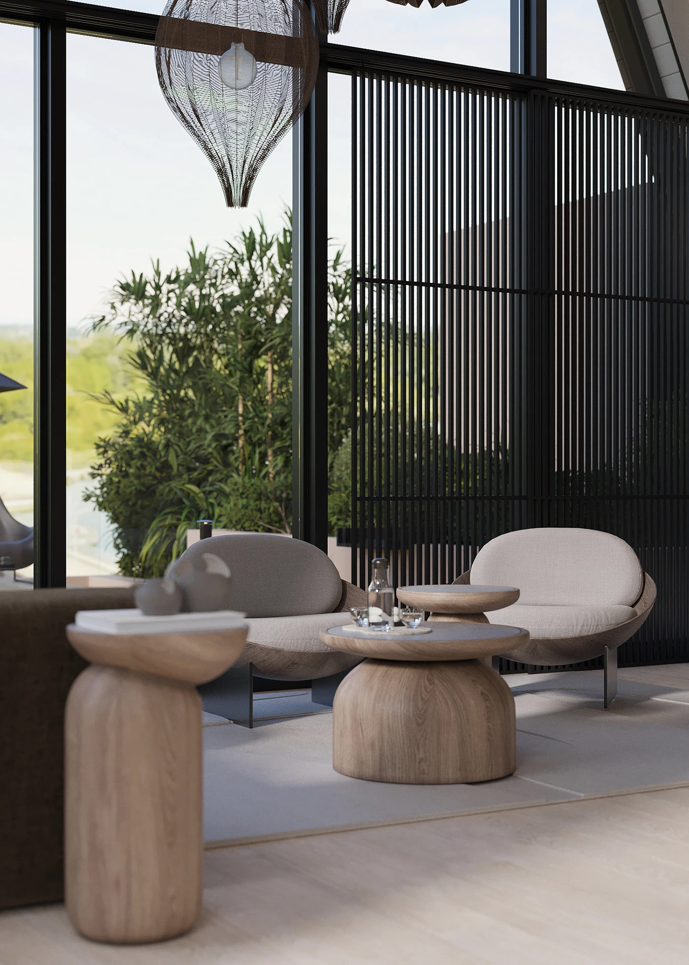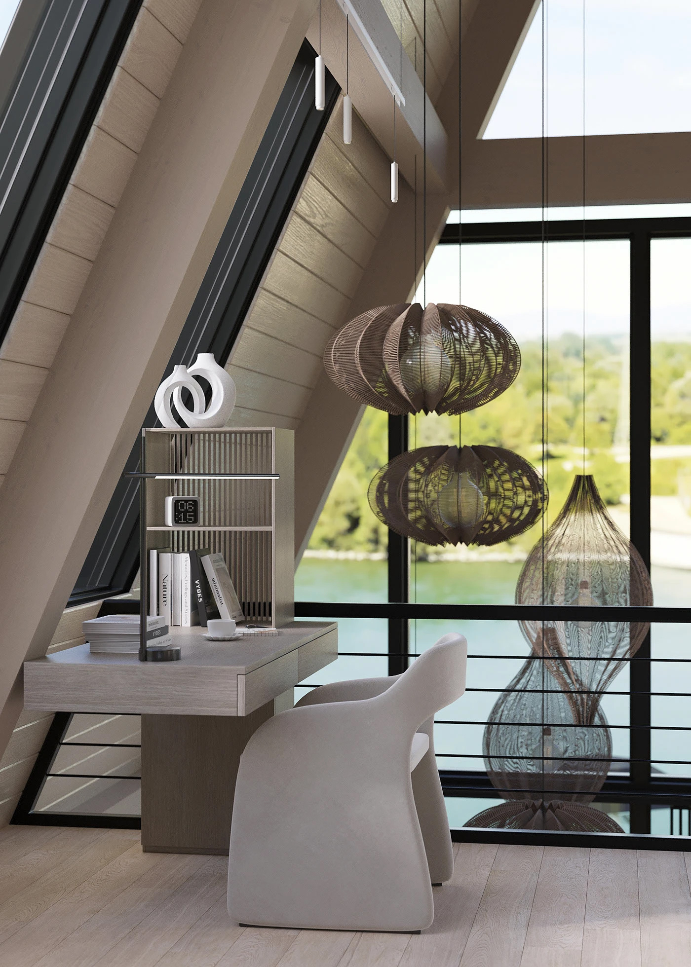 • 室内:原木 + 大理石 + 艺术灯具,每个角落都像精心设计的展厅,却又透着 “住得舒服” 的松弛感。