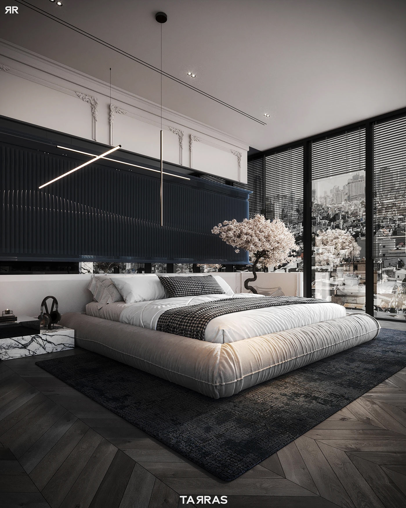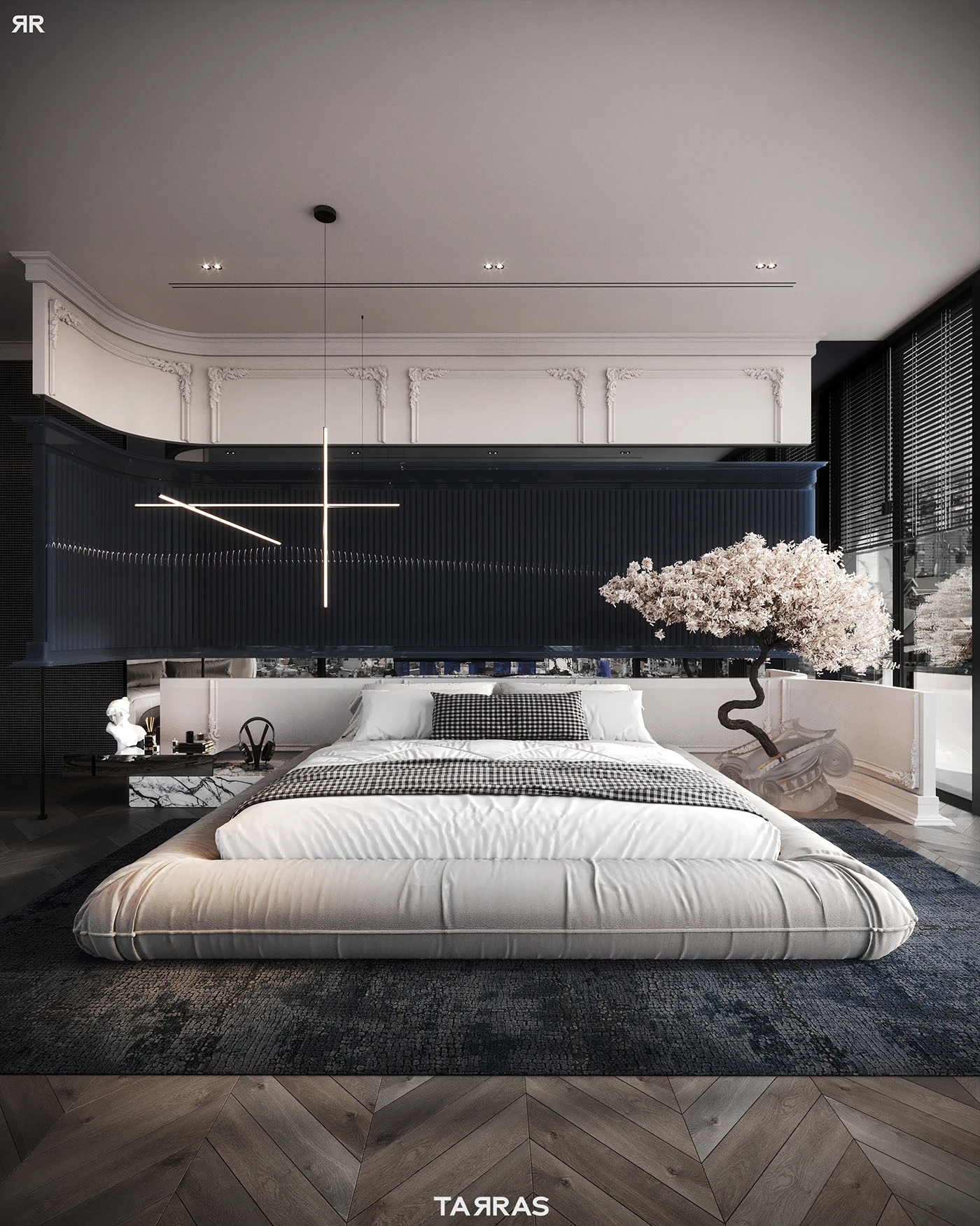 • 氛围层次戏很足:雕花吊顶划分出复古的精致感,几何吊灯、艺术摆件的光影洒落,每个角落都像精心布置的 “小画廊”,哪怕只是躺着休息,都像在沉浸式感受美学。