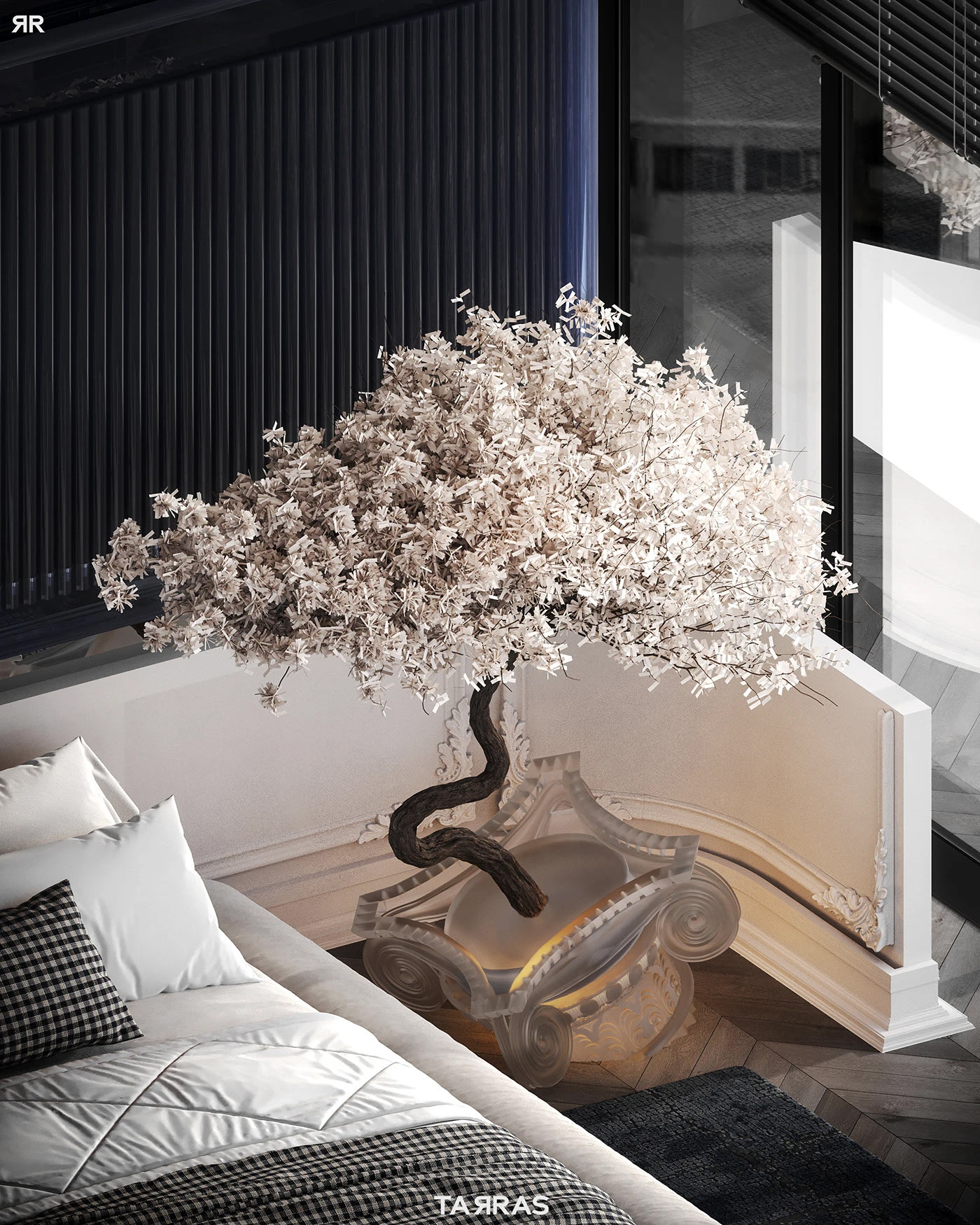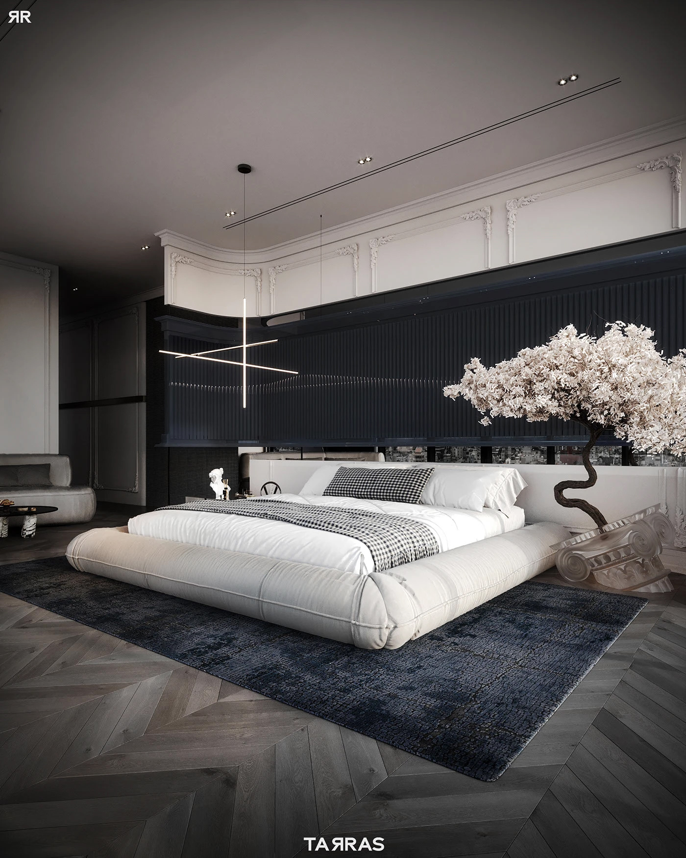 推开门就被复古轻奢 × 现代艺术的氛围击中 —— 欧式雕花吊顶像从古典宫殿搬来的精致,深色波纹背景墙、几何线条吊灯又带着现代极简的利落感,还有那株盛放的 “樱花树” 装置,把 “复古优雅” 与 “当代艺术感” 揉得恰到好处,住在这里,每天醒来都像在逛美学展✨