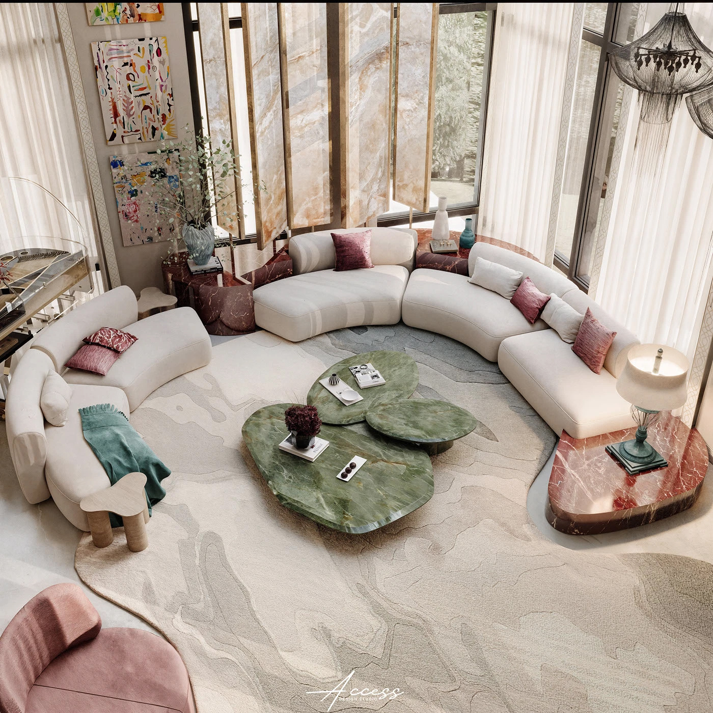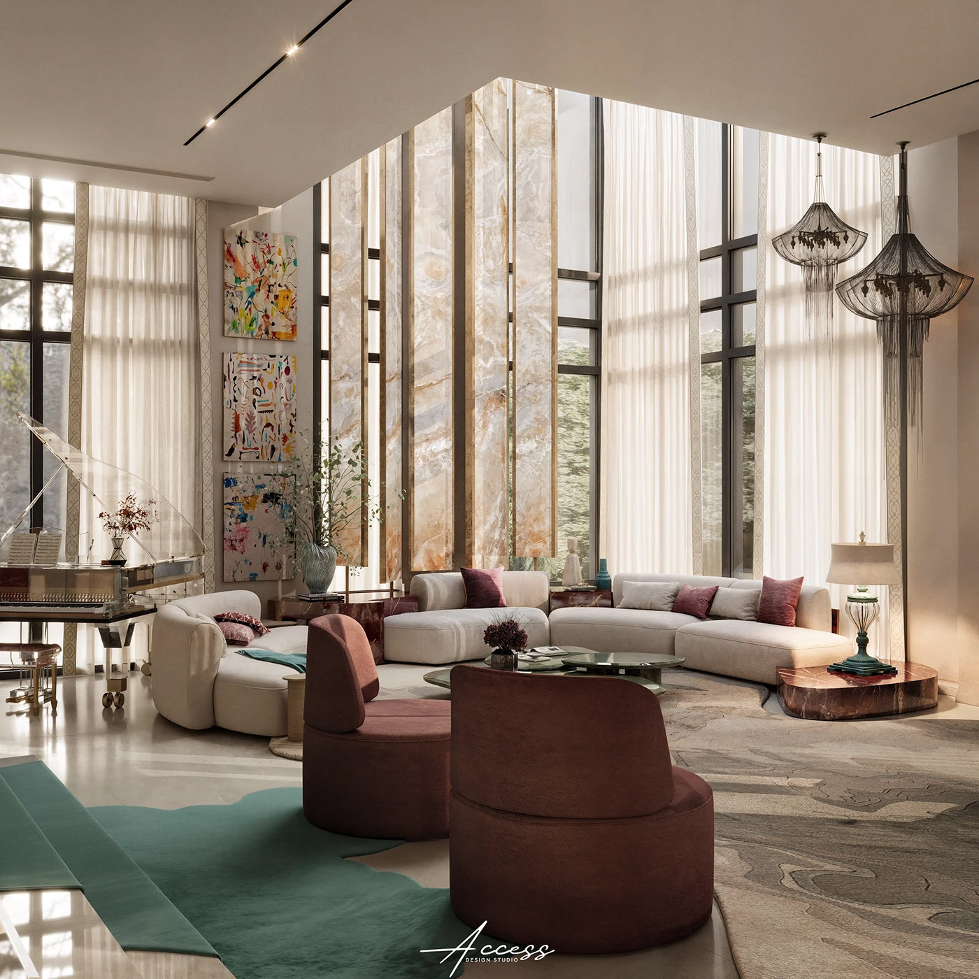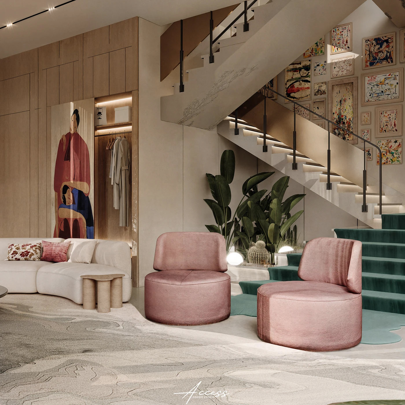 • 空间层次戏很足:弧形沙发、异形茶几自然划分社交区,拱门和挂画营造视觉焦点,灯光从顶部、墙面洒下的光影,让每个区域既有 “艺术展厅的仪式感”,又有 “家的松弛感”。