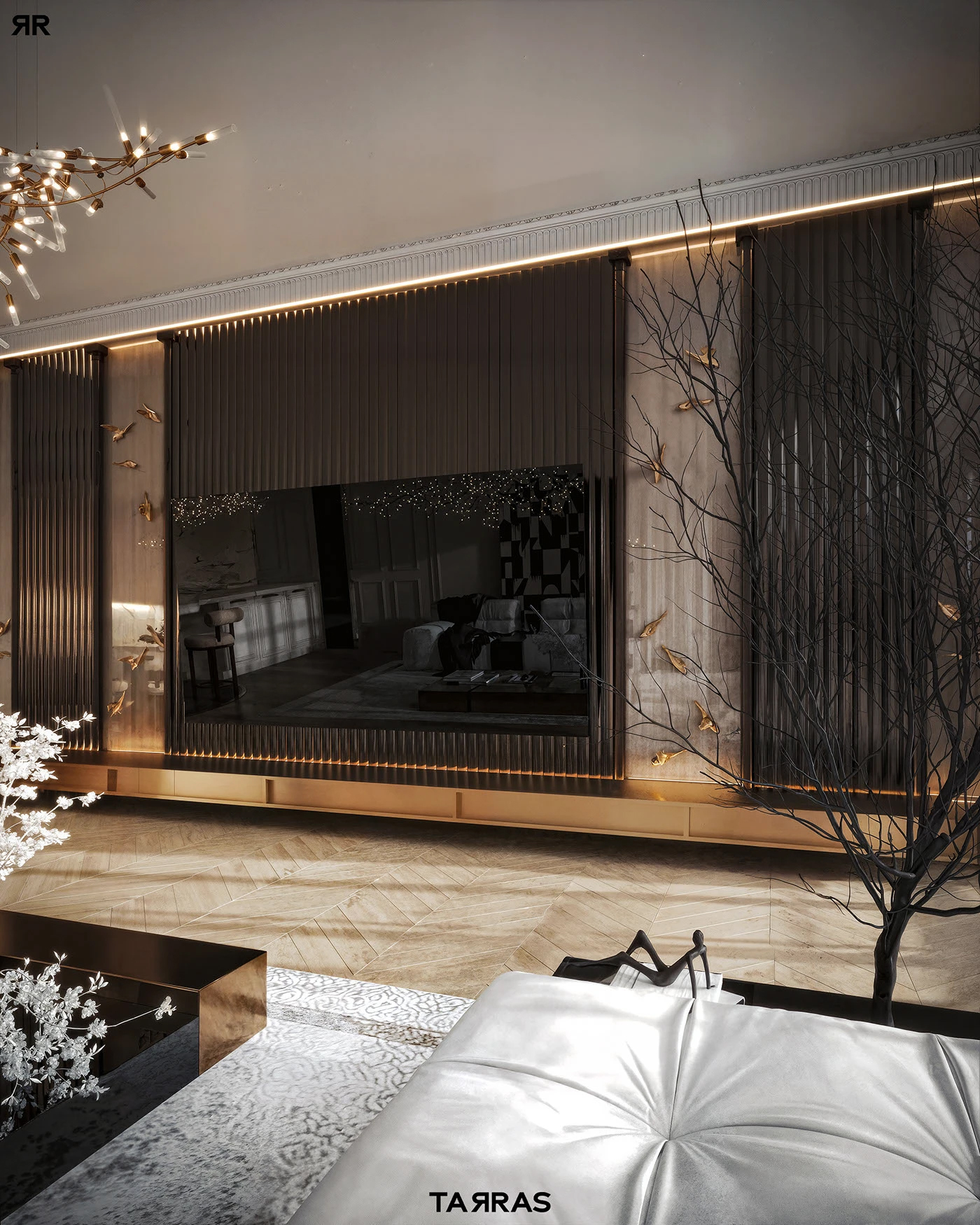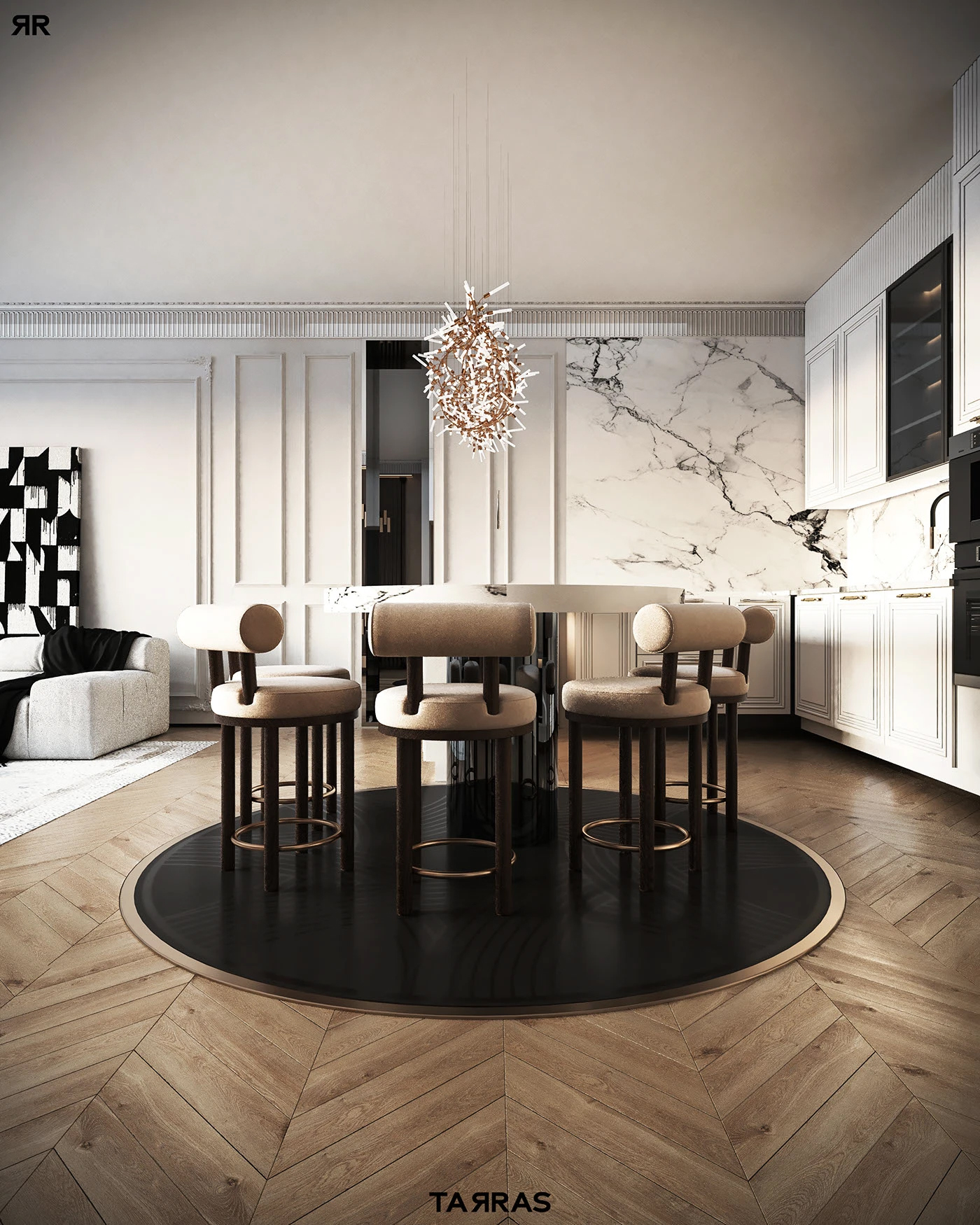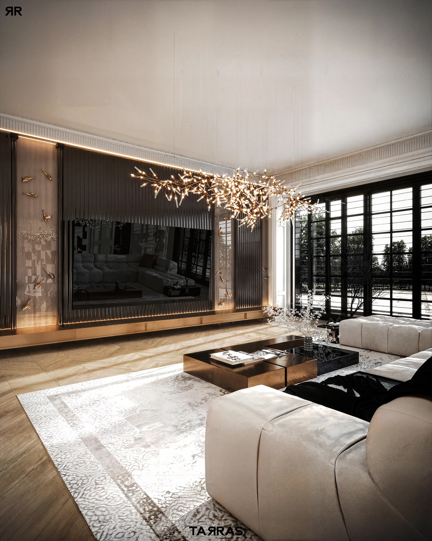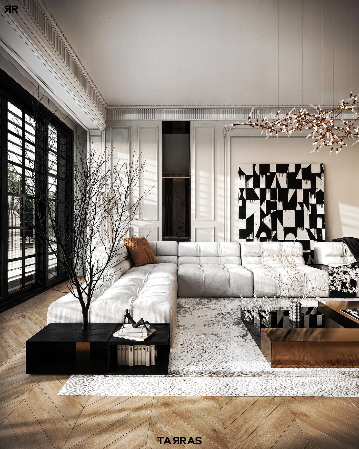 - 风格融合魔法:古典的墙面雕花、线条元素,与现代金属吊灯、极简家具大胆碰撞,既有百年前的优雅仪式感,又有当下流行的轻奢冷调,让 “复古庄重” 与 “现代松弛” 完美共生;