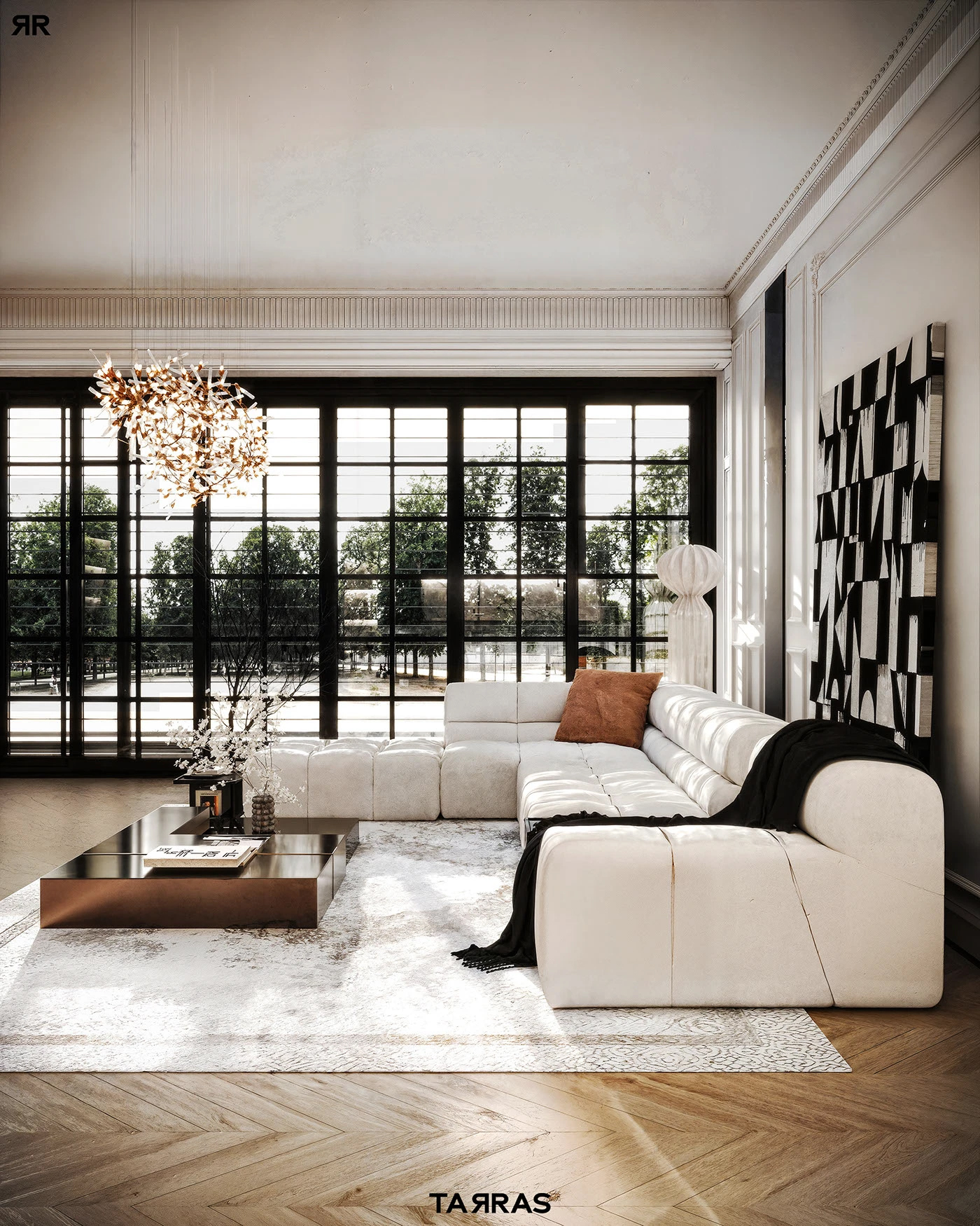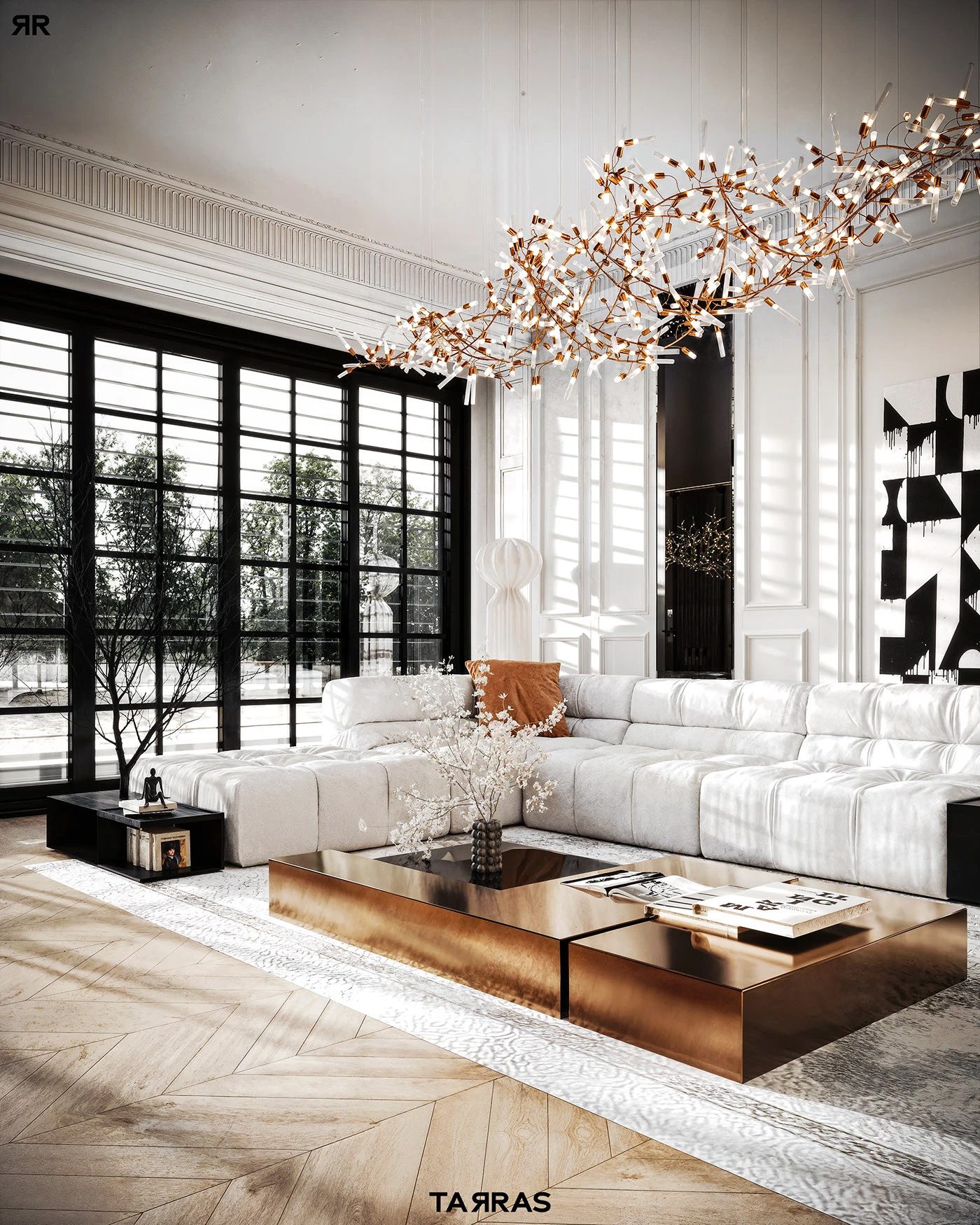 - 空间层次戏很足:大窗户引入的自然光,与金属吊灯的光影交织,古典线条划分的区域既有社交通透感,又有独处私密感,待再久都不单调。