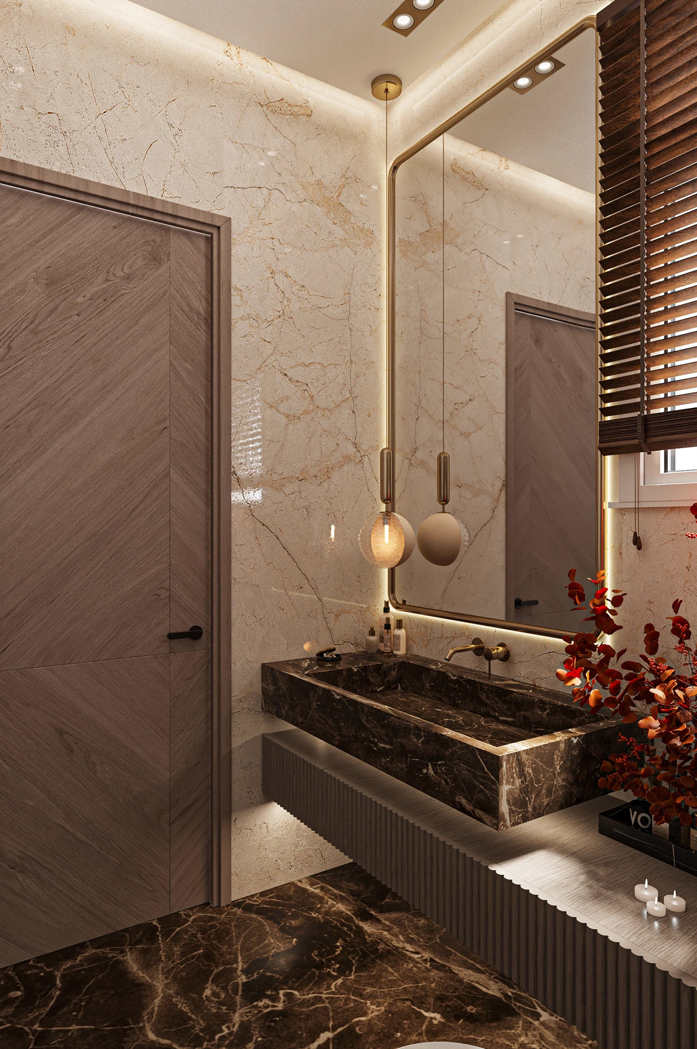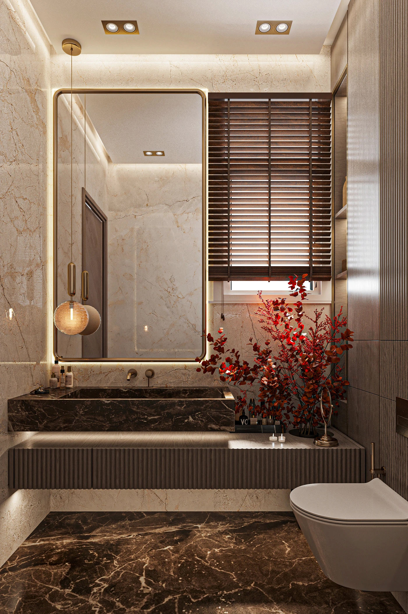 • 风格融合魔法:大理石的冷冽高级,撞上金属的精致线条和木质的温暖质感,既有轻奢的 “贵气感”,又有居家的 “松弛感”。金色元素(镜子边框、灯具)的点缀,让整个空间的高级感瞬间拉满,哪怕是小小的浴室,也能拍出 “豪宅既视感”;