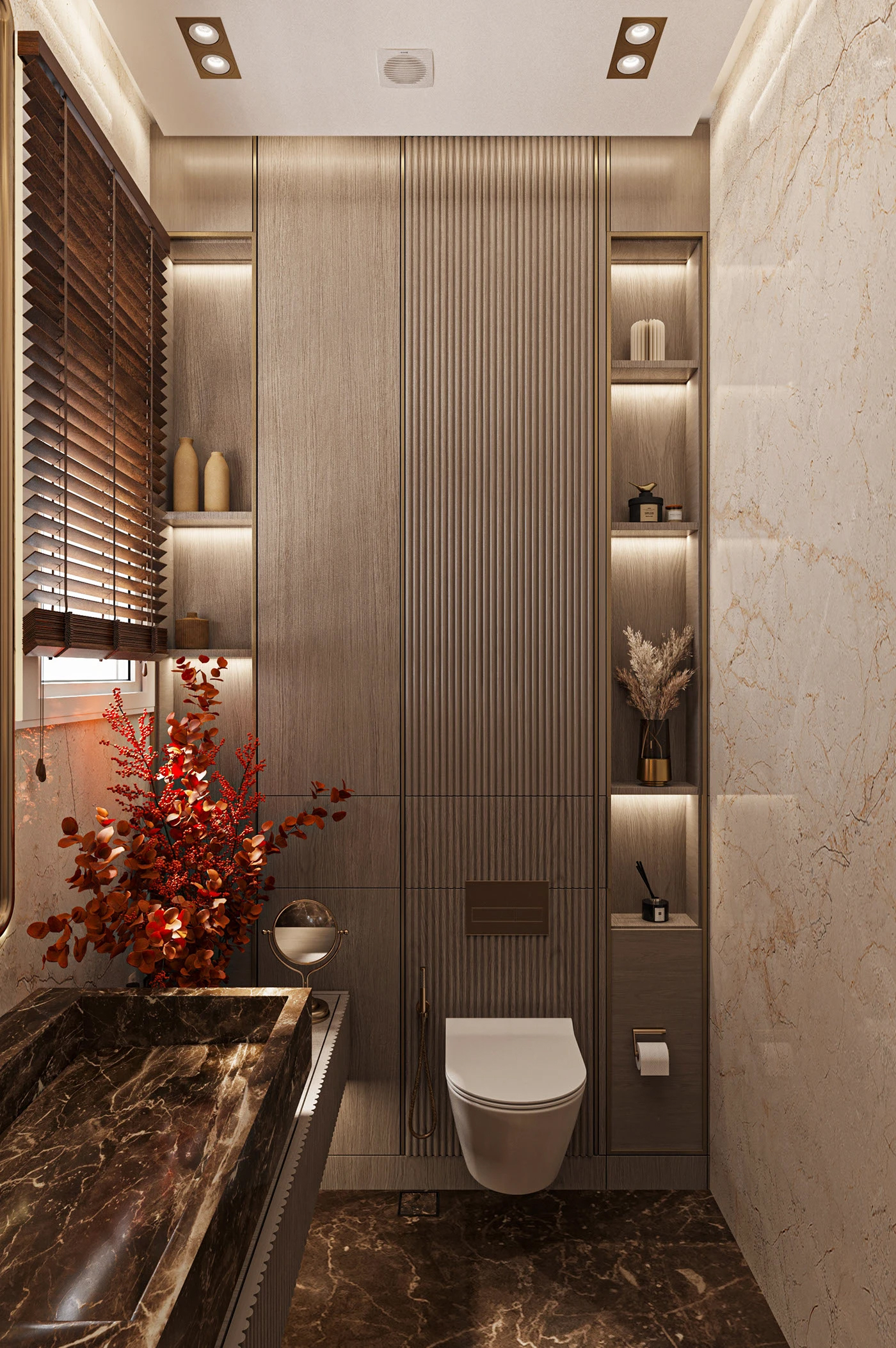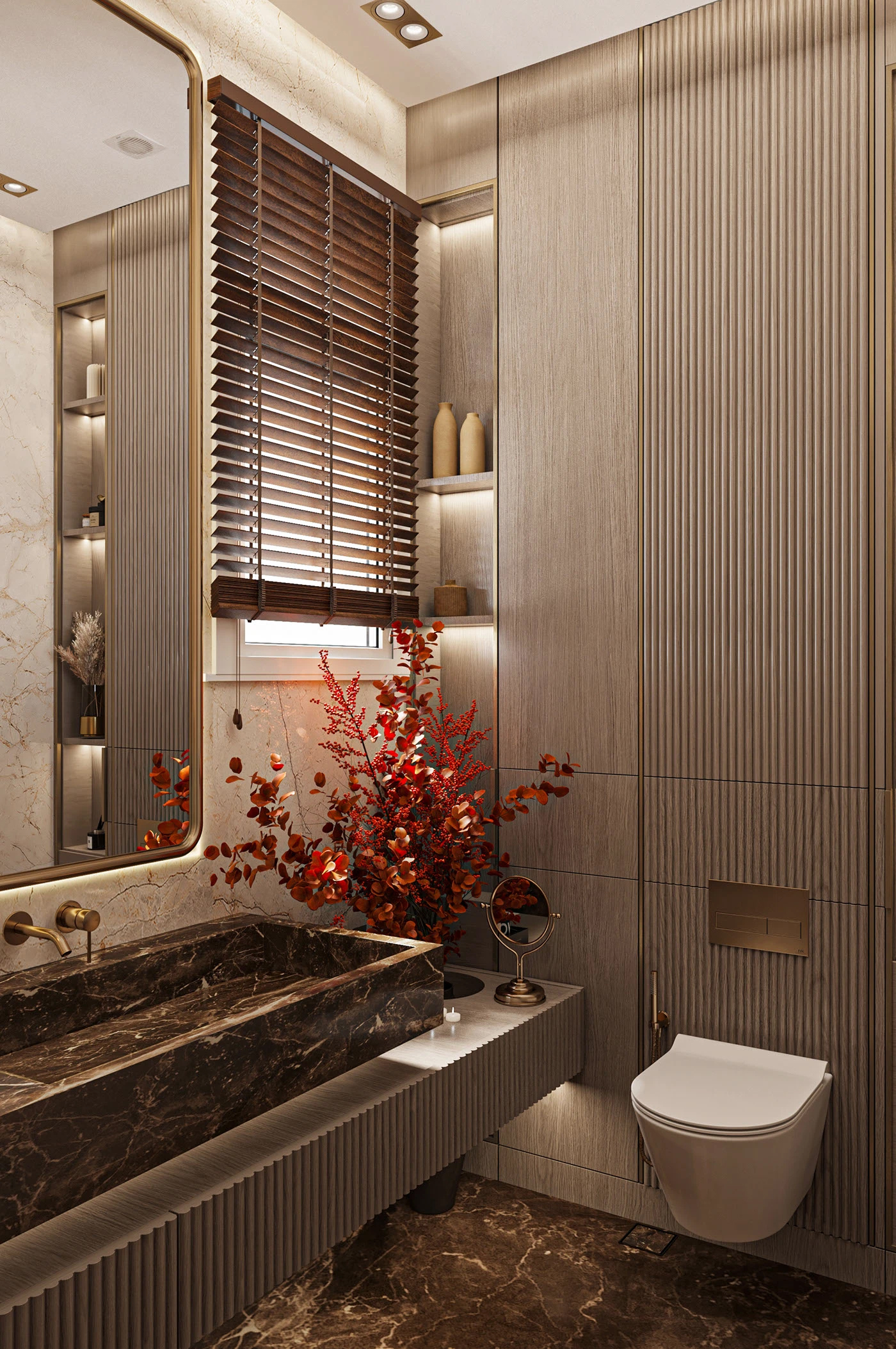 • 材质氛围杀:深色大理石的肌理自带奢华 buff,搭配暖色调灯光,把浴室的氛围感烘托得恰到好处。木质百叶窗和收纳柜的加入,又中和了大理石的冷硬,让空间 “冷中有暖”,洗漱时的体验感绝了;