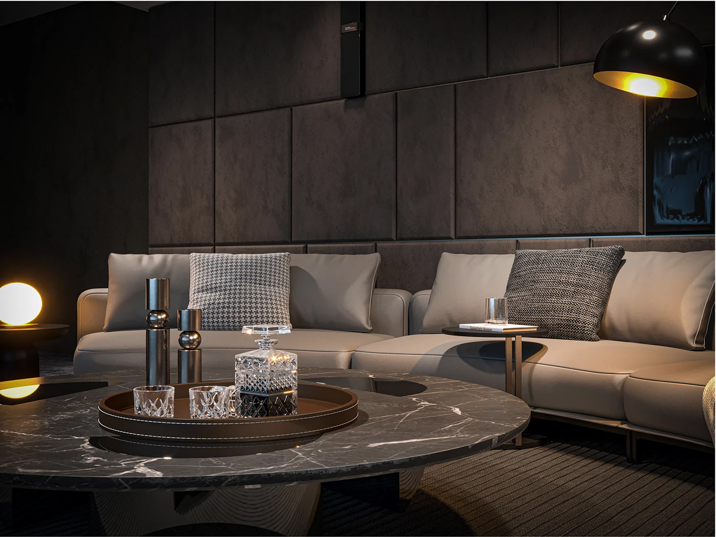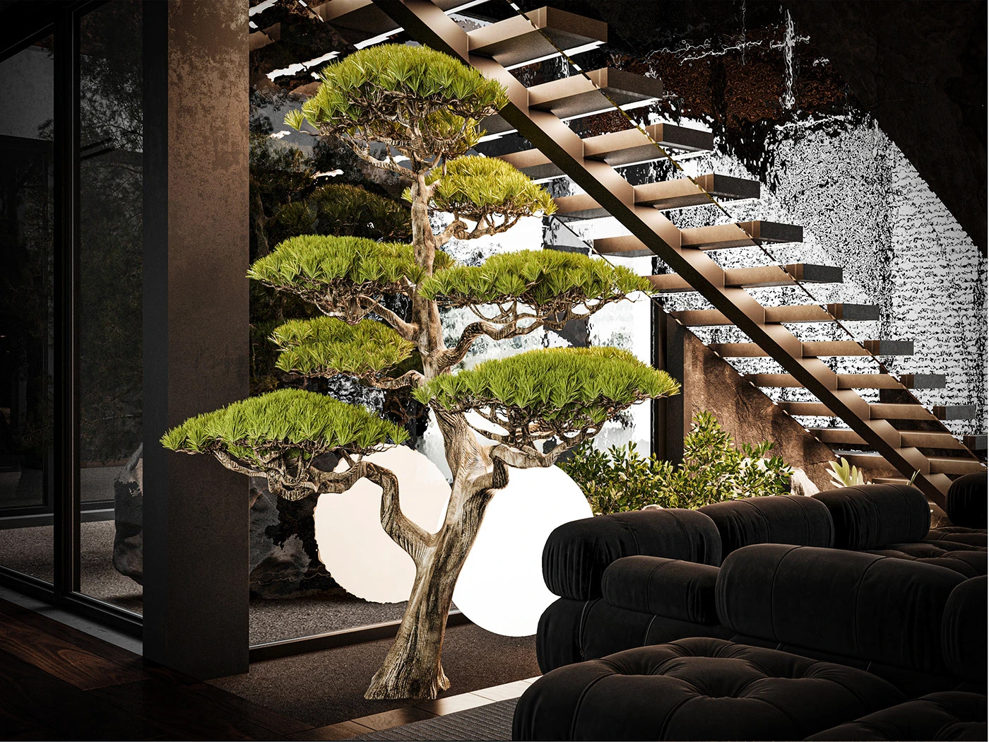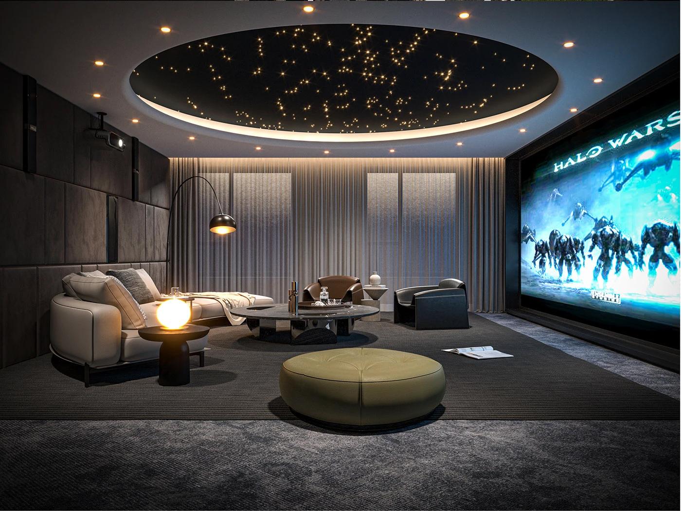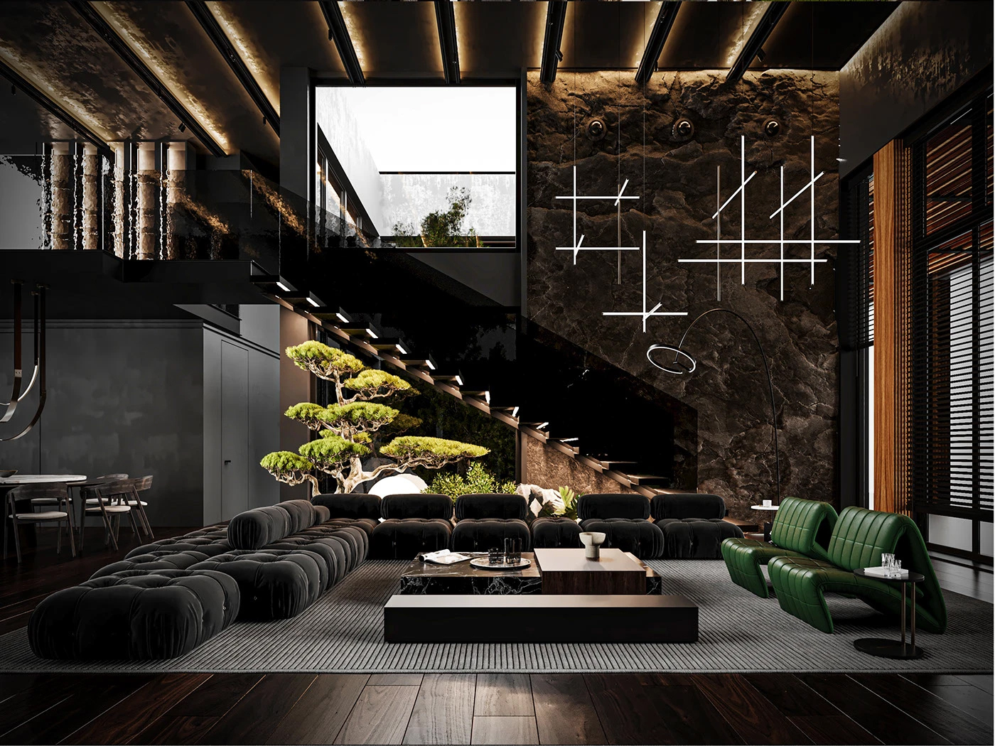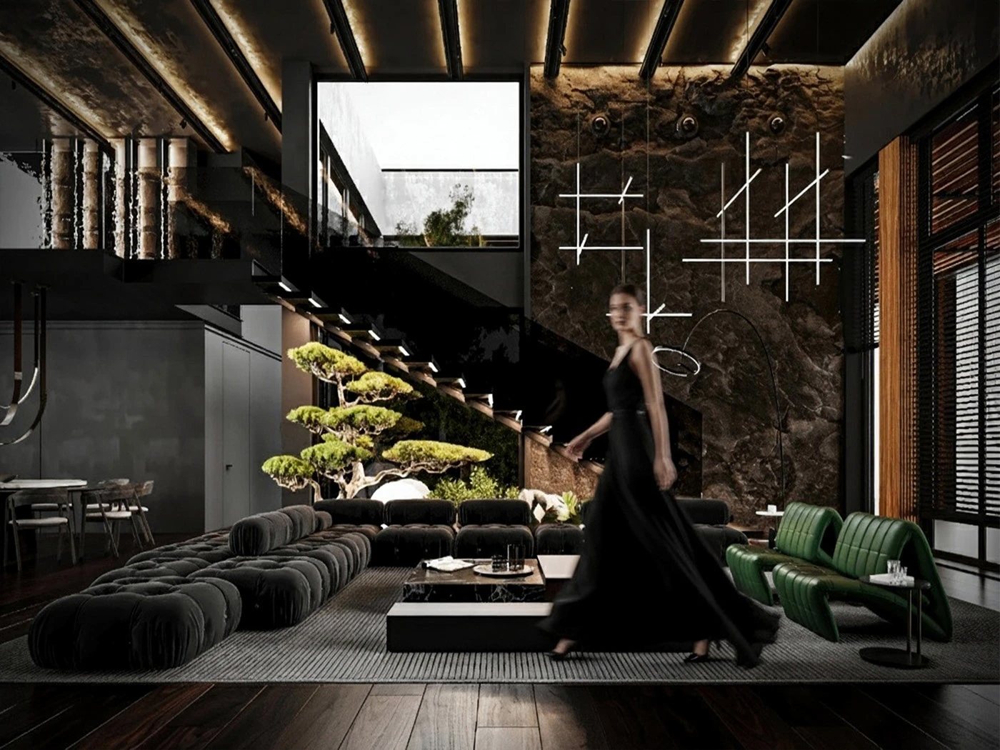 • 风格融合魔法:暗黑系的冷峻,撞上轻奢材质(金属线条、大理石、绒面家具)的精致,再嵌入自然盆景的生机,把 “现代极简的克制” 和 “艺术轻奢的张扬” 揉得恰到好处。客厅的挑高设计、影音室的星空顶,让空间既有 “豪宅的气场”,又有 “私人艺术馆的沉浸感”;