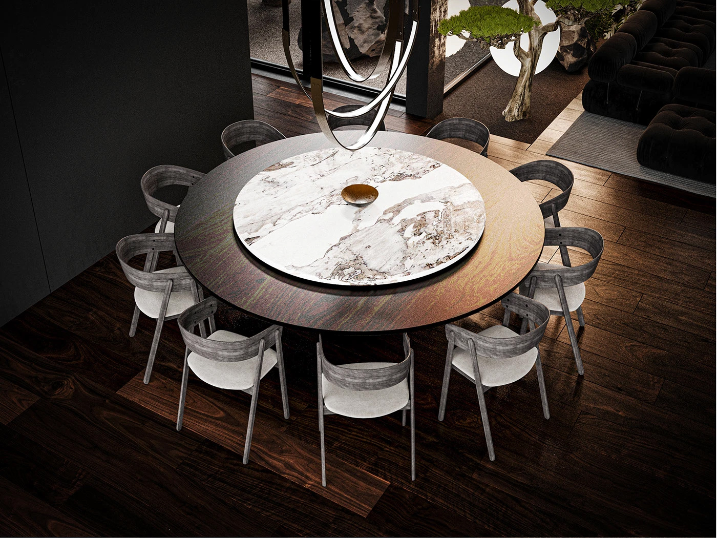 • 空间层次戏很足:挑高客厅的立体动线(楼梯、挑空区域)、影音室的沉浸式星空顶、餐厅的圆形大理石桌,每一处功能区都有 “专属设计语言”。灯光从顶部、墙面、地面多维度布局,让暗黑空间丝毫不会压抑,反而充满艺术叙事感。