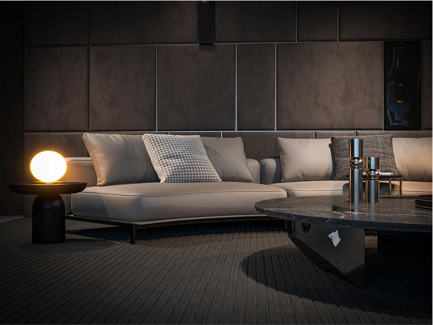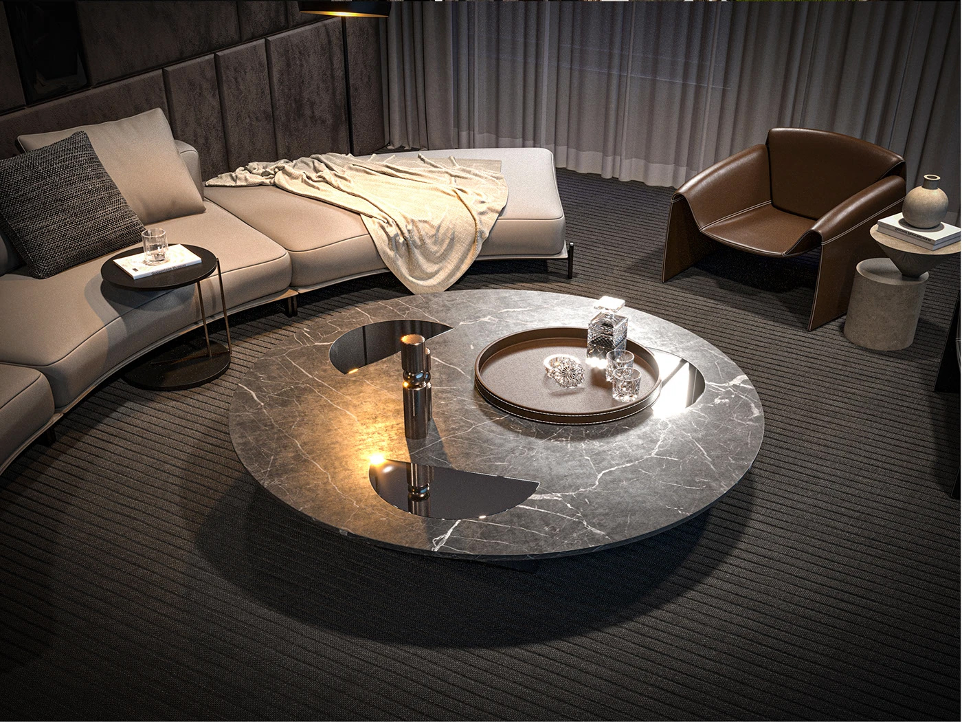 • 材质氛围杀:深色金属的冷硬、大理石的天然肌理、绒面沙发的温柔触感,搭配低饱和暗黑系配色,高级感直接拉满。尤其是光影在金属和石材上的折射,随手拍都是 “时尚杂志级大片”;