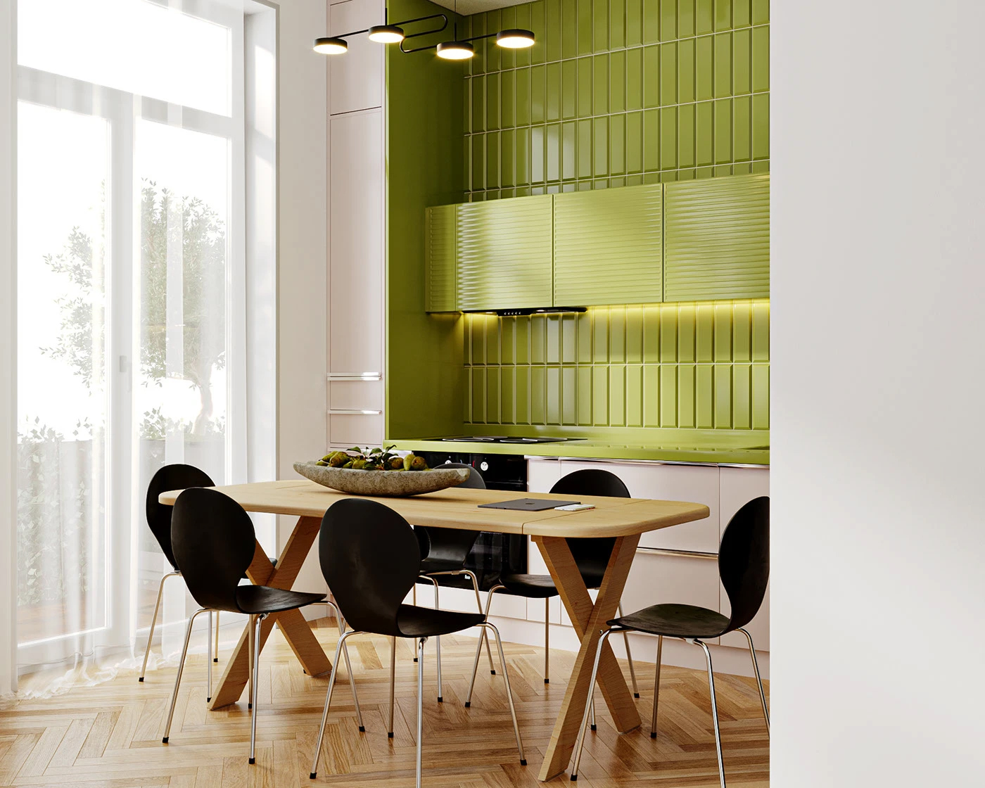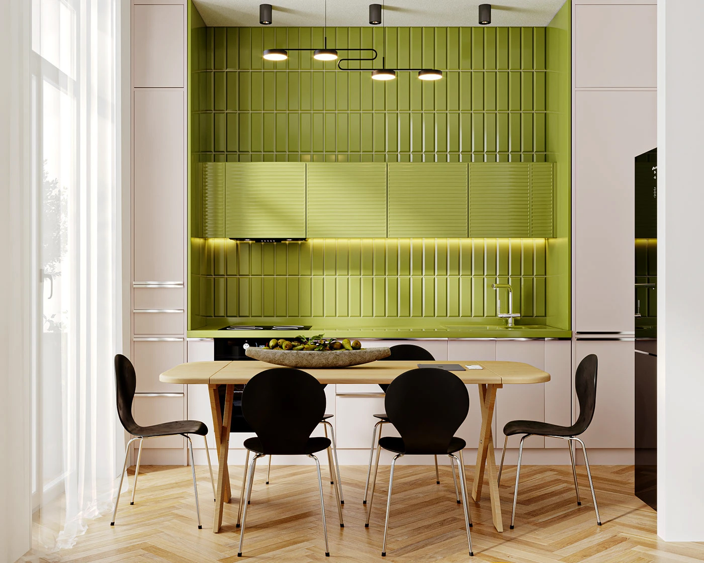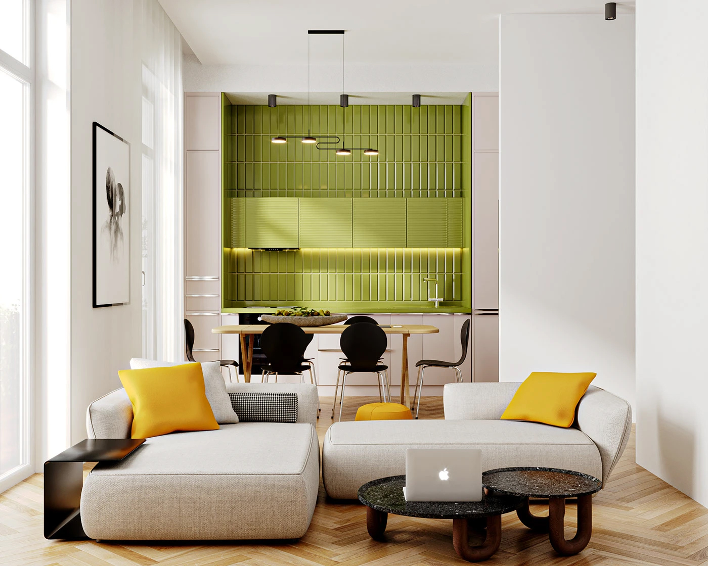 活力北欧风的设计太绝 —— 清新草绿的厨房像打翻的春天调色盘,明黄抱枕给空间注入阳光感,木质人字拼地板又带着北欧的温暖松弛,把 “色彩活力” 和 “极简舒适” 揉得恰到好处,在这待着,每天都像被阳光包裹✨