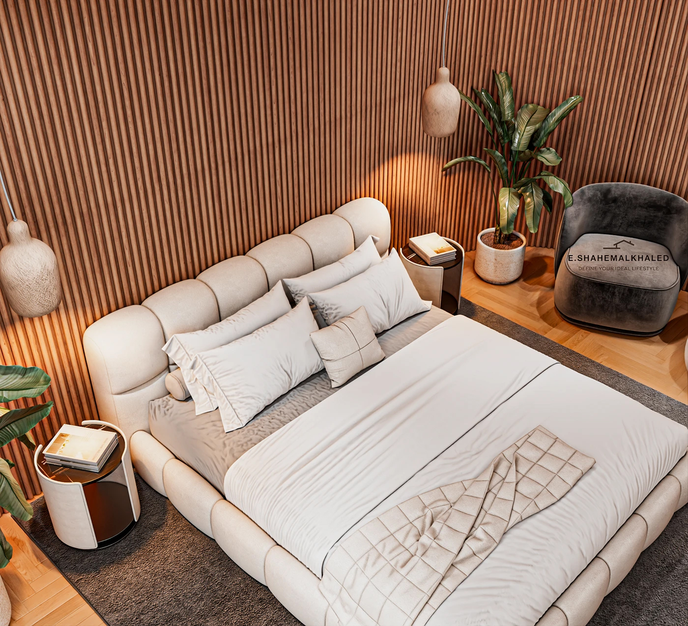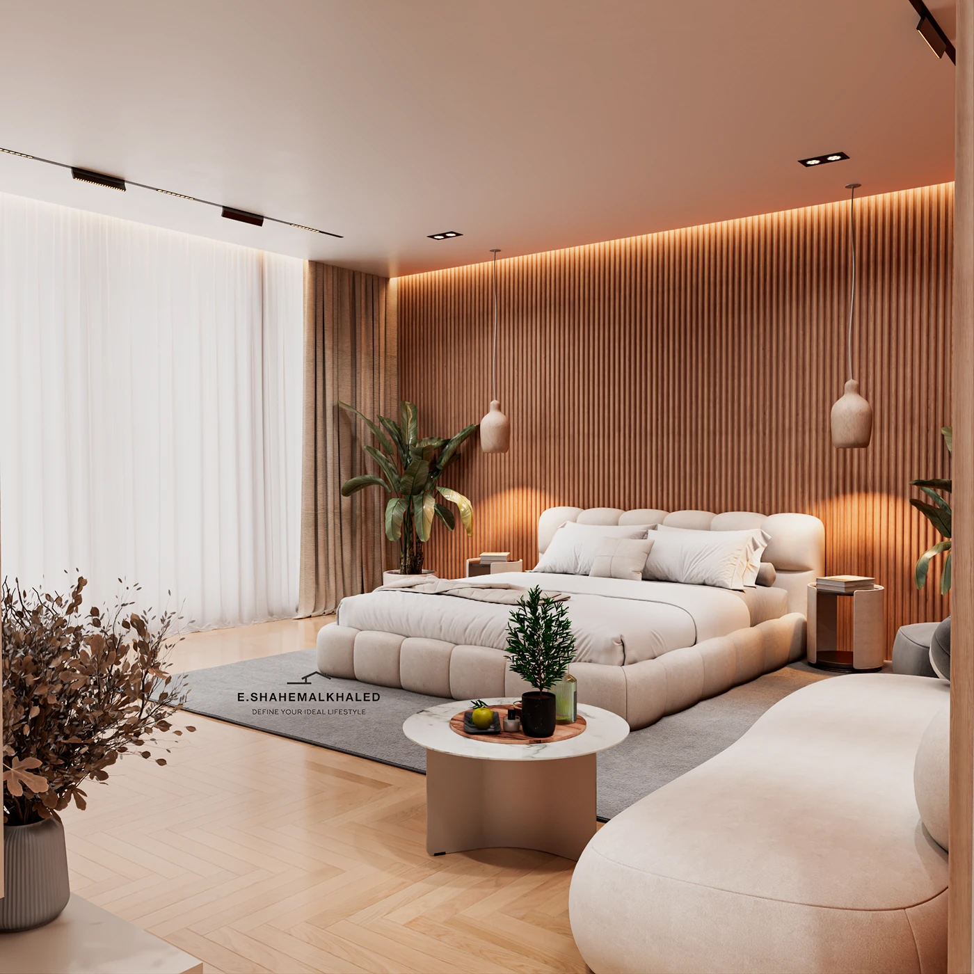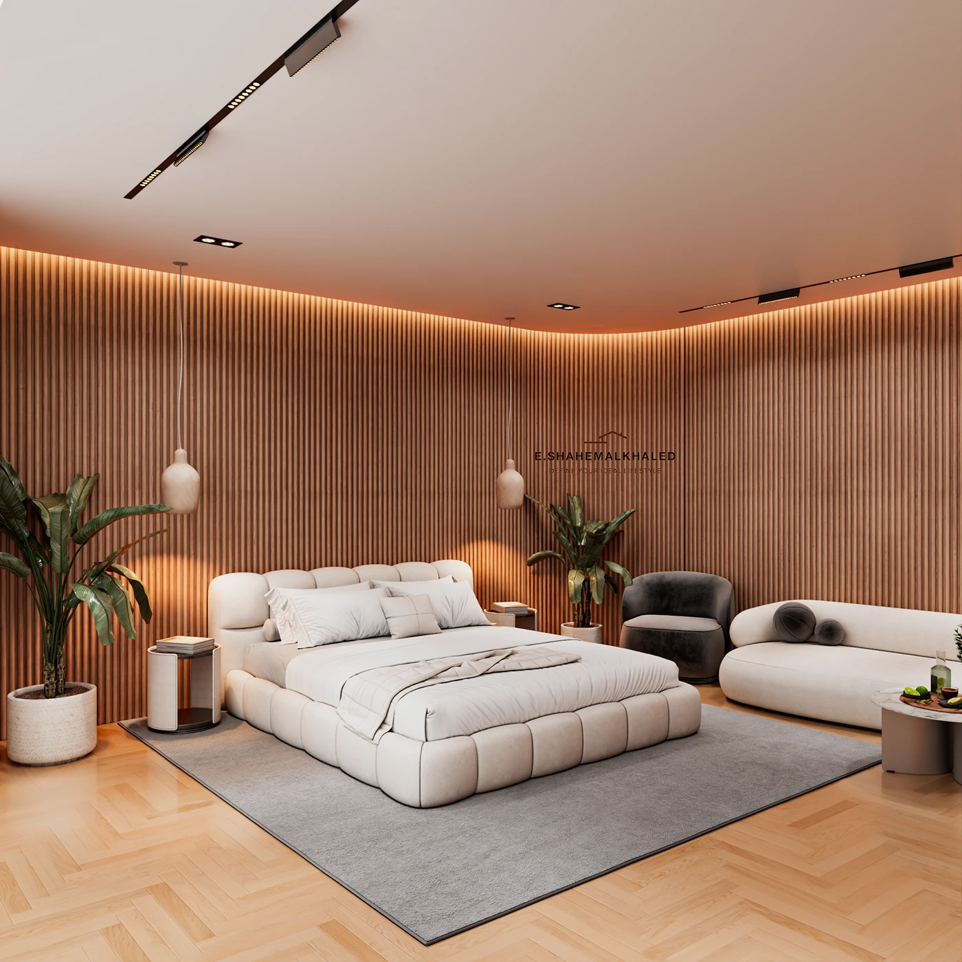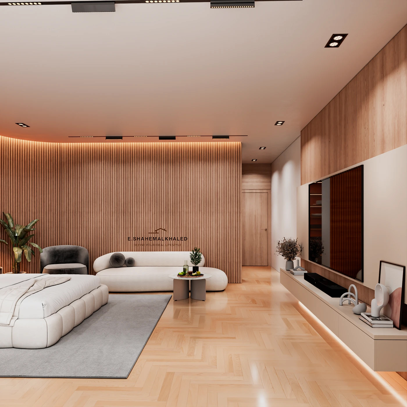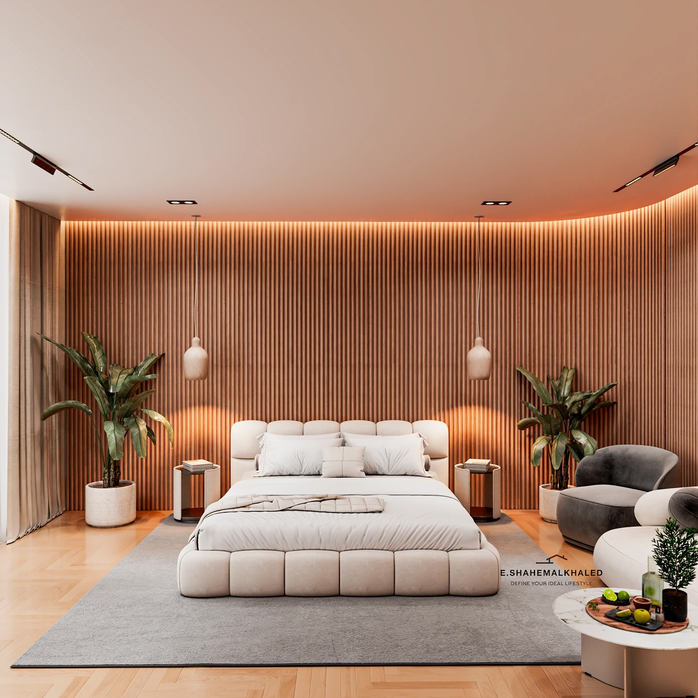 现代木质轻奢风的设计太绝 —— 木质护墙板的纹理如自然笔触,柔和灯光勾勒出奢华轮廓,绒面家具在光影里泛着高级质感,把 “自然温暖” 和 “轻奢精致” 揉得恰到好处,在这待着,每一秒都像被阳光与质感双重包裹✨