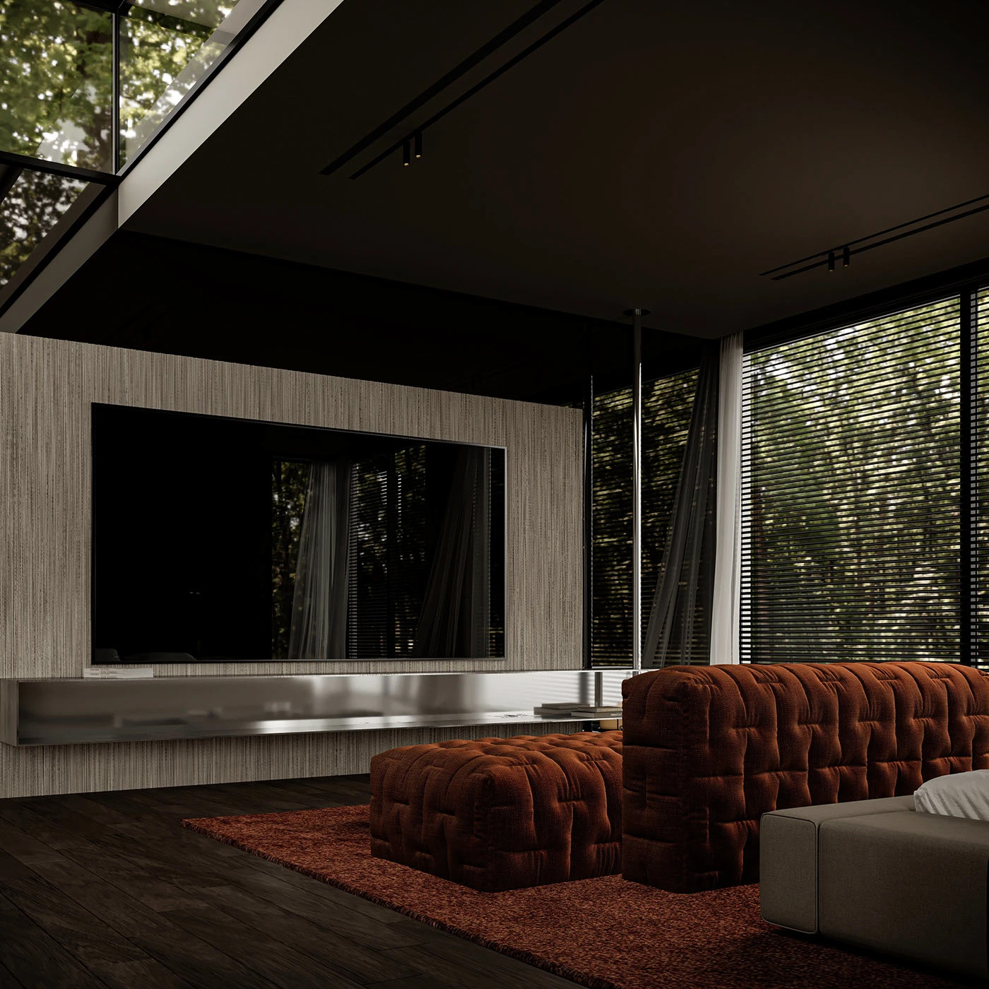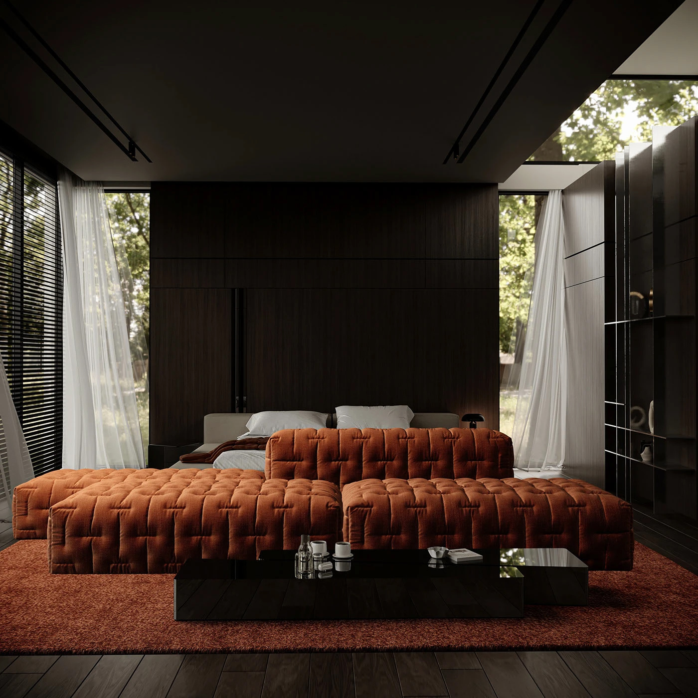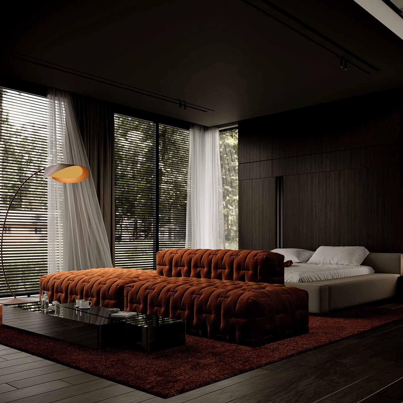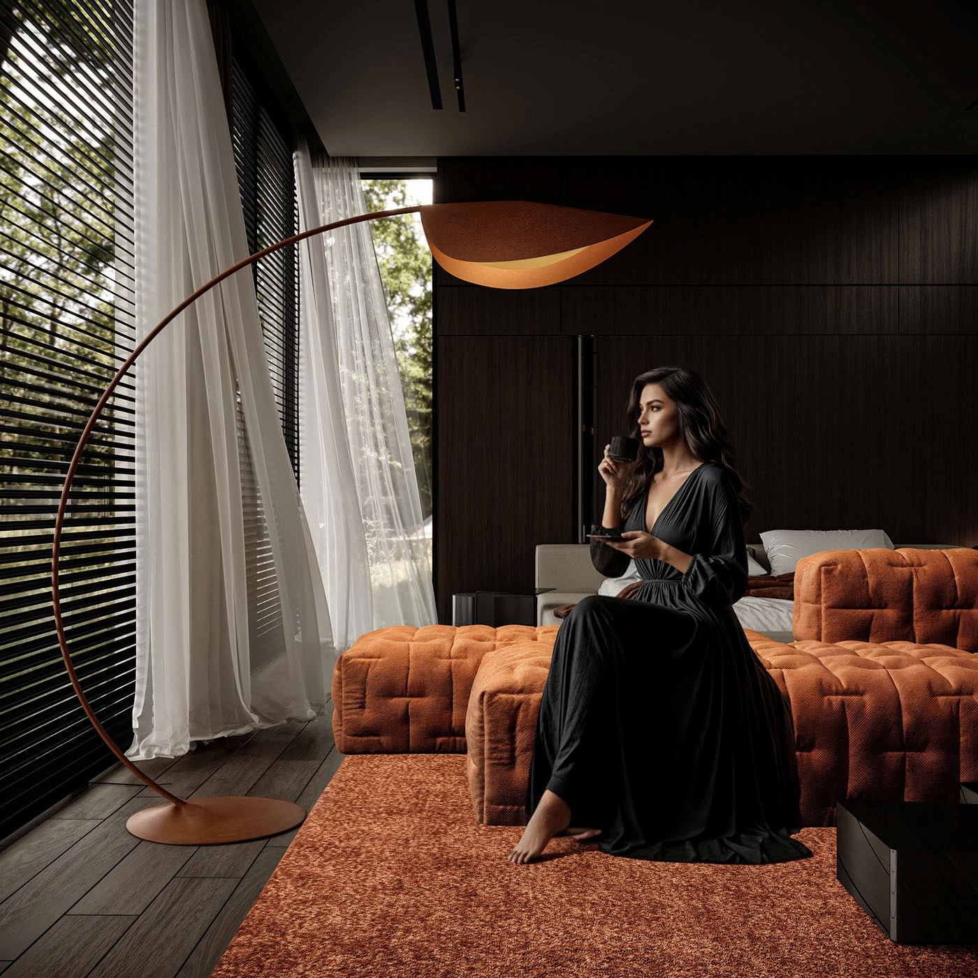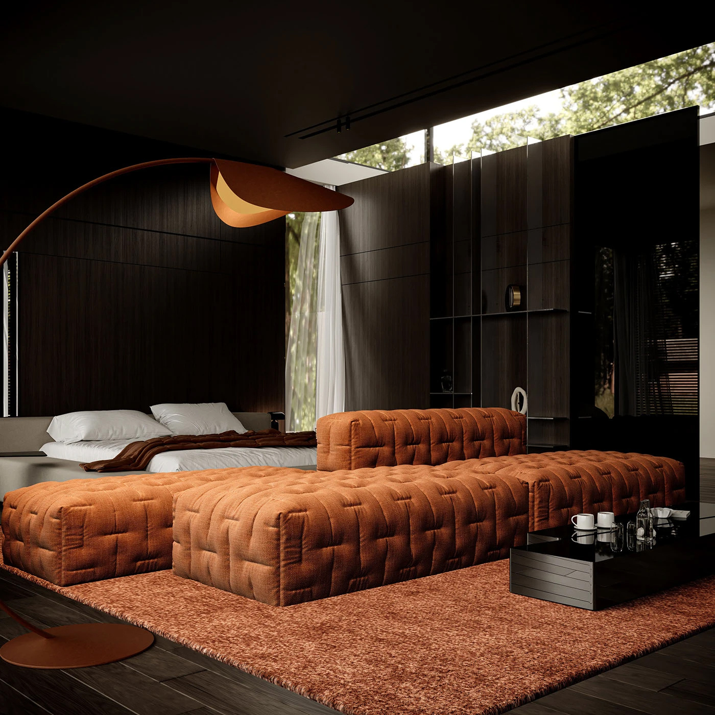 深木墙如质感画布,橙色绒面沙发似 “高级软糖”,弧线落地灯与窗外绿意呼应,将 “现代轻奢精致感” 和 “自然居所松弛感” 揉得恰到好处,待在这里每一秒都像拍家居杂志大片✨