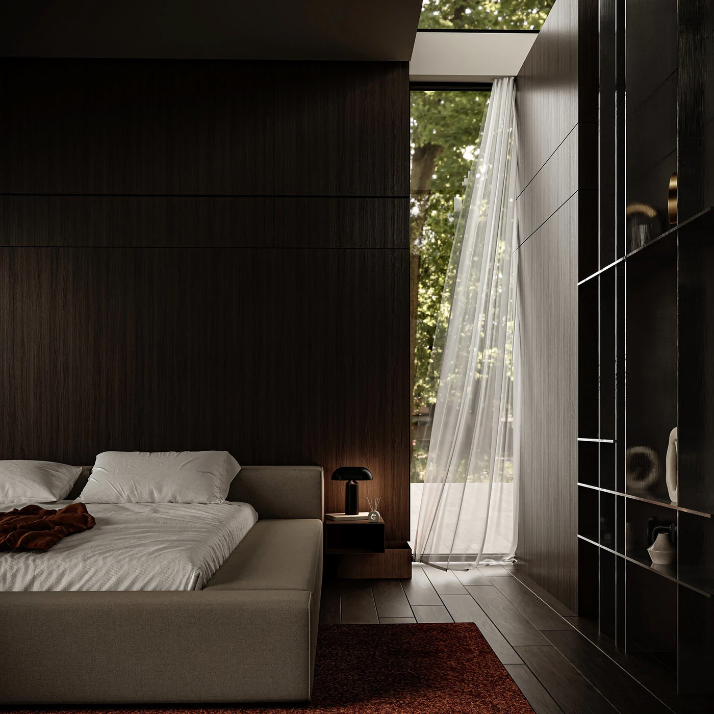 - 空间层次戏很足:开放式起居区串联卧室、客厅功能,深木元素贯穿全屋,橙色软装成视觉焦点,大窗引入绿意让空间透气,“高级感” 与 “烟火气” 平衡得刚刚好。