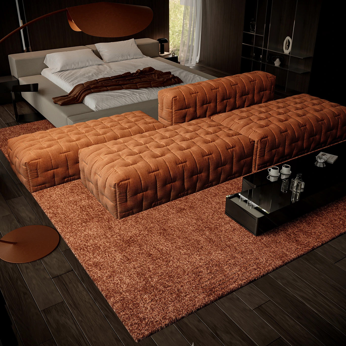 - 灯光氛围杀:弧线落地灯的焦点光、嵌入式灯的轮廓光、小台灯的氛围光层次交织,橙色灯体与绒面沙发呼应,轻奢感从细节满溢,随手拍都是高级感大片;