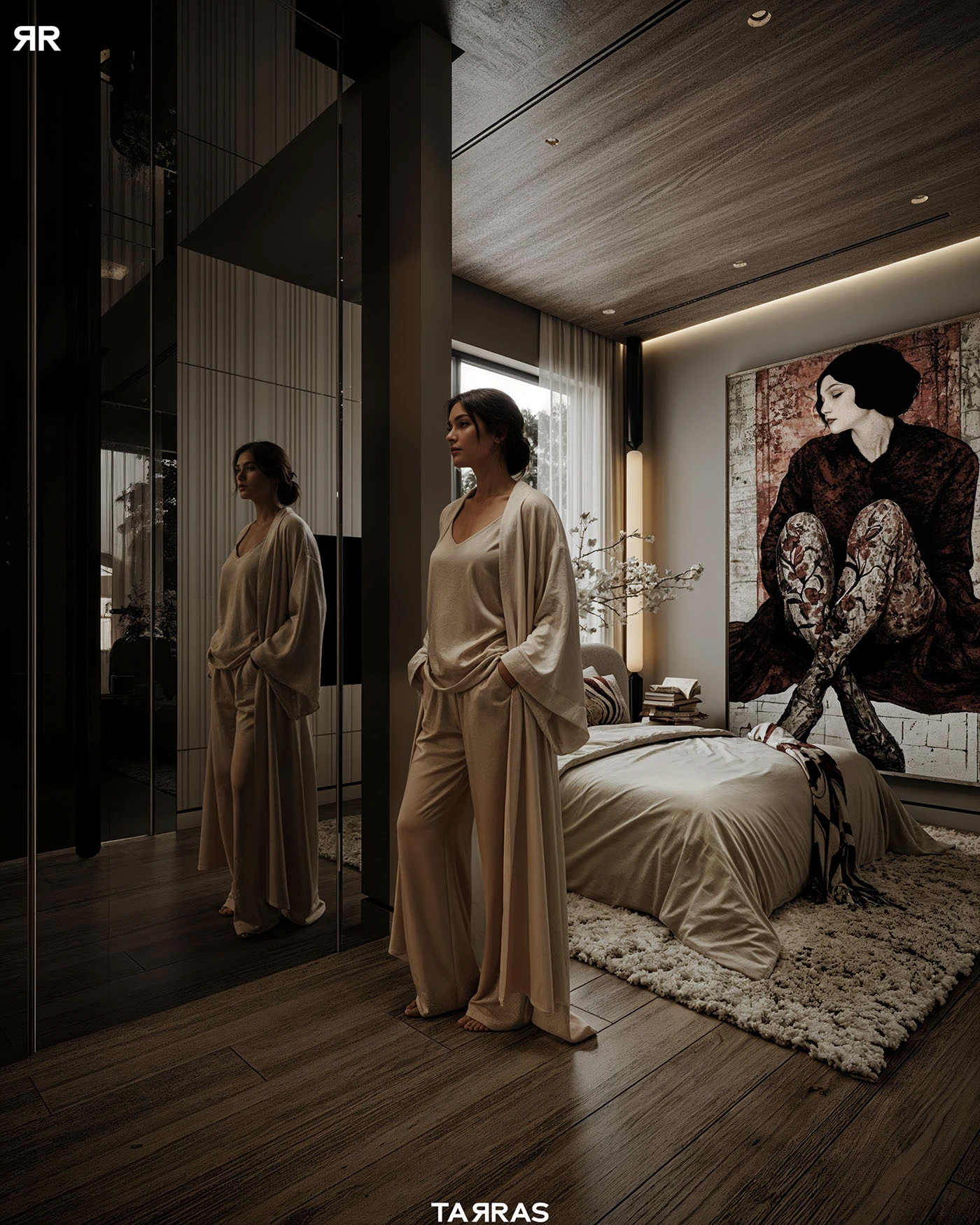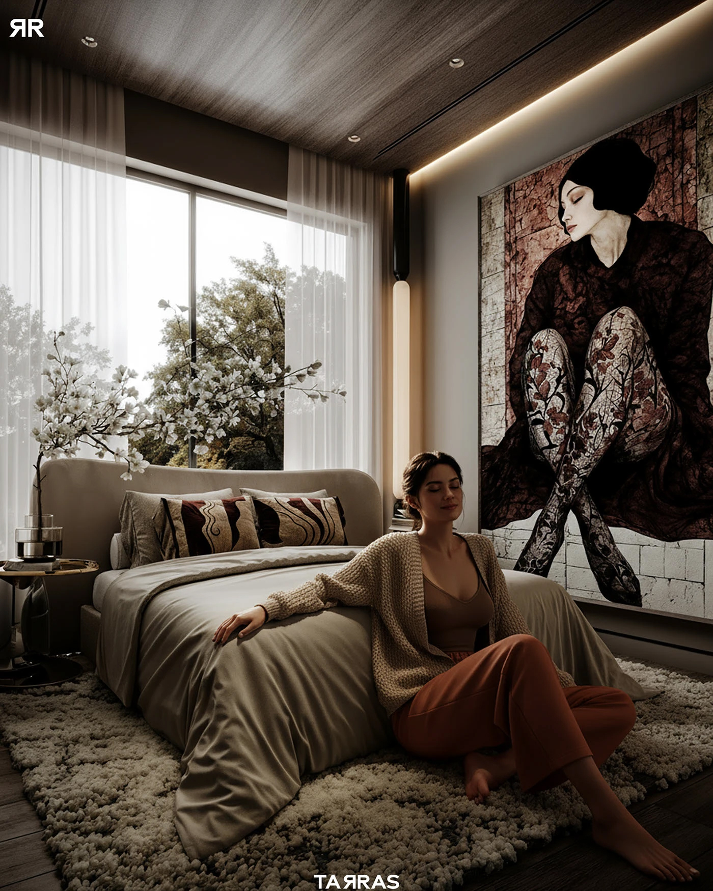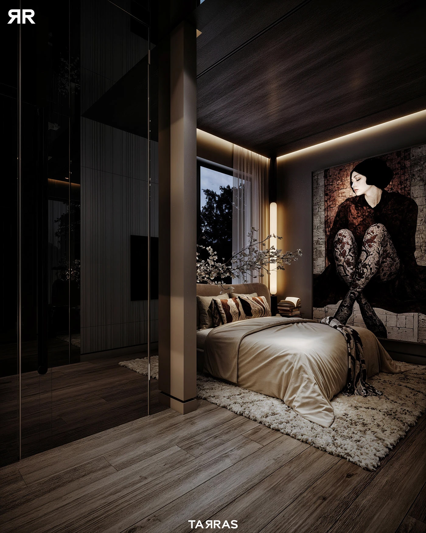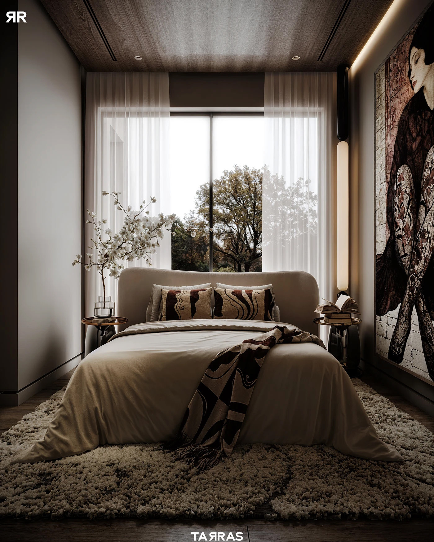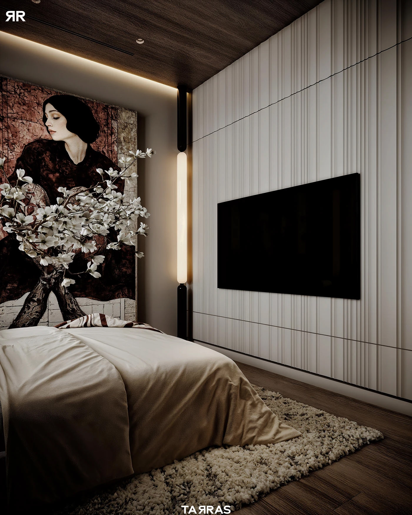 - 艺术化软装:从大幅人物挂画到花艺点缀,每一件软装都像艺术装置,把卧室变成 “可居住的美术馆”,日常起居都充满仪式感。