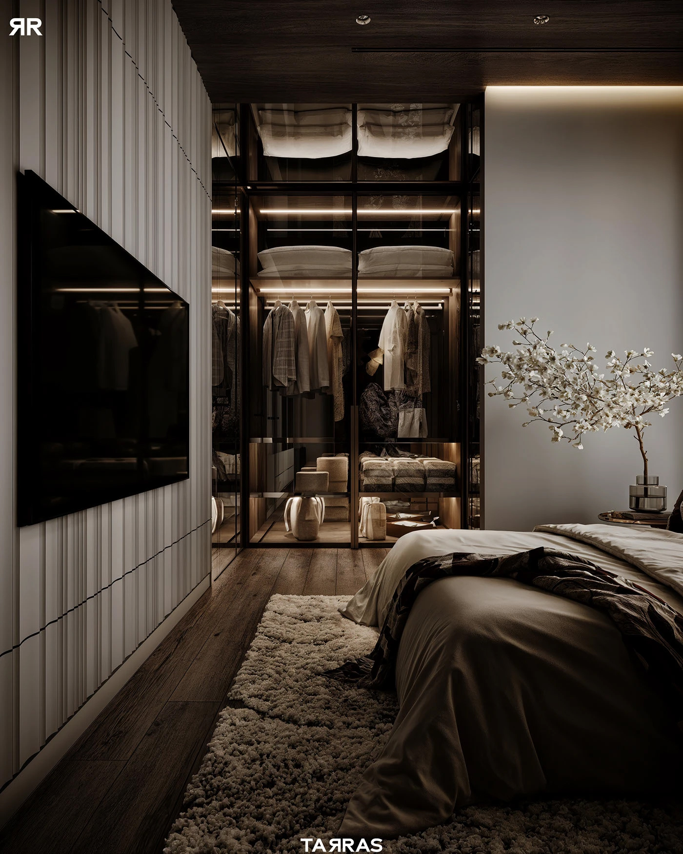 - 材质魔法:木质天花板的自然纹理、绒面床品的亲肤质感、金属边几的冷冽光泽,每一处材质混搭都透着 “高级感的小心机”。尤其是玻璃衣柜的通透设计,让收纳区也成了 “艺术展示区”;