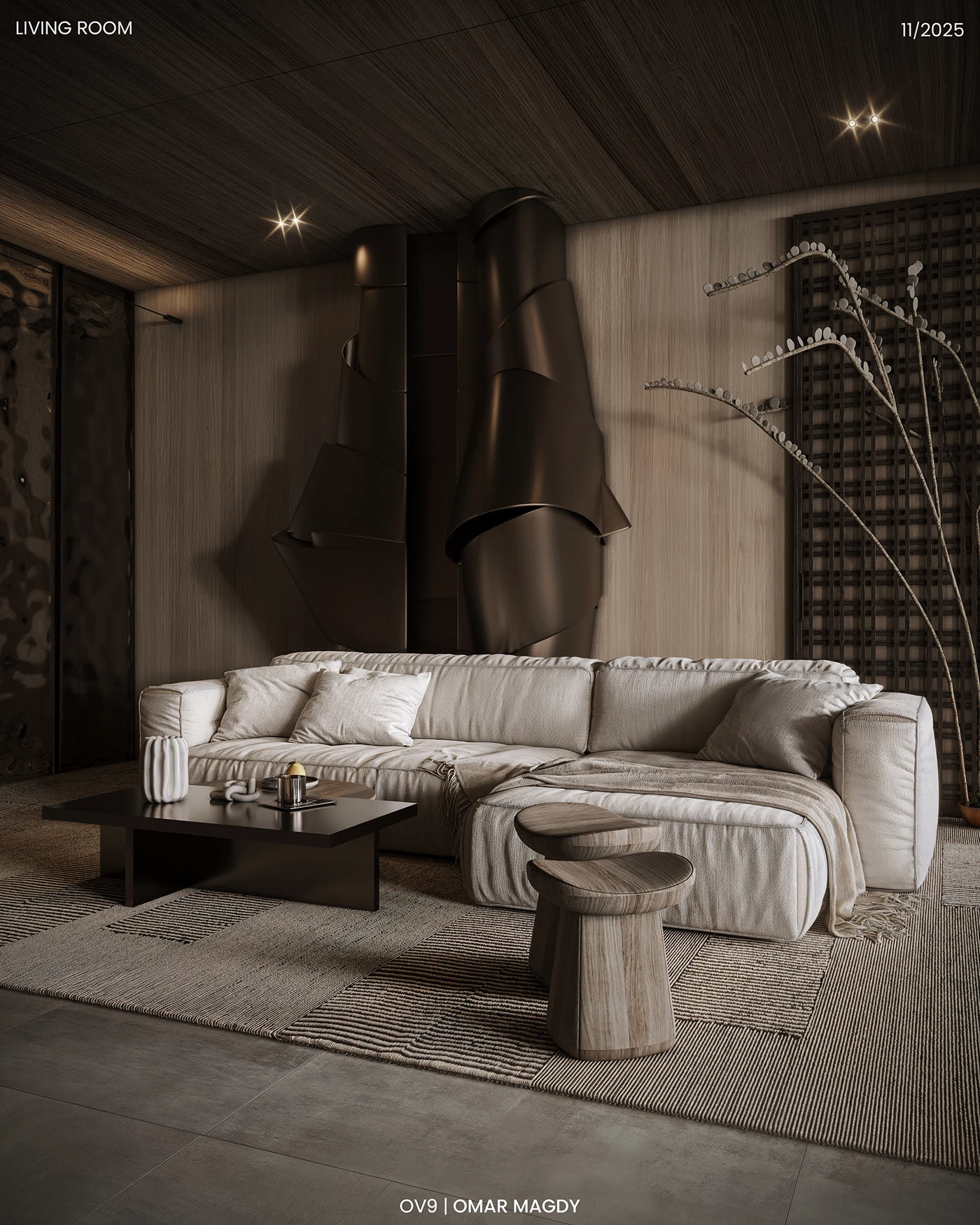 一踏入这个客厅就被拿捏!自然木质的温润撞上金属雕塑的冷冽,柔软布艺沙发搭配艺术感布艺墙,把 “现代极简的克制” 和 “侘寂自然的松弛” 揉得恰到好处,每一处都透着高级又治愈的居住哲学✨