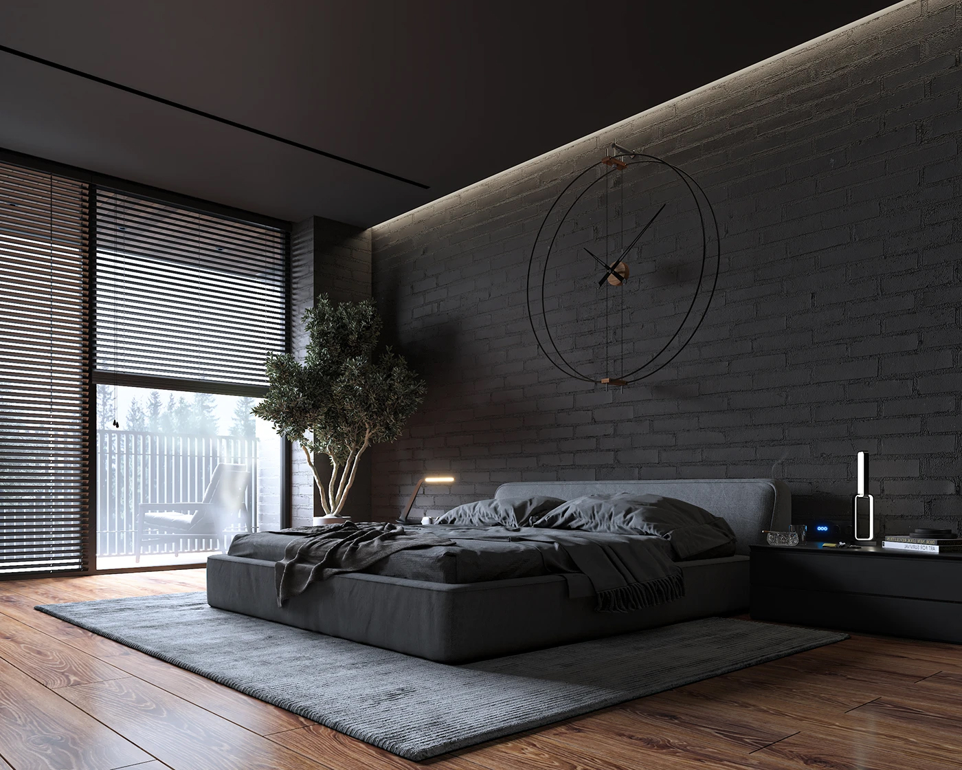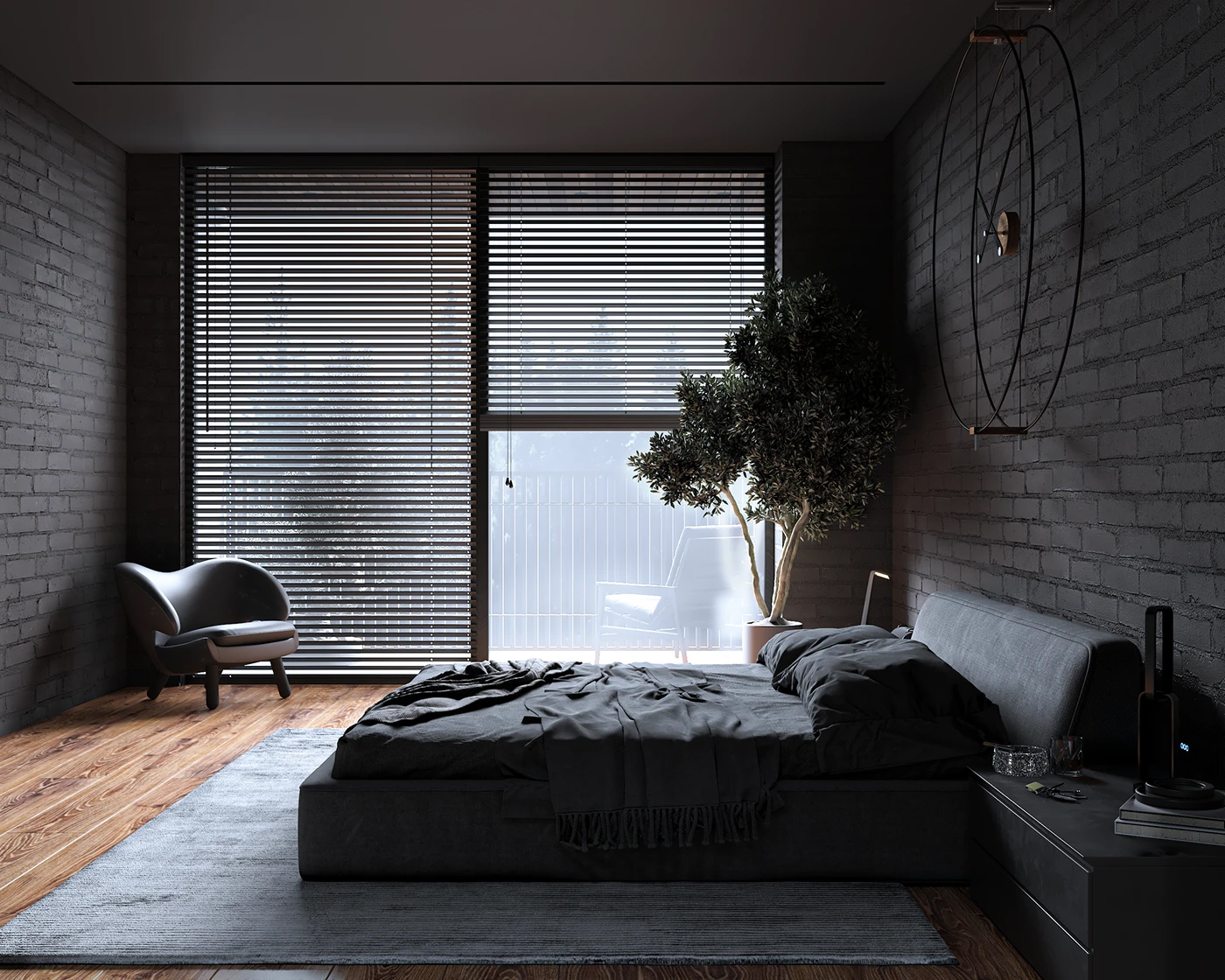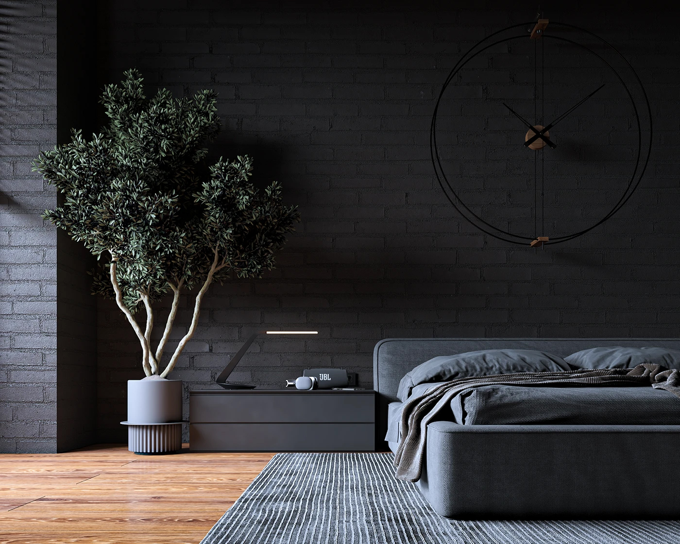 最绝的是那棵橄榄树,往角落一放,直接把自然的松弛气怼进冷硬工业风里,深灰、哑光黑、浅木色的低饱和配色闭环,每一眼都是 “不乱却有细节” 的高级。