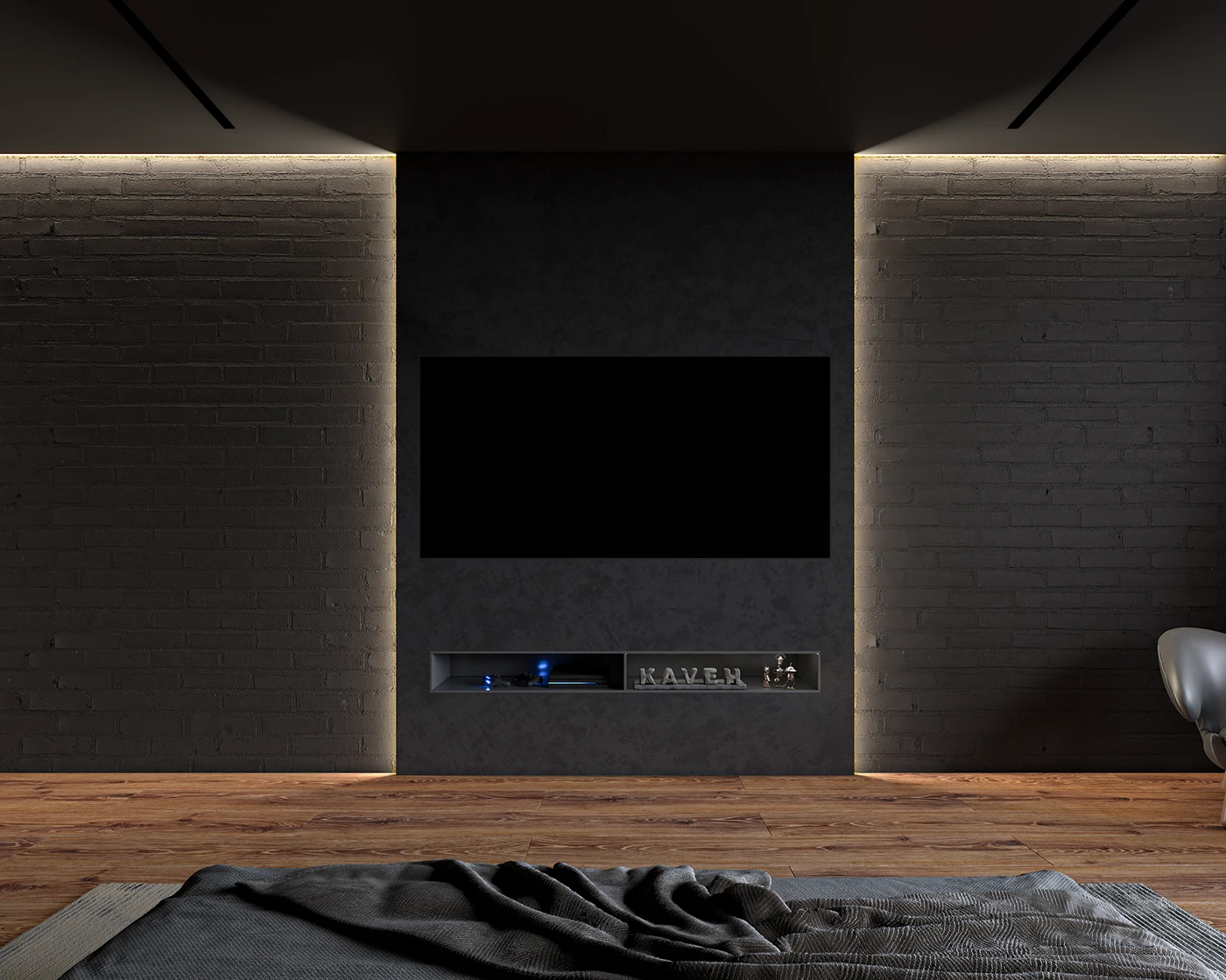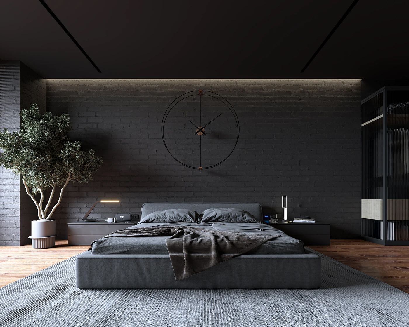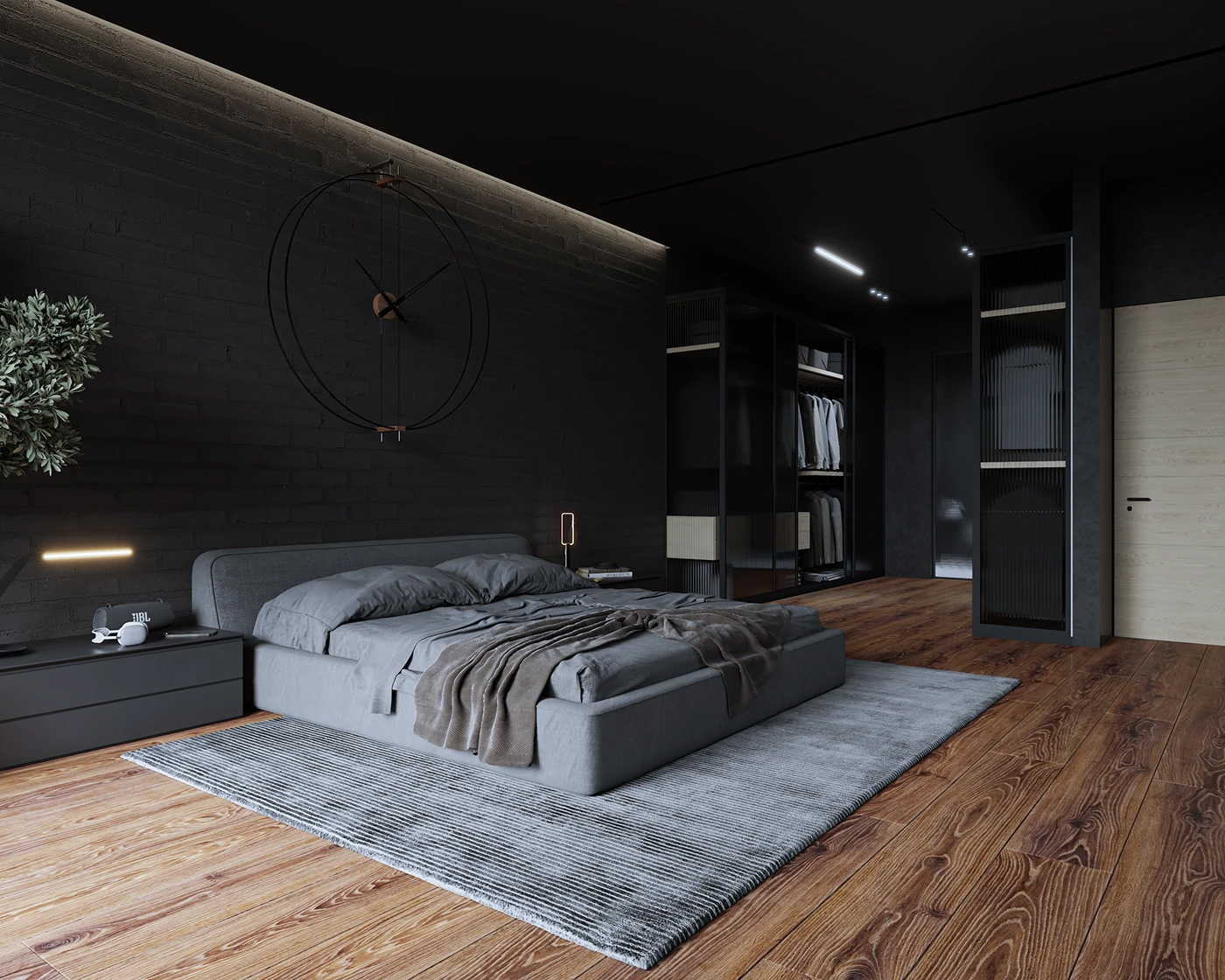 推开门就被裹进深灰肌理砖墙的氛围里 —— 粗粝的工业质感自带沉静 buff,配上哑光黑的极简柜体,冷硬里却没半分压抑;无主灯 + 线性灯的组合太妙了,藏在顶边的光顺着墙面漫开,把砖墙的肌理揉得温温柔柔,连床品的绒面质感都被衬得更软了。