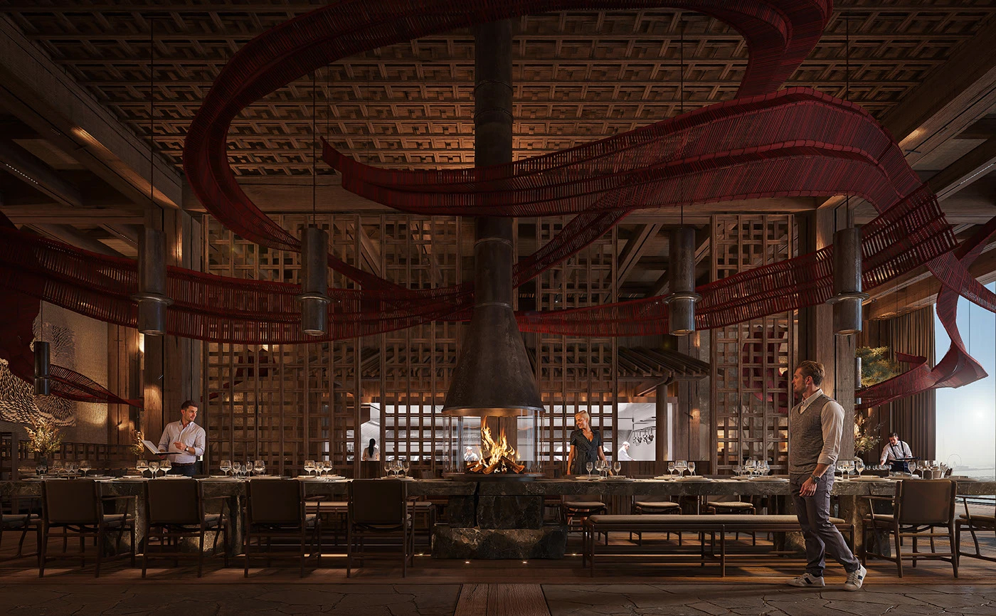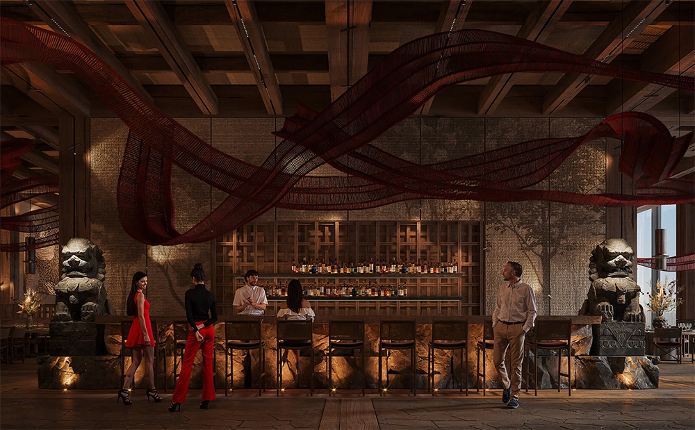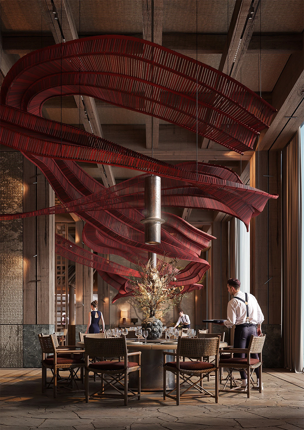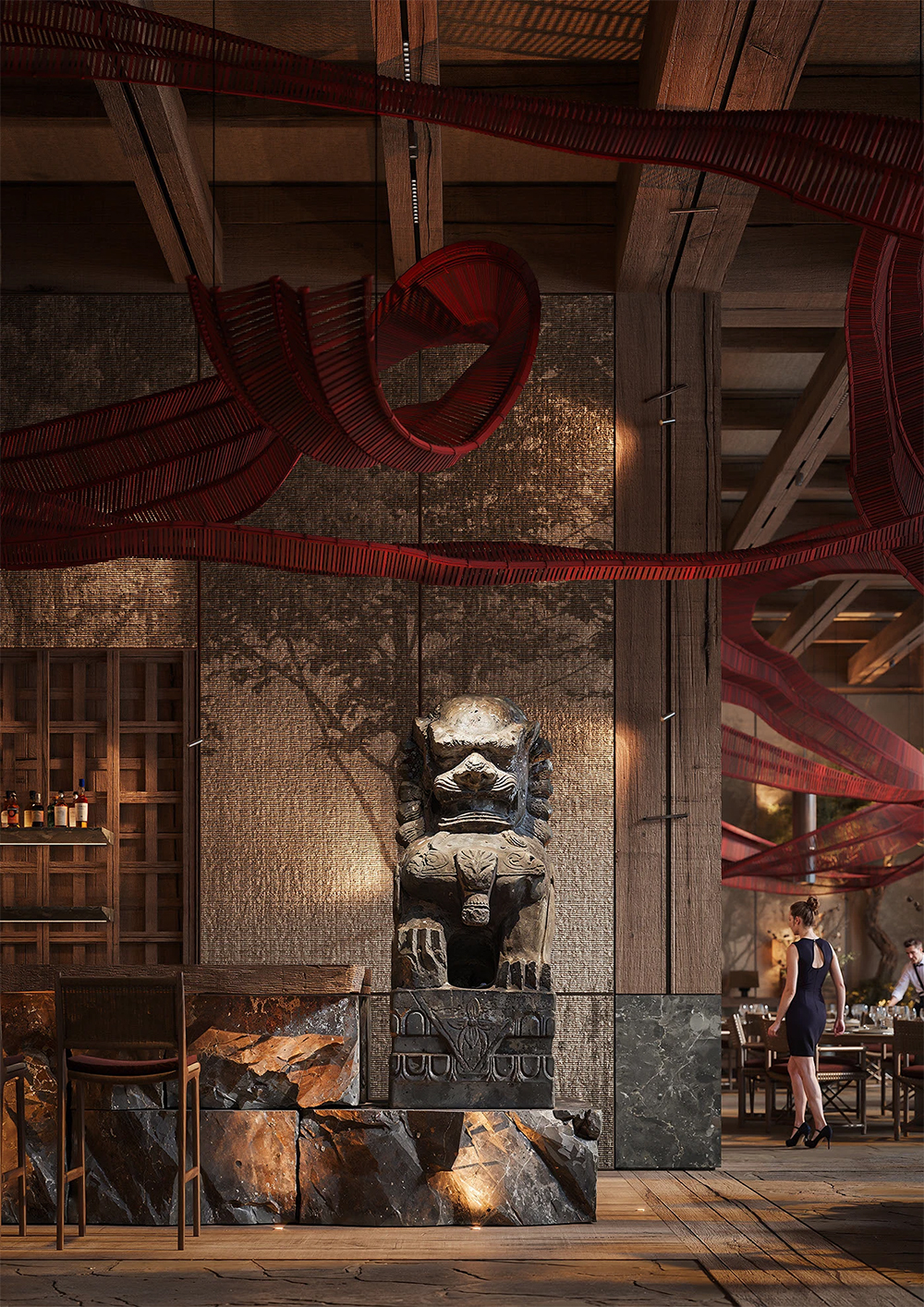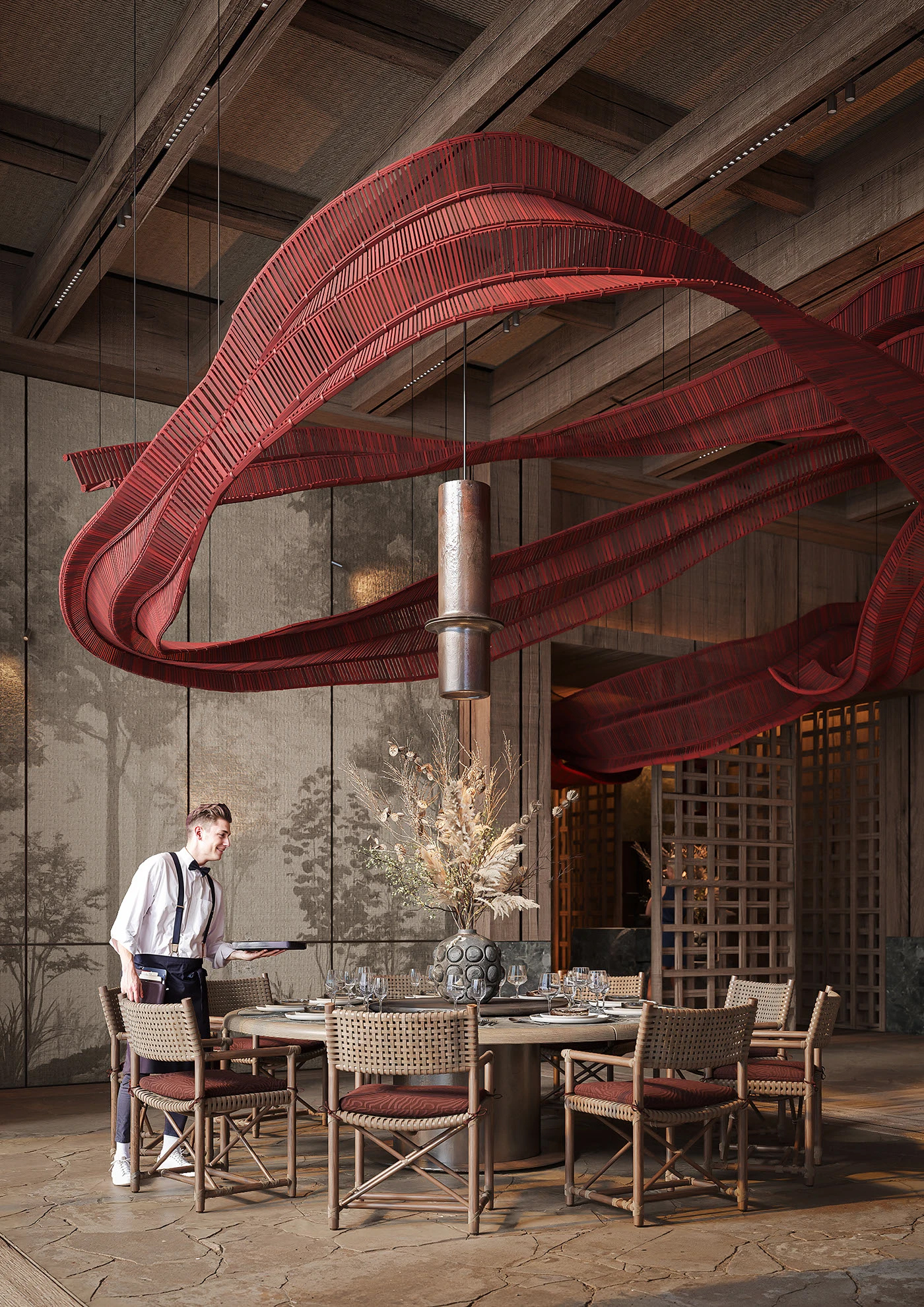 这是 “新中式 + 现代艺术装置” 的混搭风:抓准传统符号(石狮子、木构格栅)立住文化底色,用现代艺术装置(红色流线编织)打破沉闷,再用糙石、暖木、柔织的材质反差做层次,传统不古板,现代不疏离,每处都藏着 “刚柔碰” 的巧思。