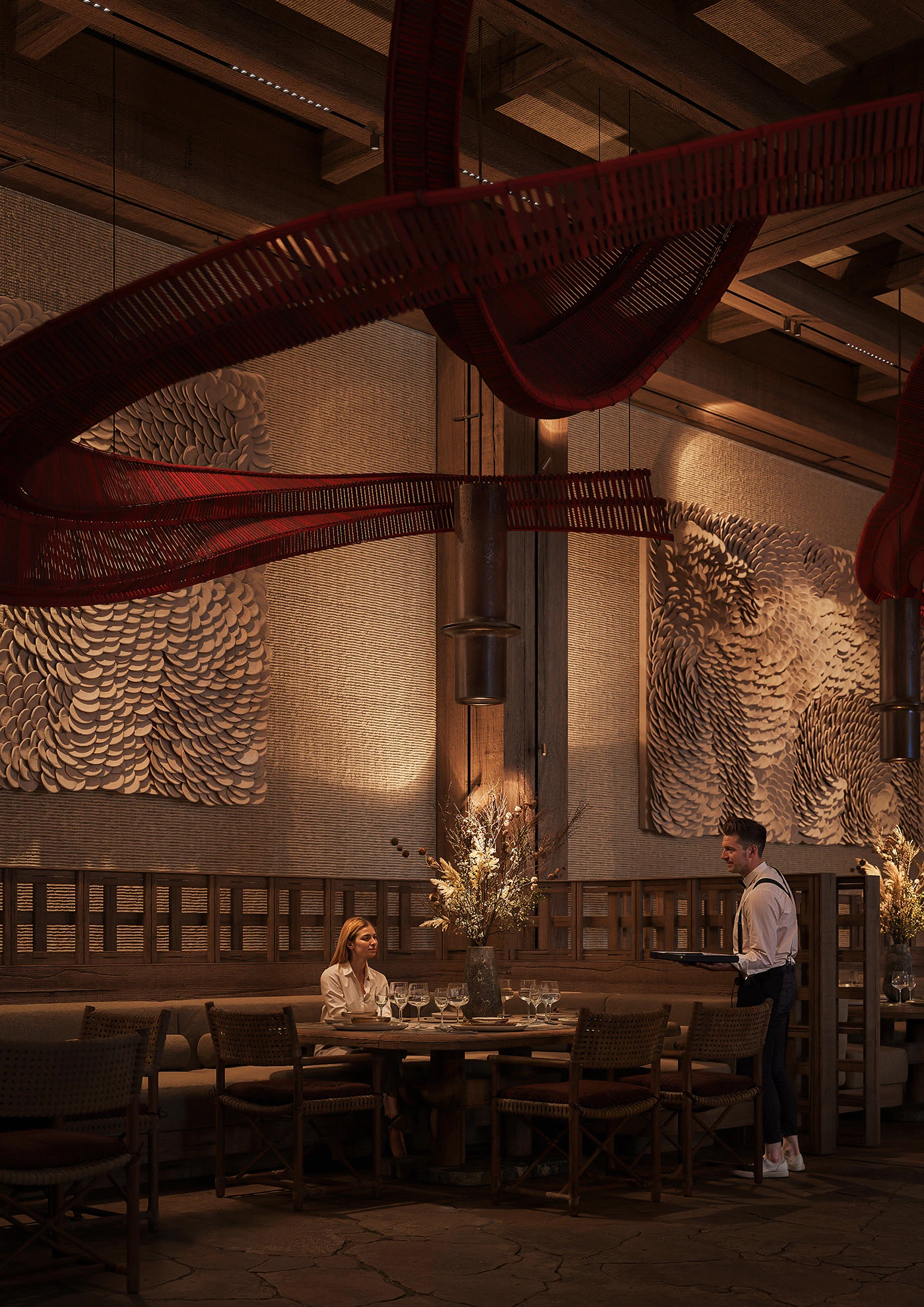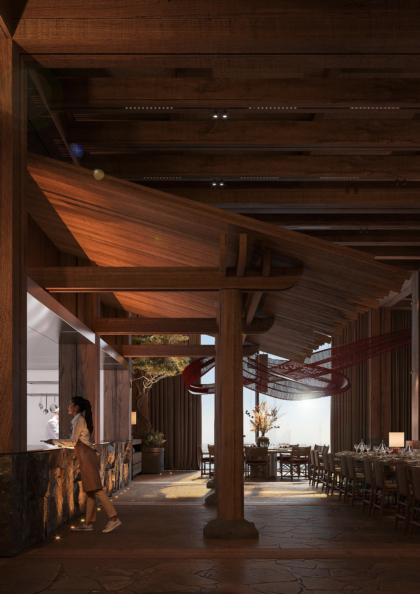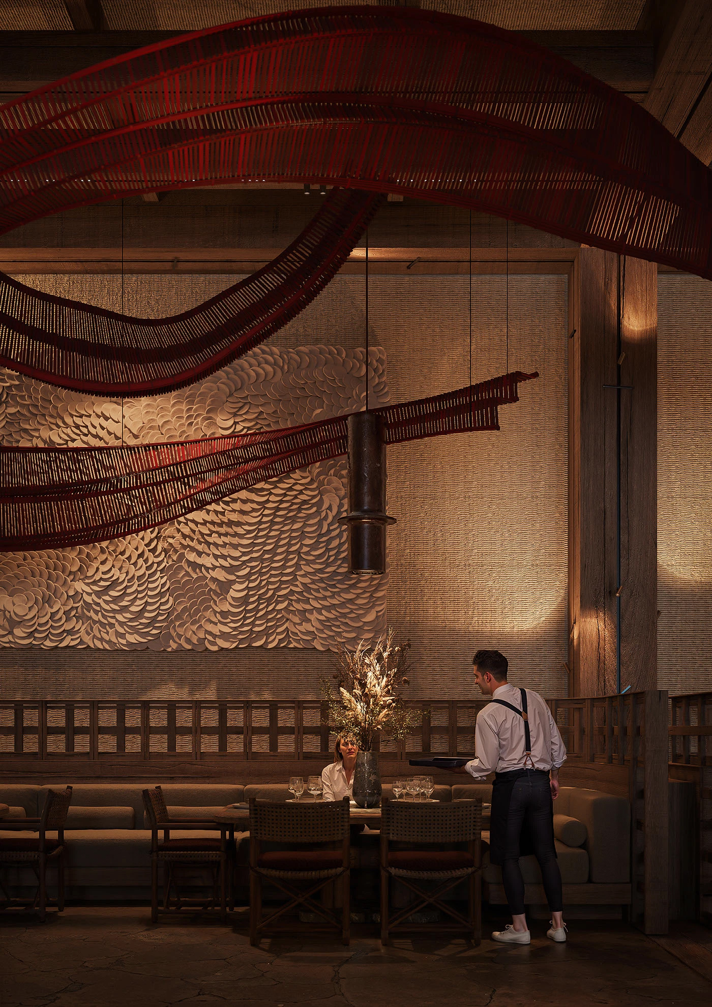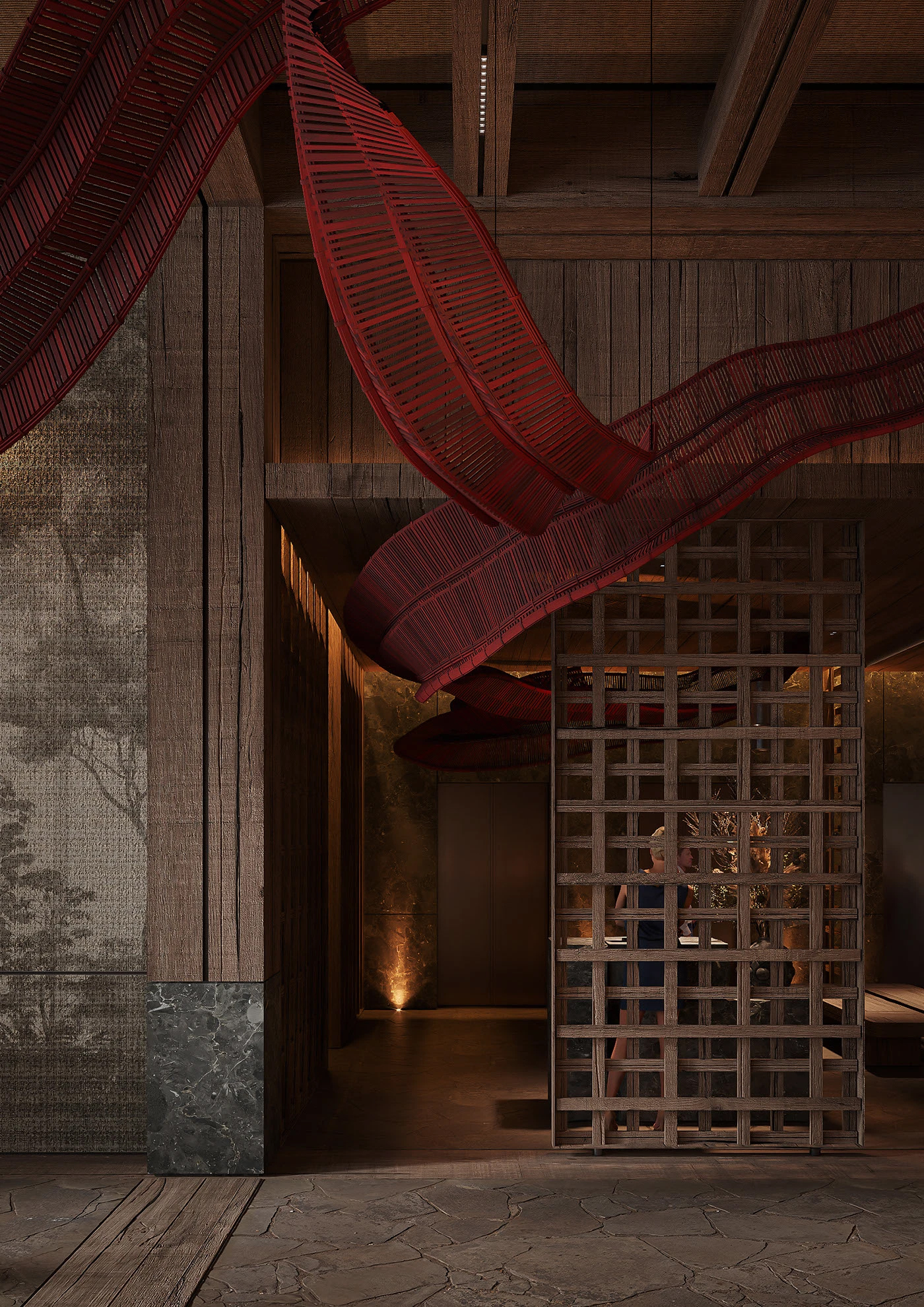 石狮子的古拙沉在糙石基座上,抬头是红绸似的流线装置飘在木构顶下 —— 传统的 “稳” 和现代的 “柔” 撞得刚好,连原木格栅漏出来的光,都裹着糙石的冷和暖木的温,坐下来连呼吸都慢了半拍。