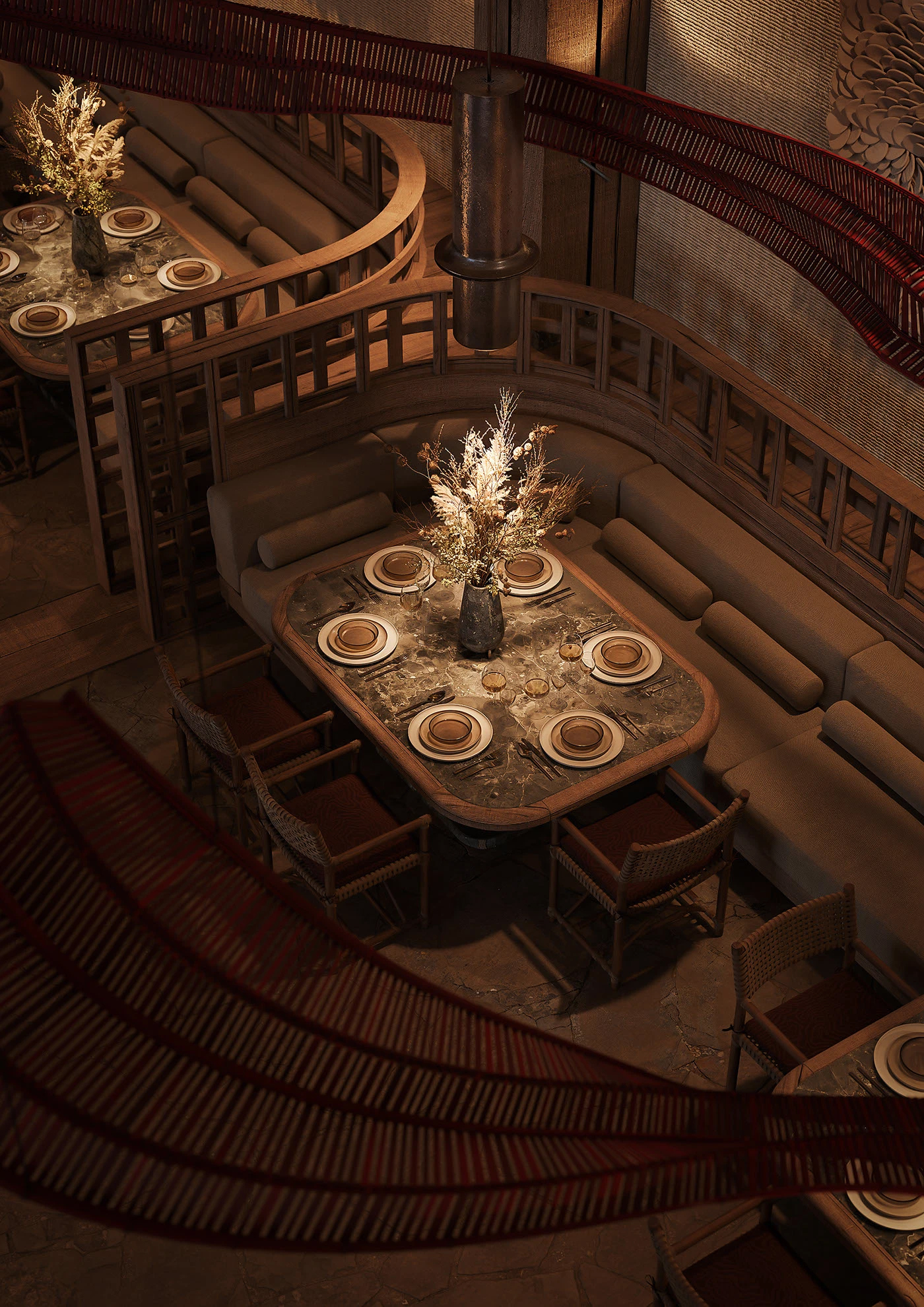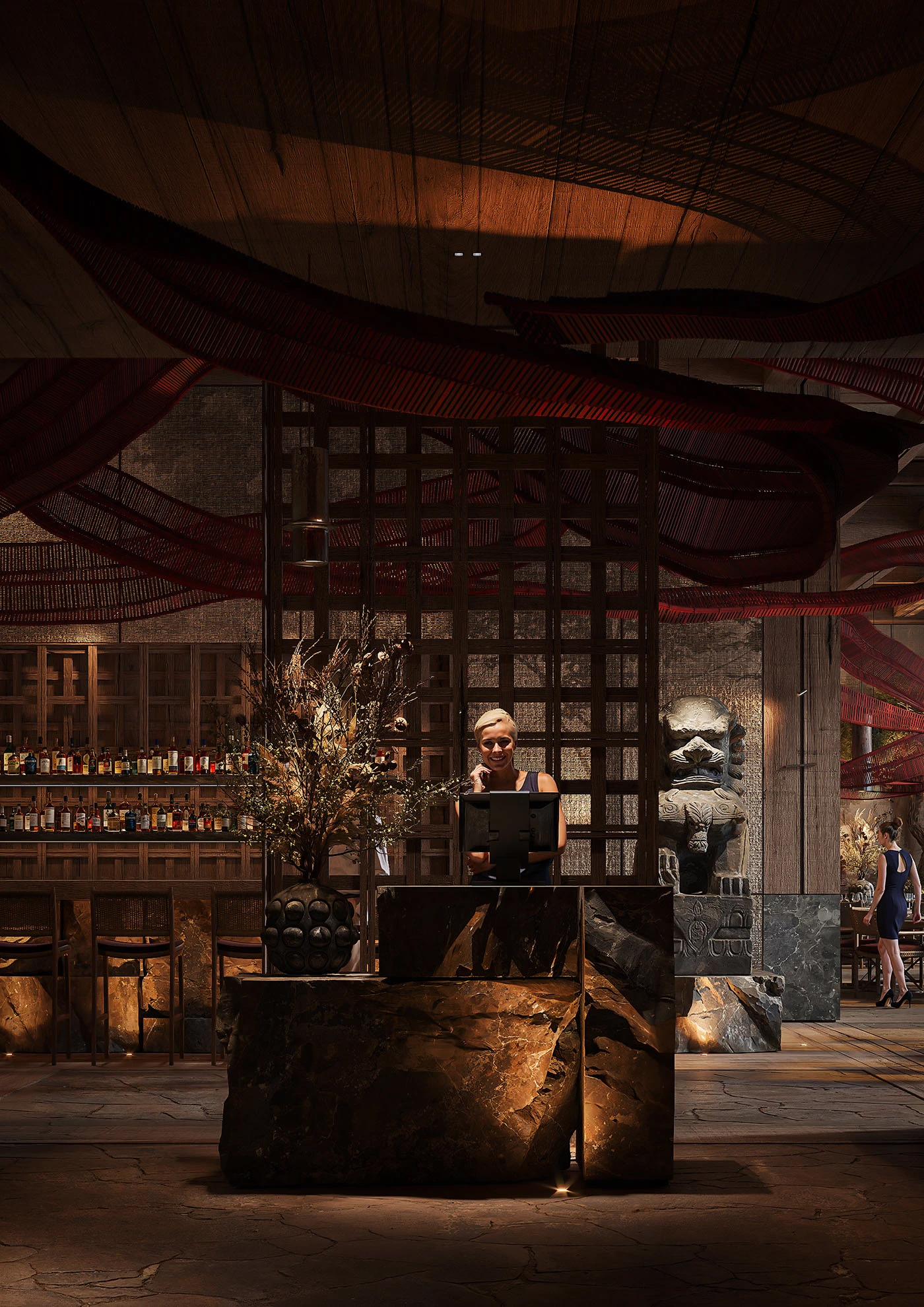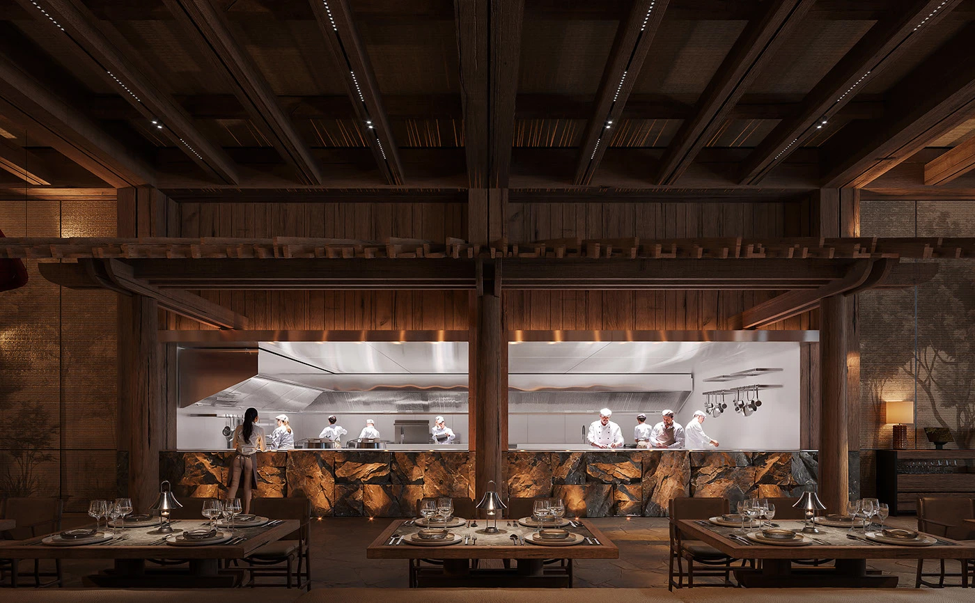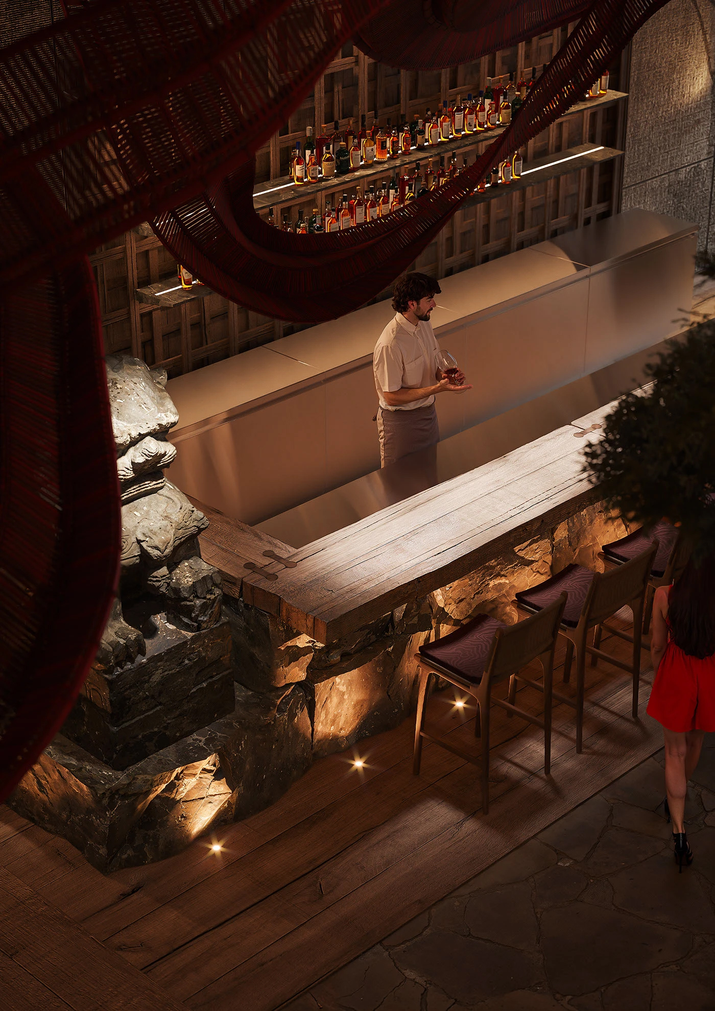 石狮子的古拙沉在糙石基座上,抬头是红绸似的流线装置飘在木构顶下 —— 传统的 “稳” 和现代的 “柔” 撞得刚好,连原木格栅漏出来的光,都裹着糙石的冷和暖木的温,坐下来连呼吸都慢了半拍。