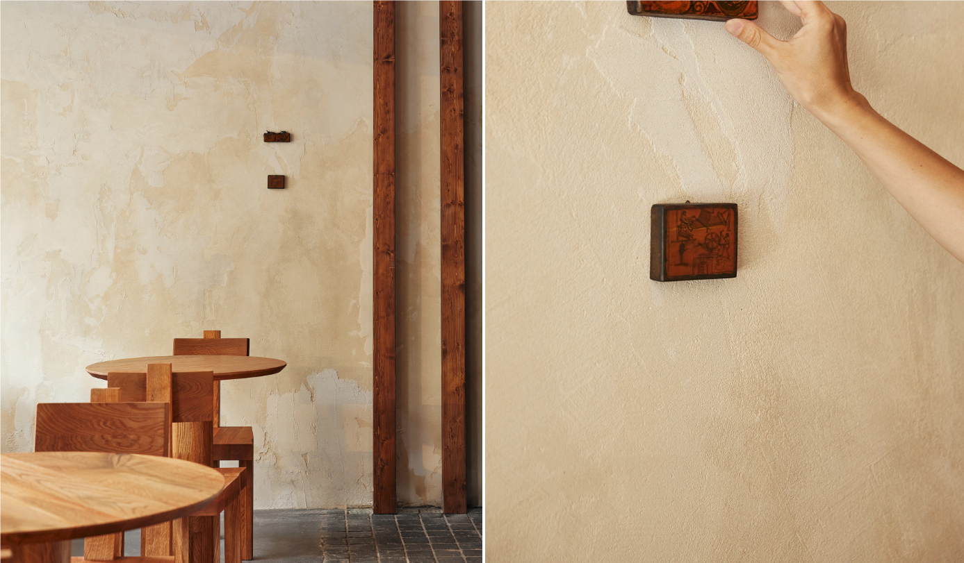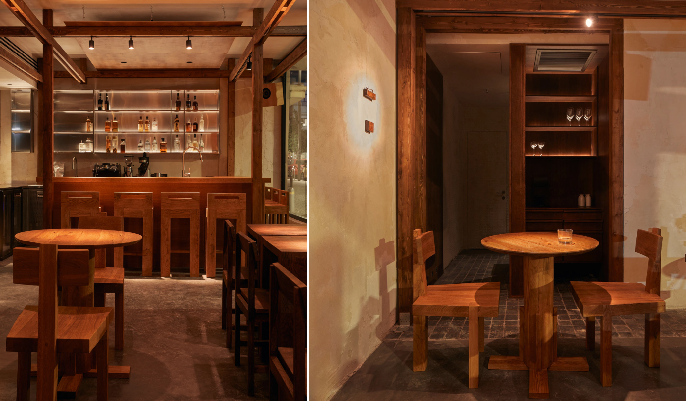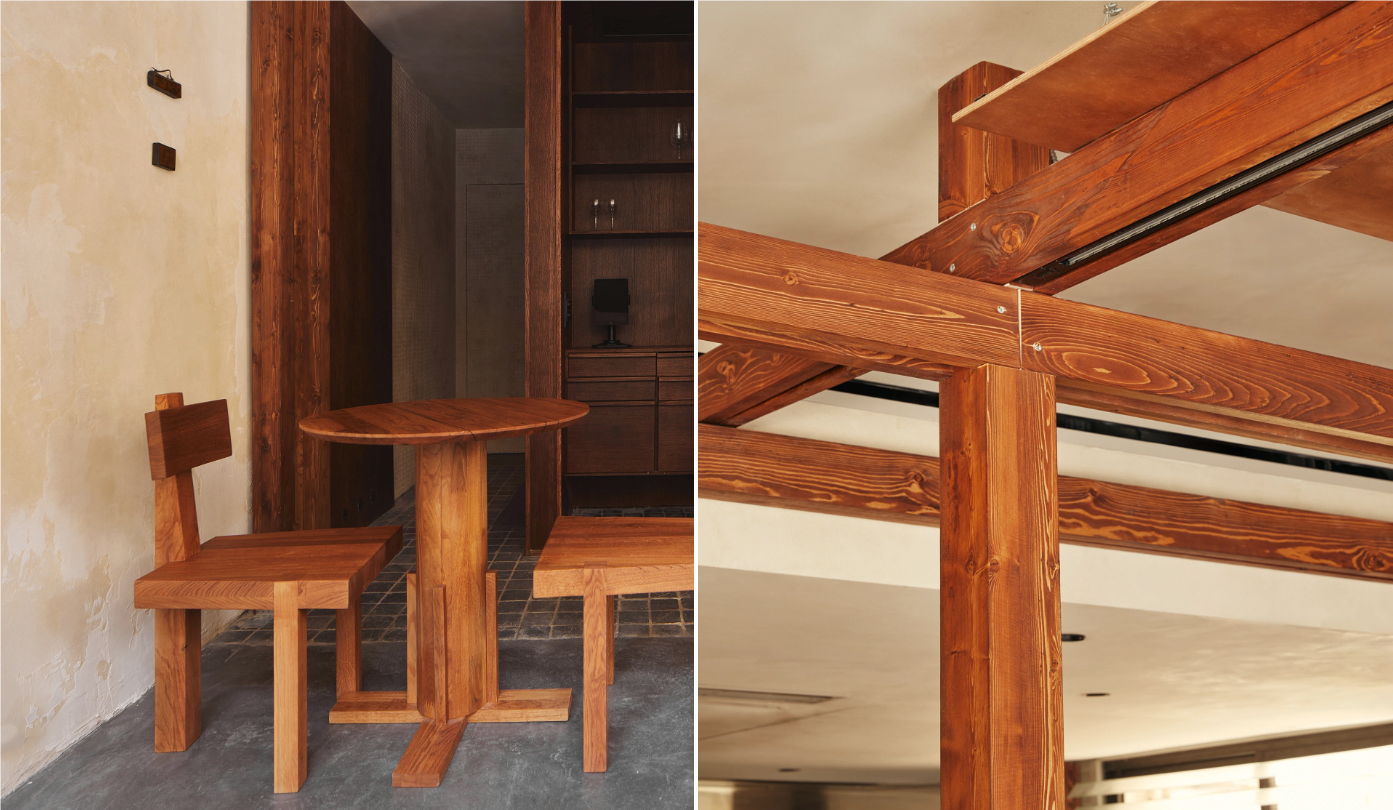 粗糙带斑驳的墙面没刷满漆,裸露出的原木梁柱直接当装饰,连桌子都是整块实木的憨拙感 —— 水泥地的冷和木色的暖撞得刚好,连墙上的小方饰都轻轻巧巧贴着,没有一点多余的花哨,坐下来连呼吸都慢了半拍。