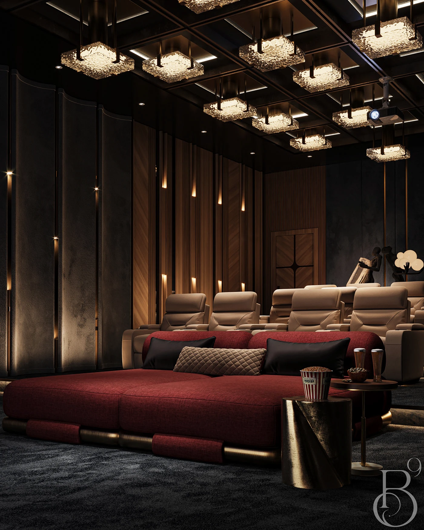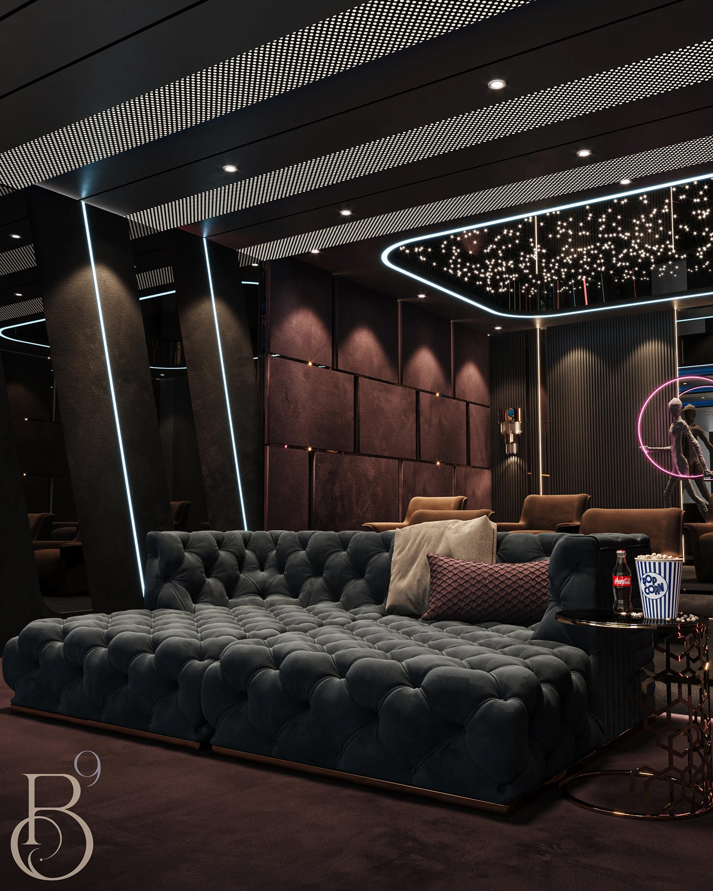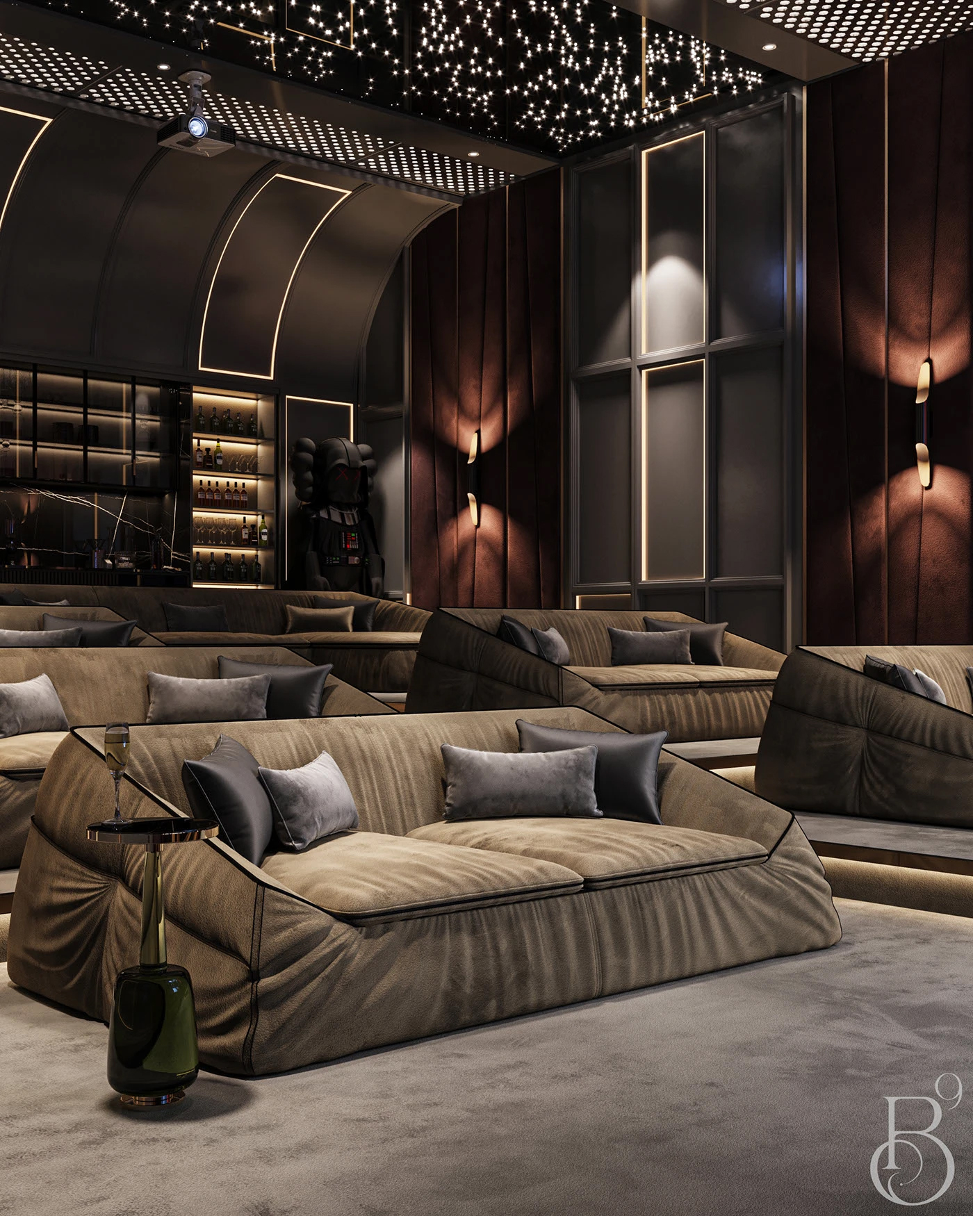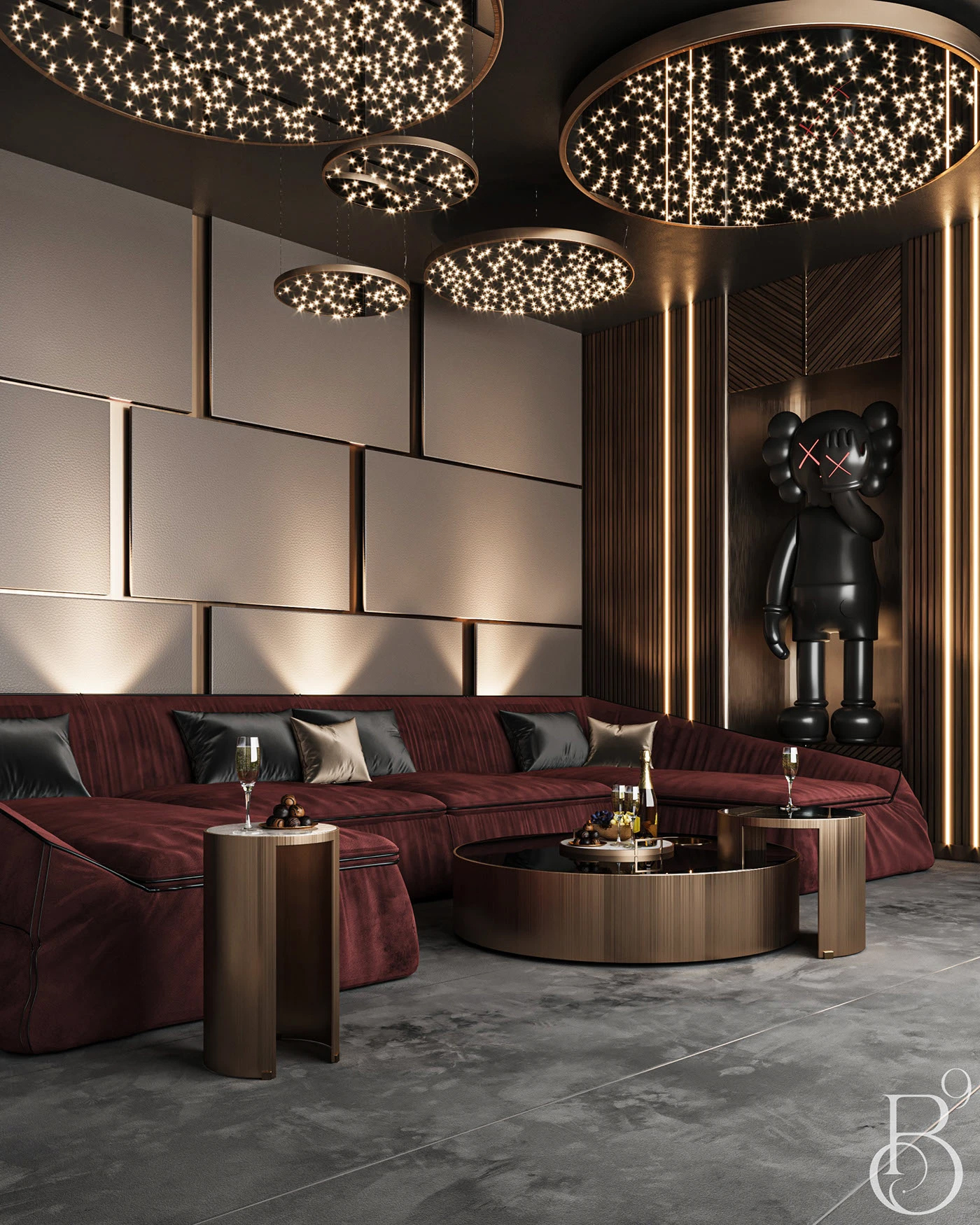 这风格是现代奢华混着潮流艺术的调调:酒红 / 深棕丝绒沙发裹满柔润质感,金属线条 + 嵌入式灯光悄悄勾出高级轮廓,星空顶、潮玩摆件又掺了点个性潮味 —— 完全跳出 “刻板影音空间” 的框架,更像能沉浸式放松的轻奢私域。