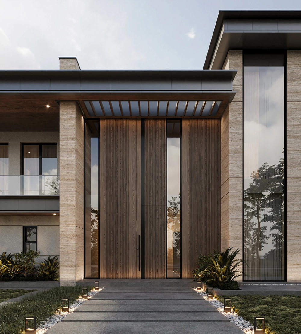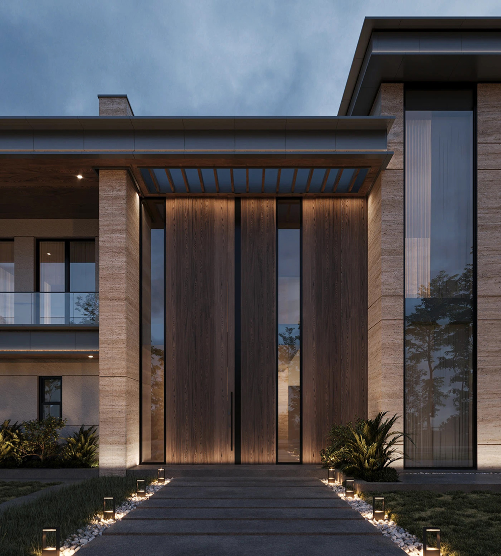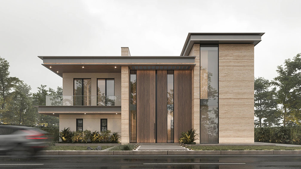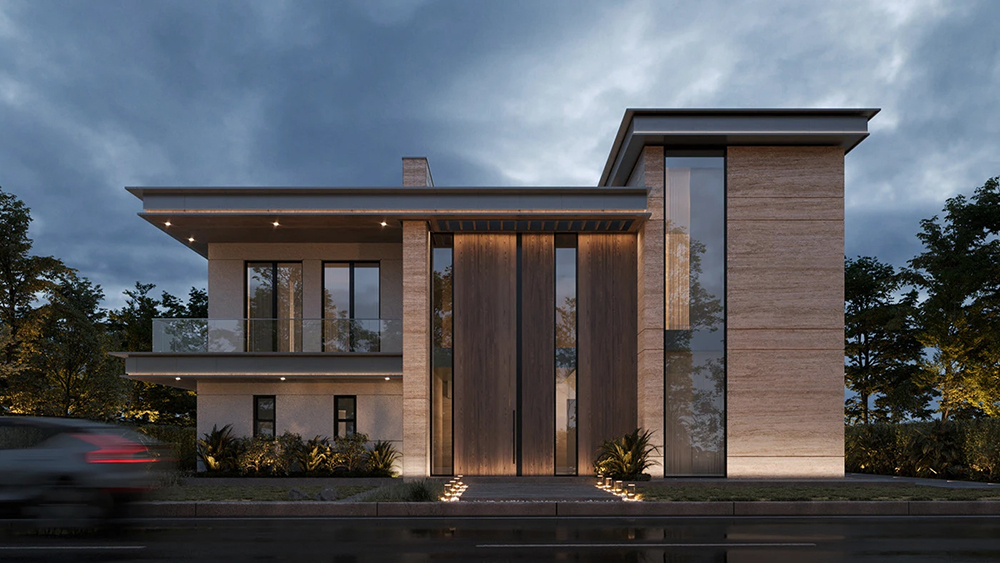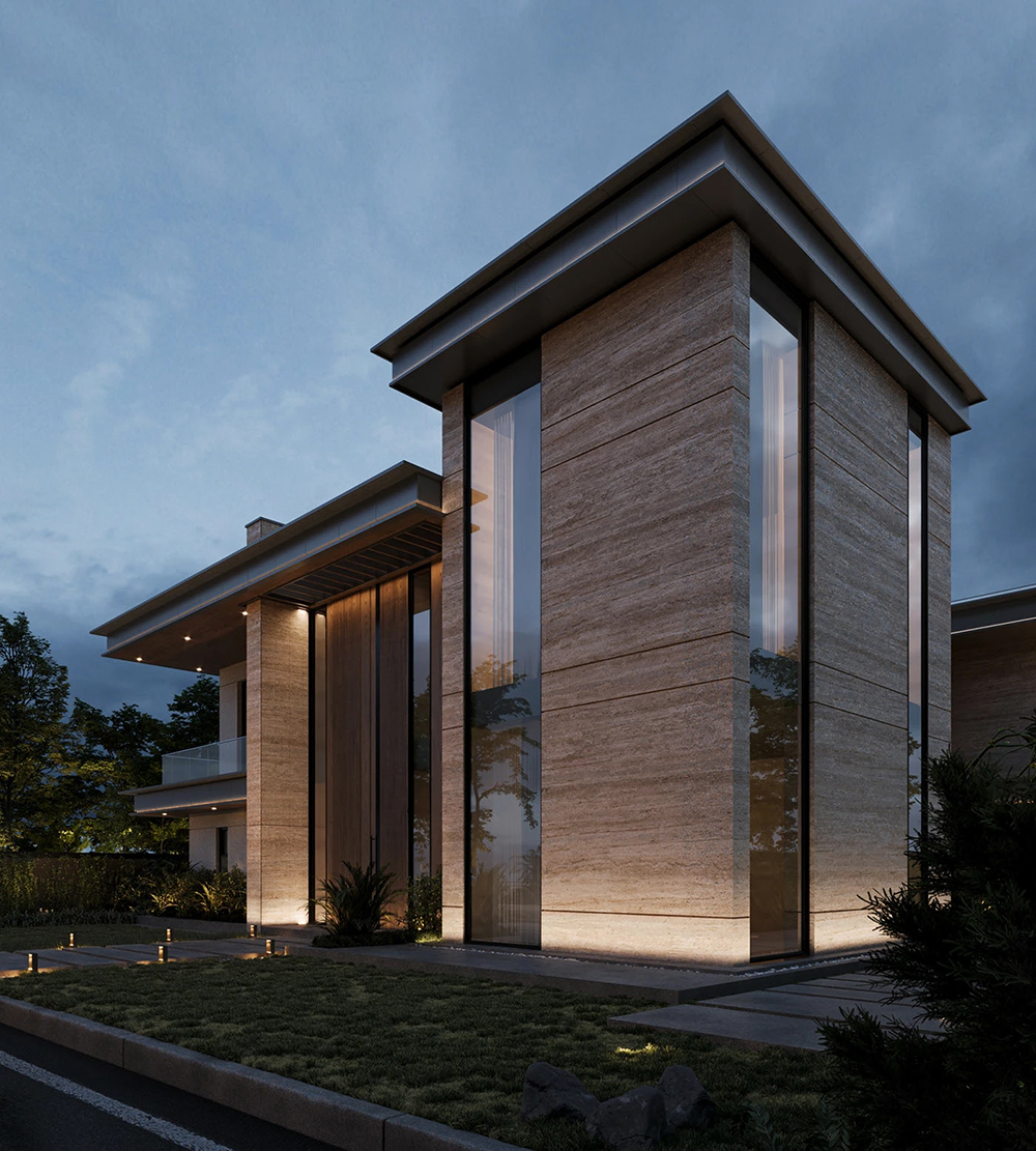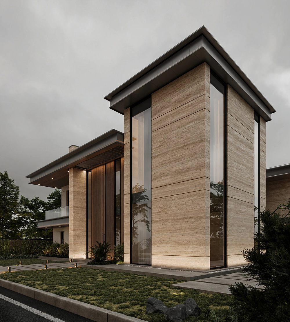风格是典型的现代轻奢风:利落的几何轮廓撑满高级感,石材立面的沉稳、大面积玻璃的通透,再掺点木质的暖调,材质碰撞得刚好 —— 不冷硬,也不拖沓,高级感里裹着生活温度。