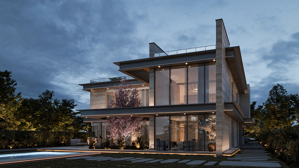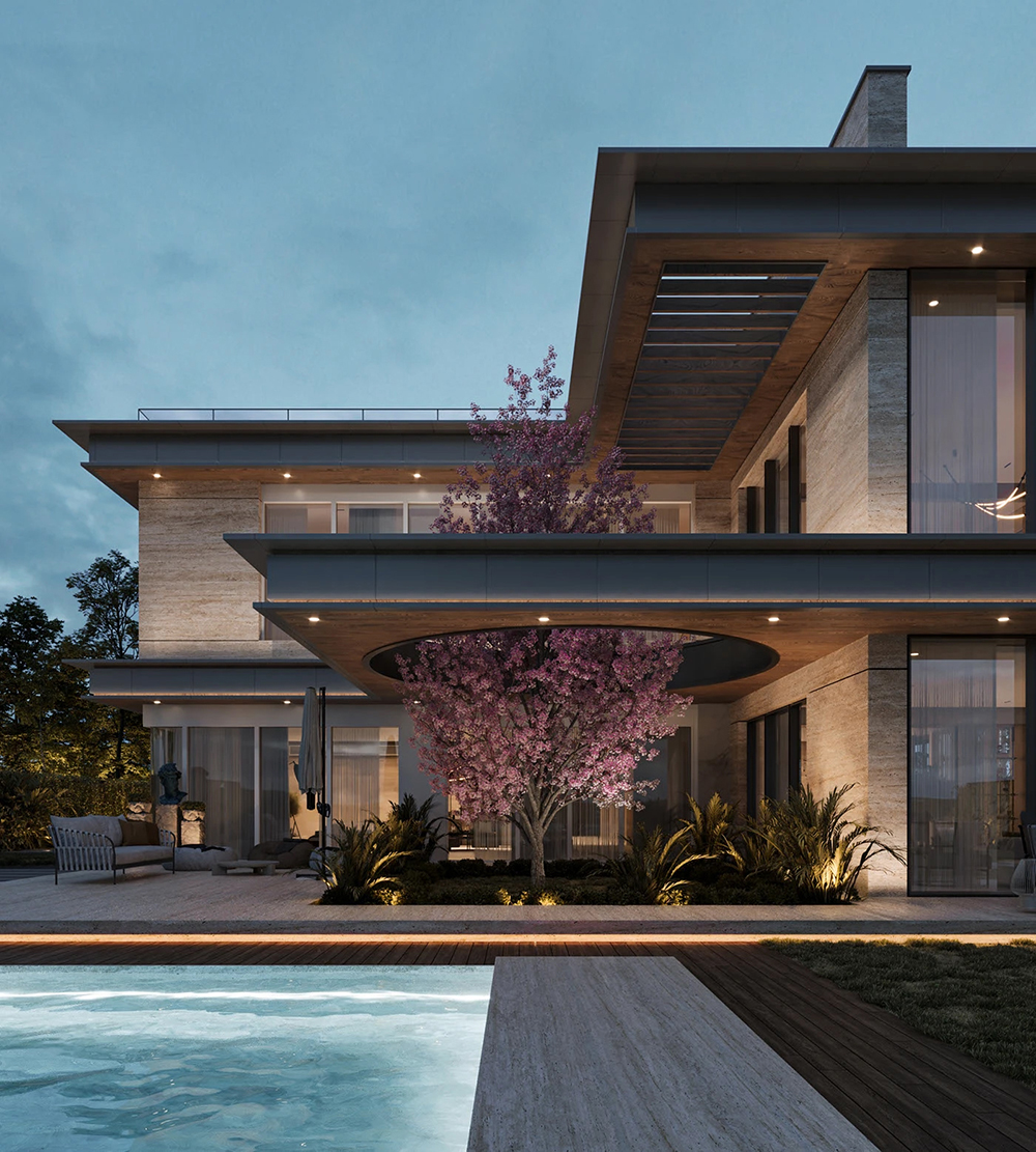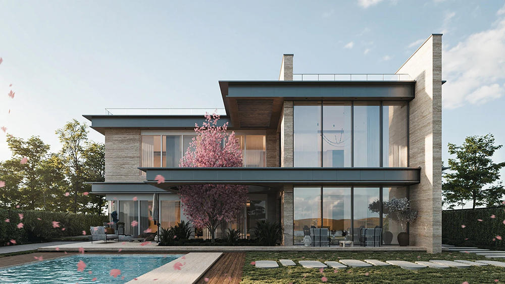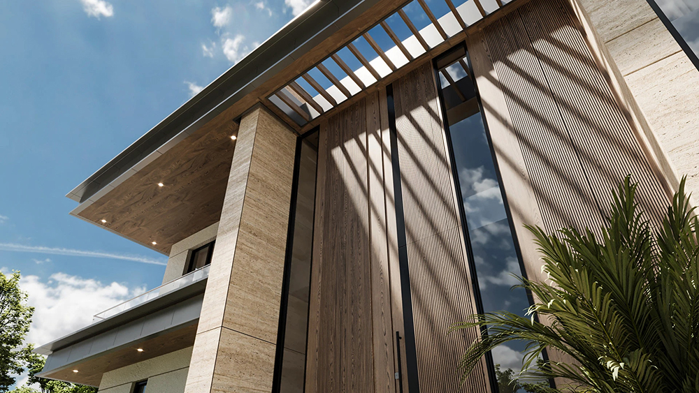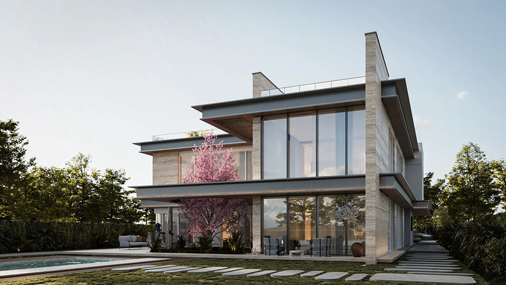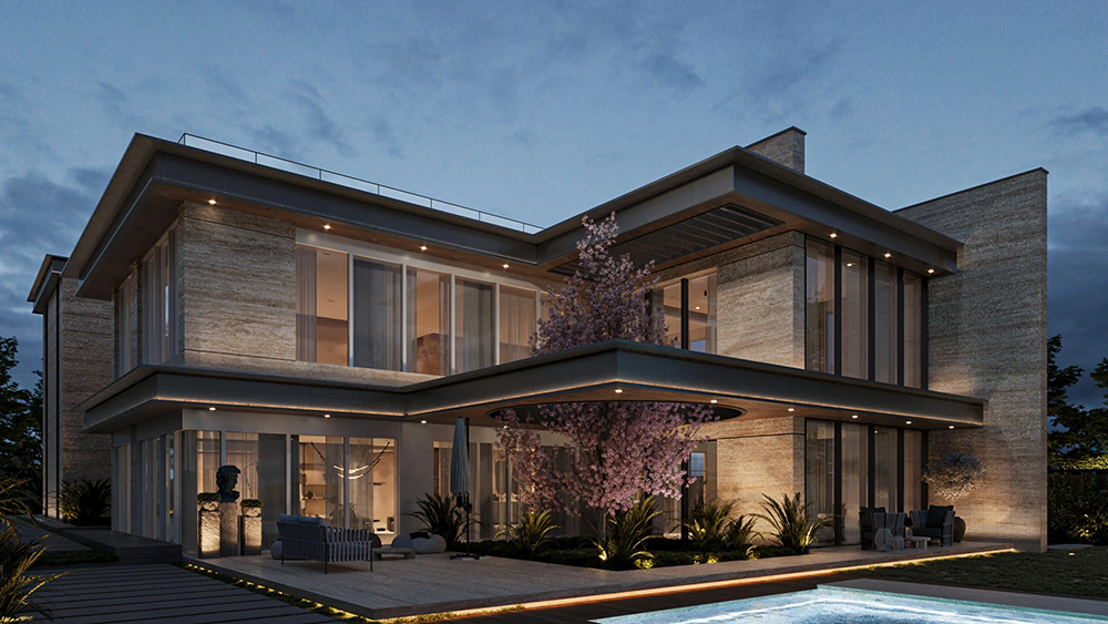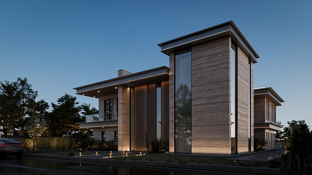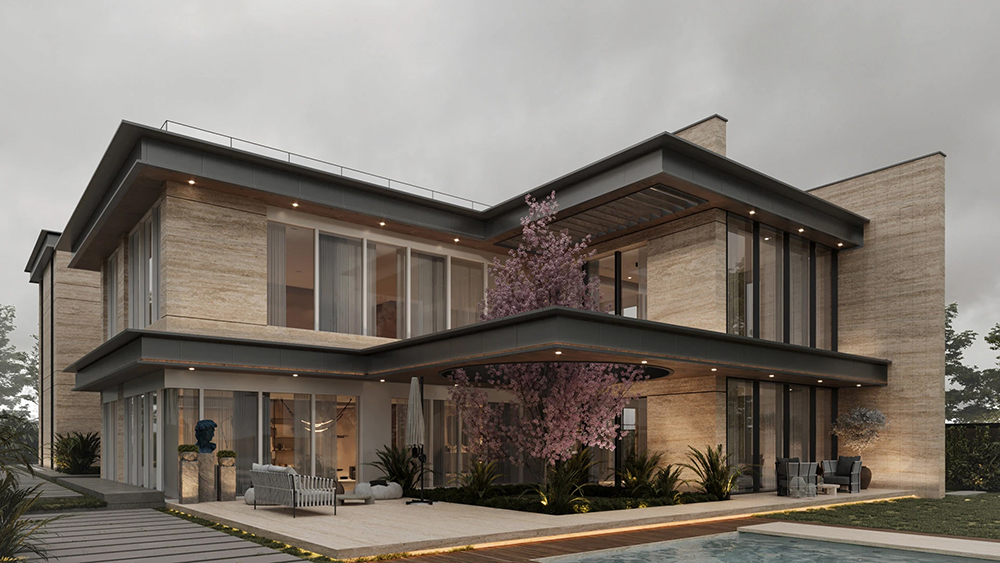 风格是典型的现代轻奢风:利落的几何轮廓撑满高级感,石材立面的沉稳、大面积玻璃的通透,再掺点木质的暖调,材质碰撞得刚好 —— 不冷硬,也不拖沓,高级感里裹着生活温度。