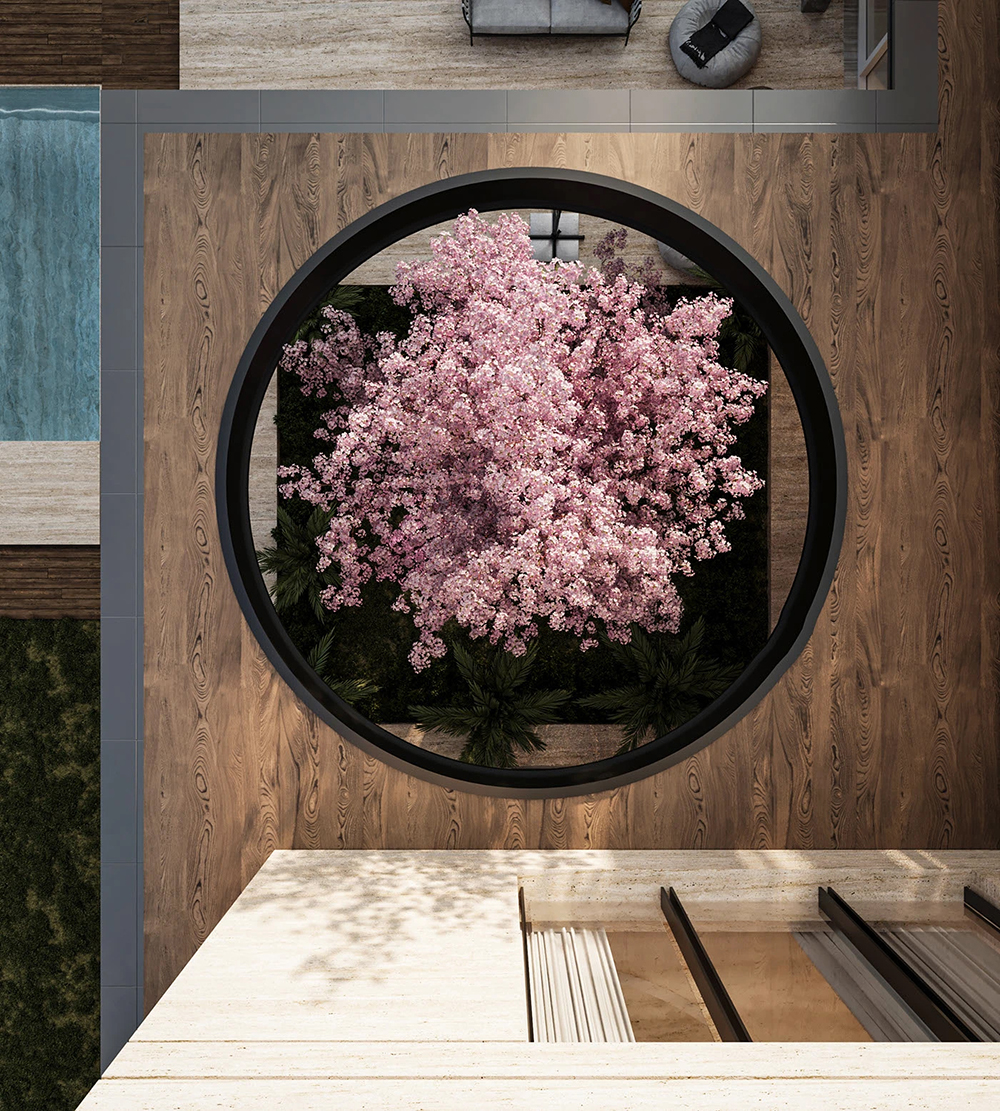 最戳人的是它的 “共生感”:庭院樱花树嵌在建筑层次里,大玻璃把泳池、绿植全揽进室内视野;白天是自然光裹着自然景,夜晚嵌入式灯光一暖,建筑又成了庭院里的温柔光源。