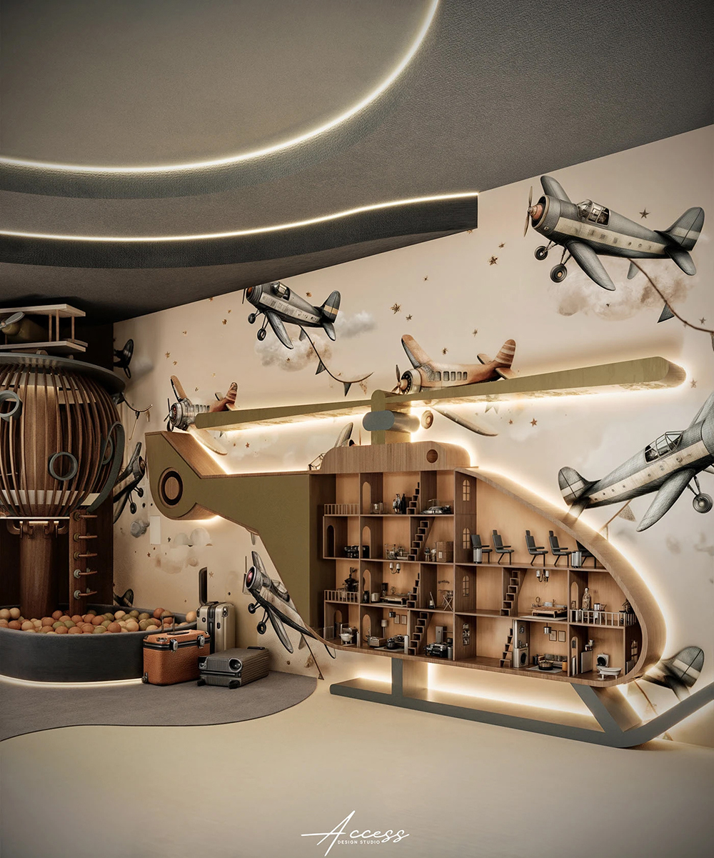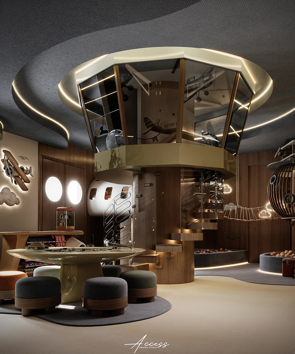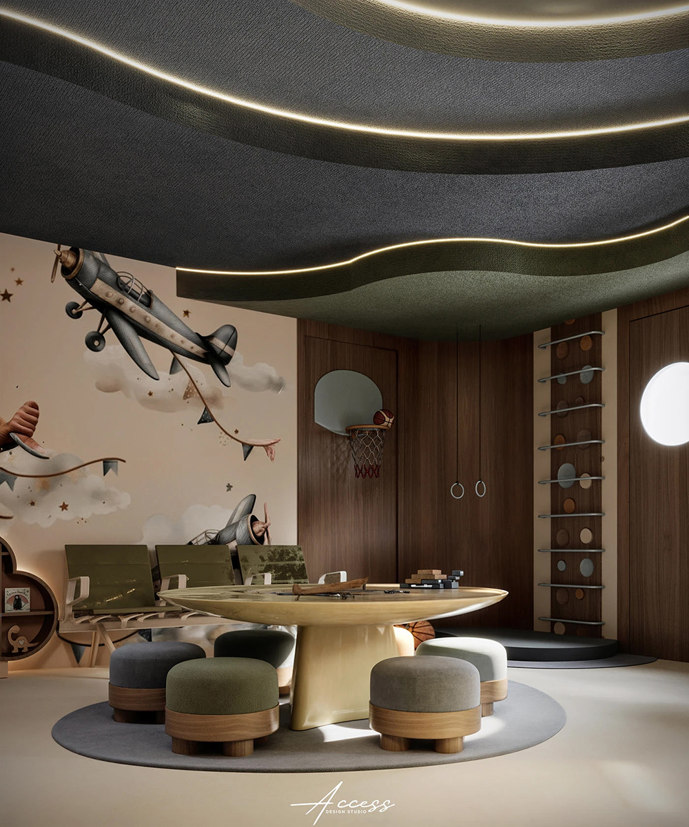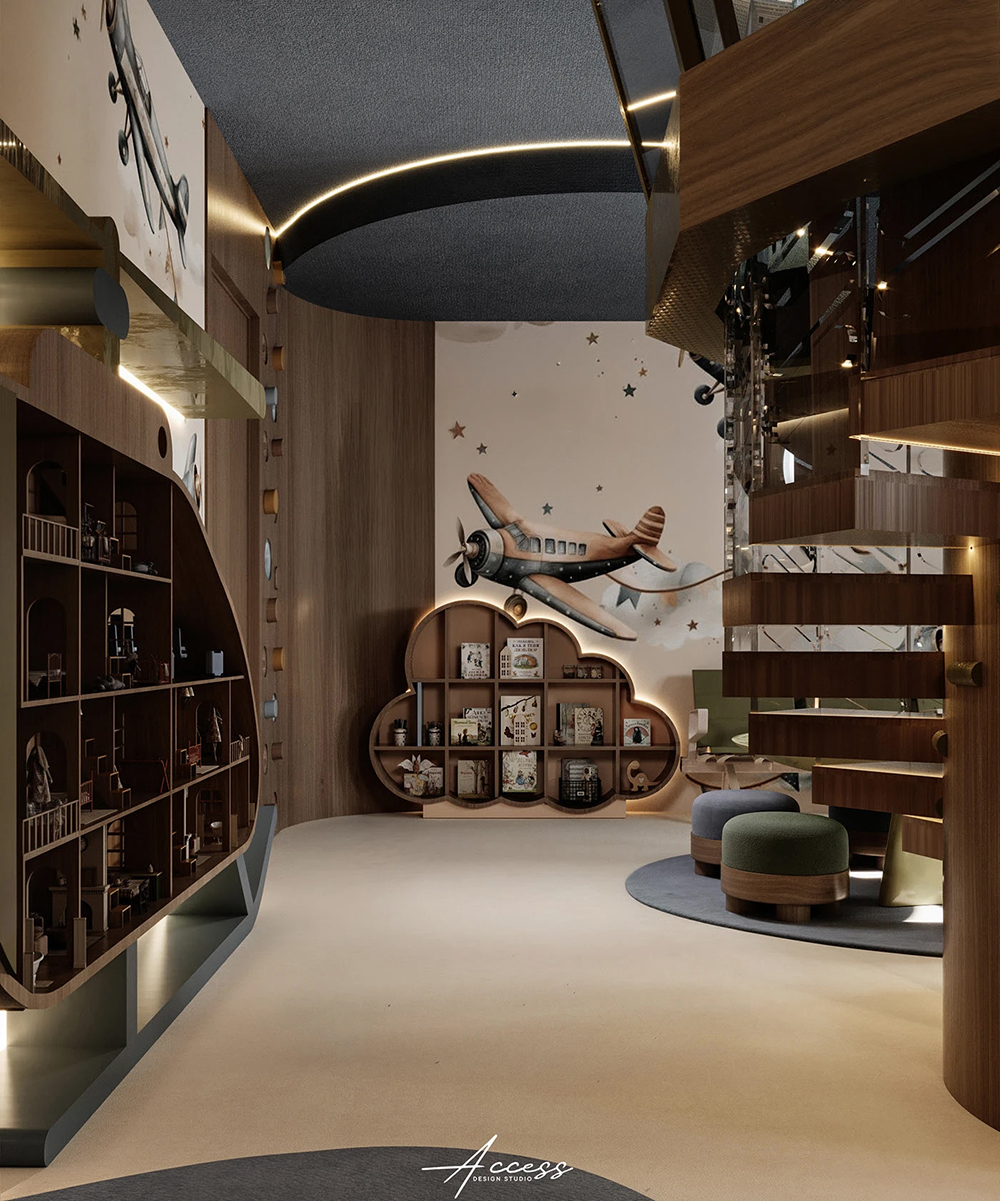 风格是 “轻奢童趣风”:胡桃木 + 莫兰迪色调撑住质感,飞机、机舱、云朵灯这些元素不搞廉价卡通,反而像把复古航空舱搬进了房间 —— 软包地面防磕碰,嵌入式暖光不刺眼,家长看了也会觉得 “这钱花得值”。