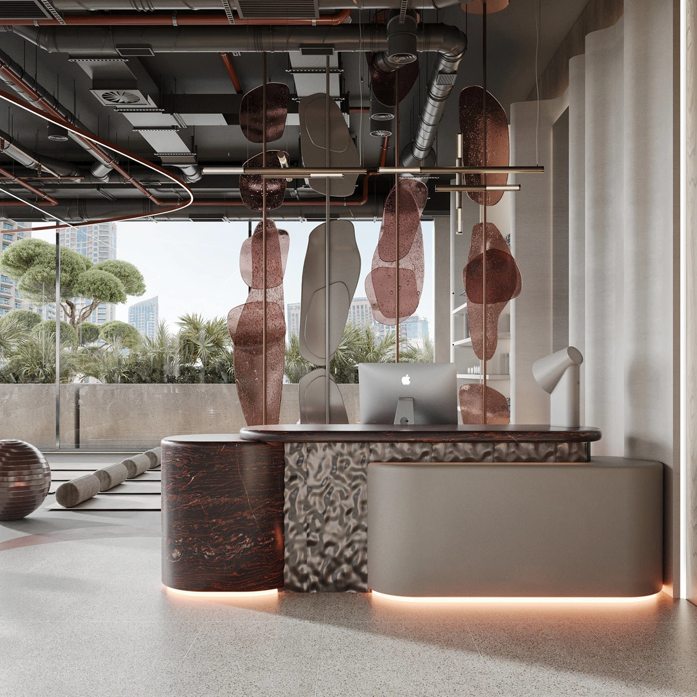 这是工业轻奢艺术风:把工业风的粗粝(裸露管道、水泥地面),和轻奢艺术感(曲线灯光、金属艺术装置、大理石质感)揉在一起,酷得高级还不冰冷。