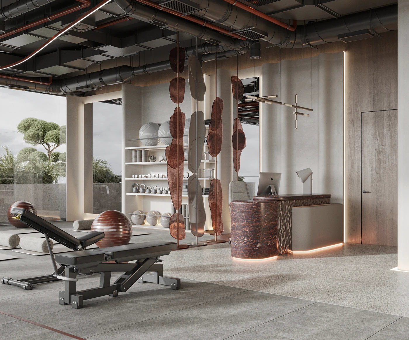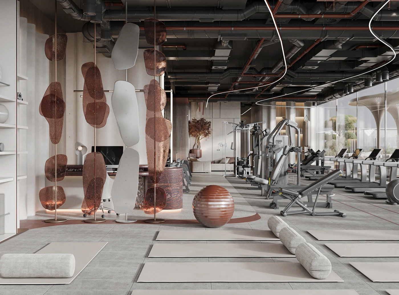 谁懂啊!这个健身房直接把工业风焊上了艺术滤镜 —— 裸露的金属管道缠着凉光曲线,不规则的铜色艺术装置飘在半空,连健身器材都像精致摆件,运动都像在逛艺术展😭 待一天都不想走!