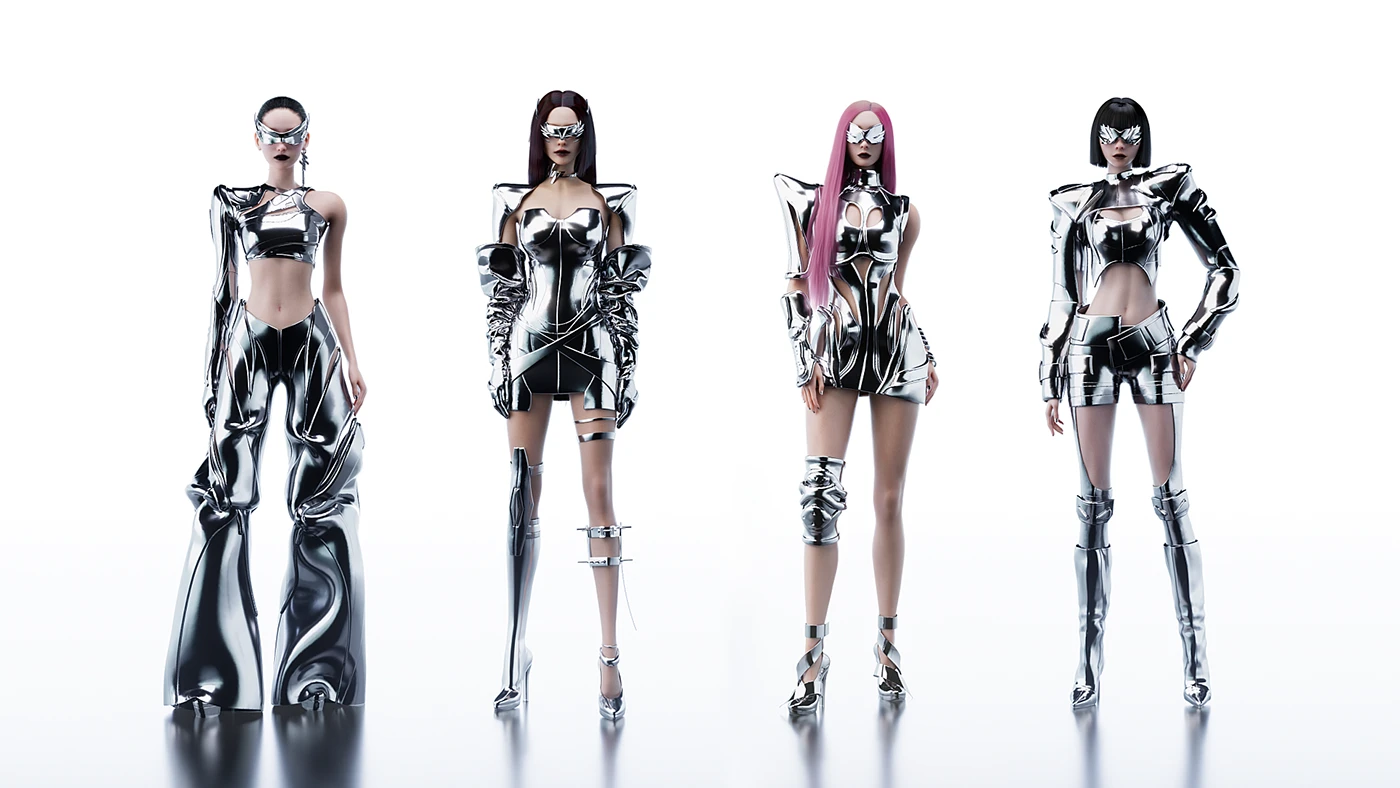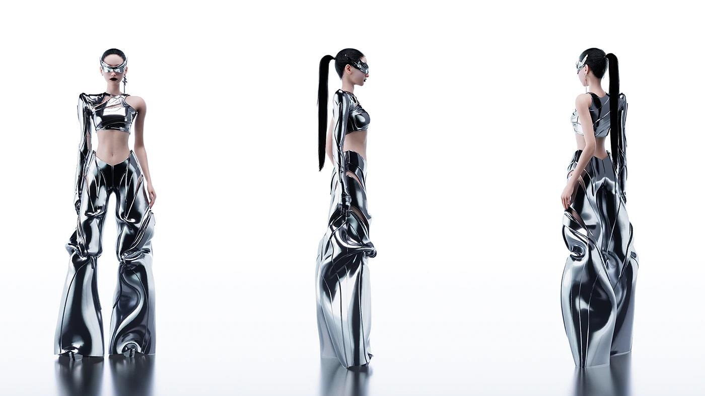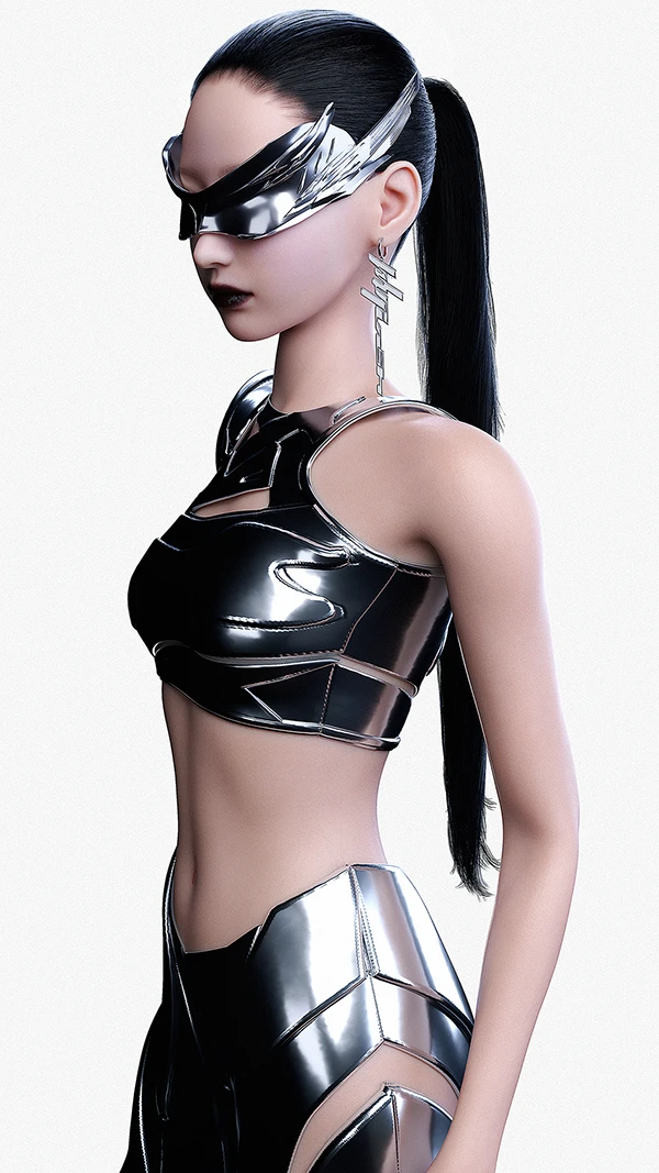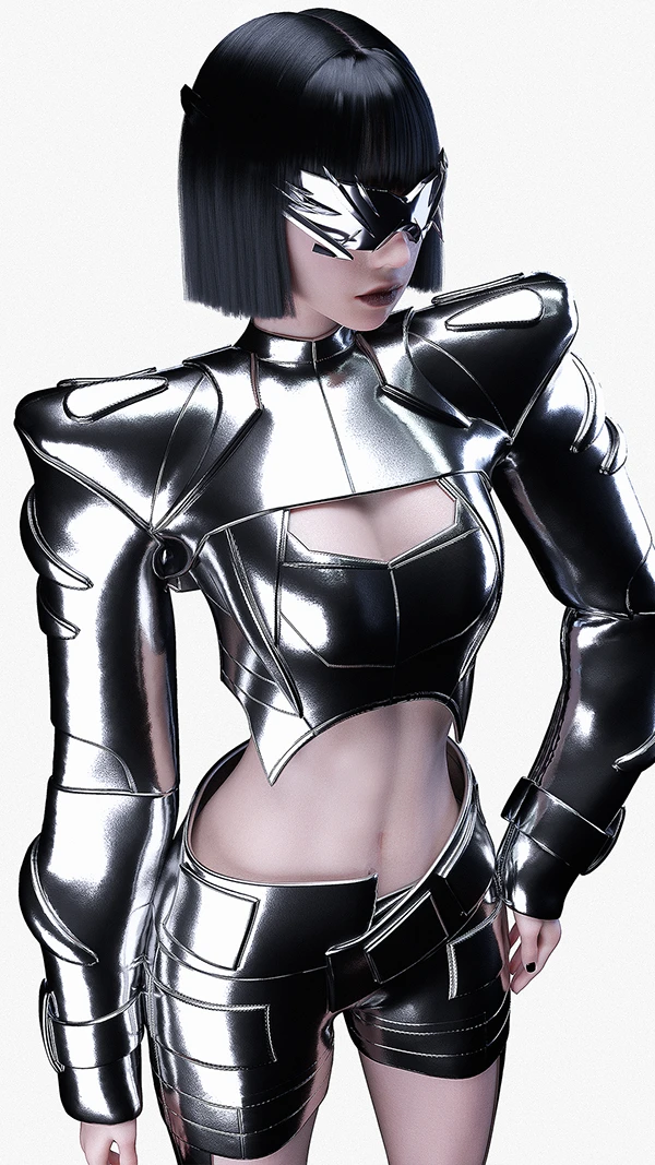 这是赛博机甲时尚风:把机甲的金属质感、棱角线条,和时尚的露肤剪裁、贴身版型揉在一起 —— 硬挺材质撑得起未来科技感,细节处的露肤又不让造型变笨重,每一套都踩在 “酷 + 美” 的精准平衡点上。